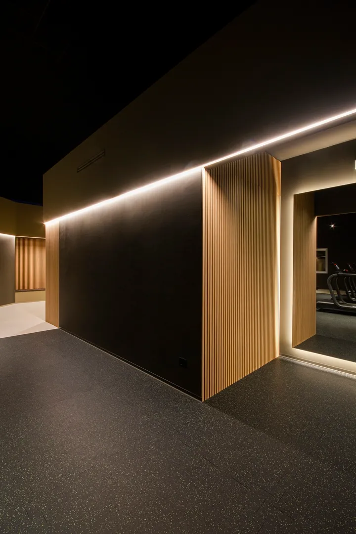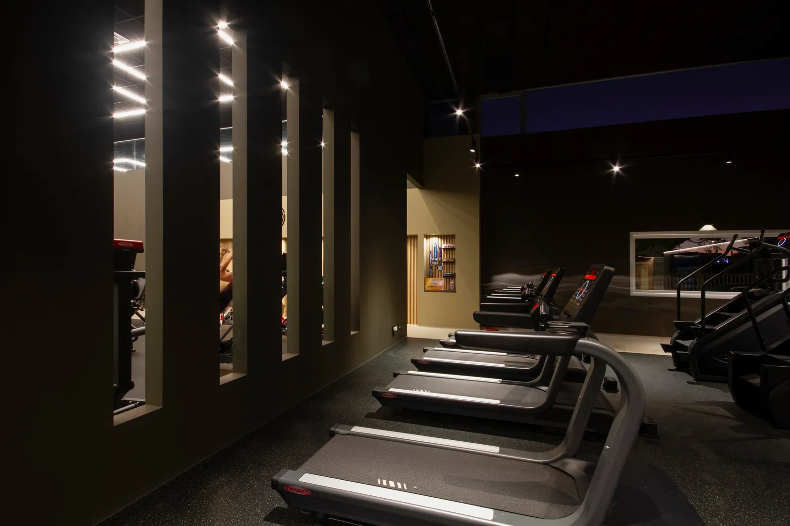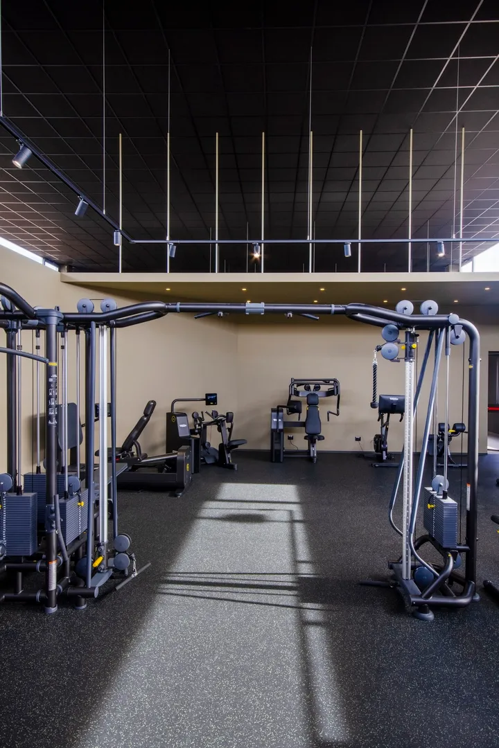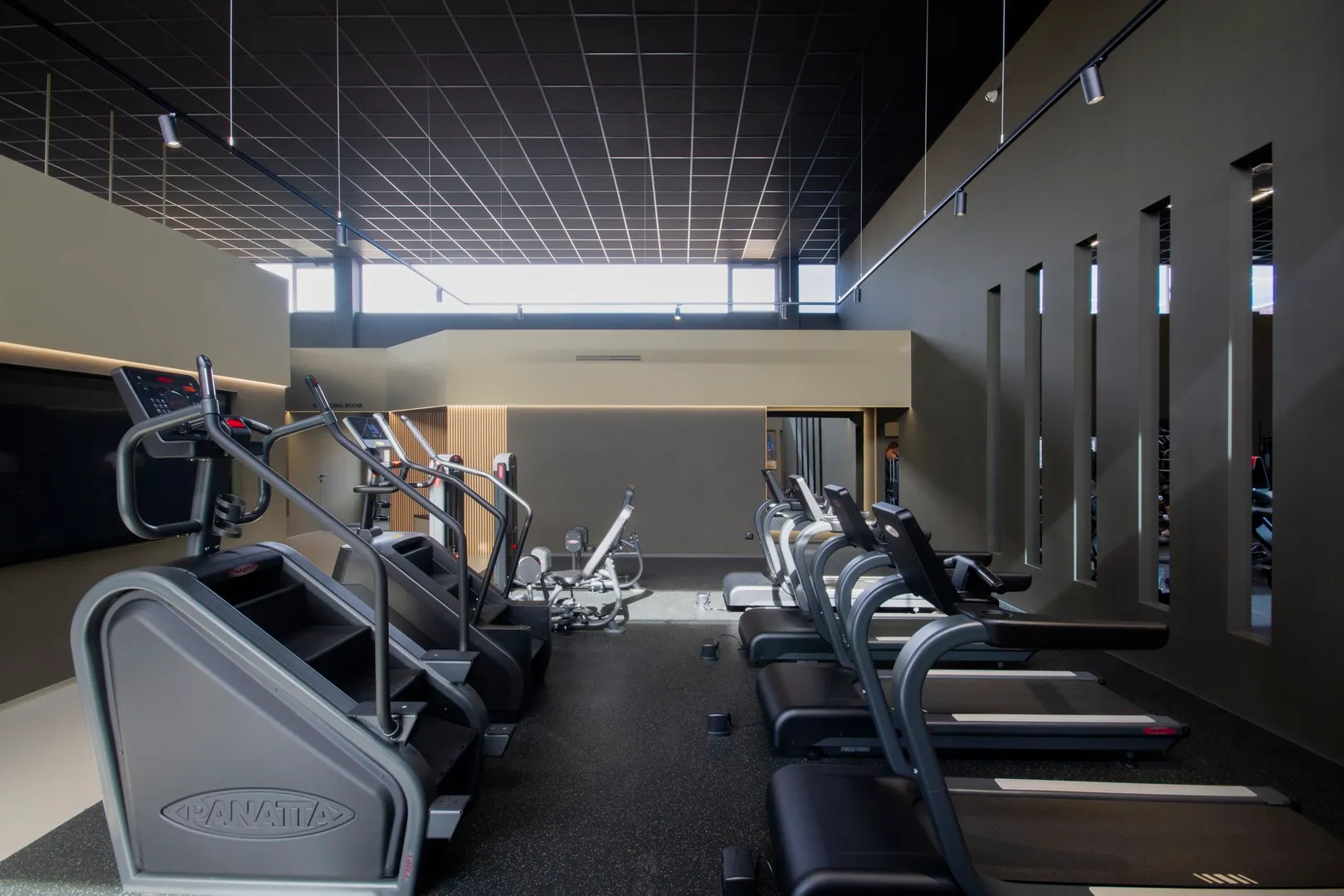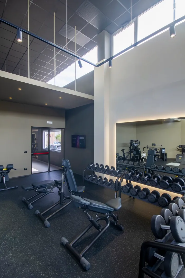 Il percorso che unisce le varie macro-aree è rifinito in resina ad alta resistenza colore “taupe chiaro”, unico materiale di pavimentazione diverso dal tappetino nero puntinato in TPE che è invece utilizzato per l’intera estensione della palestra.