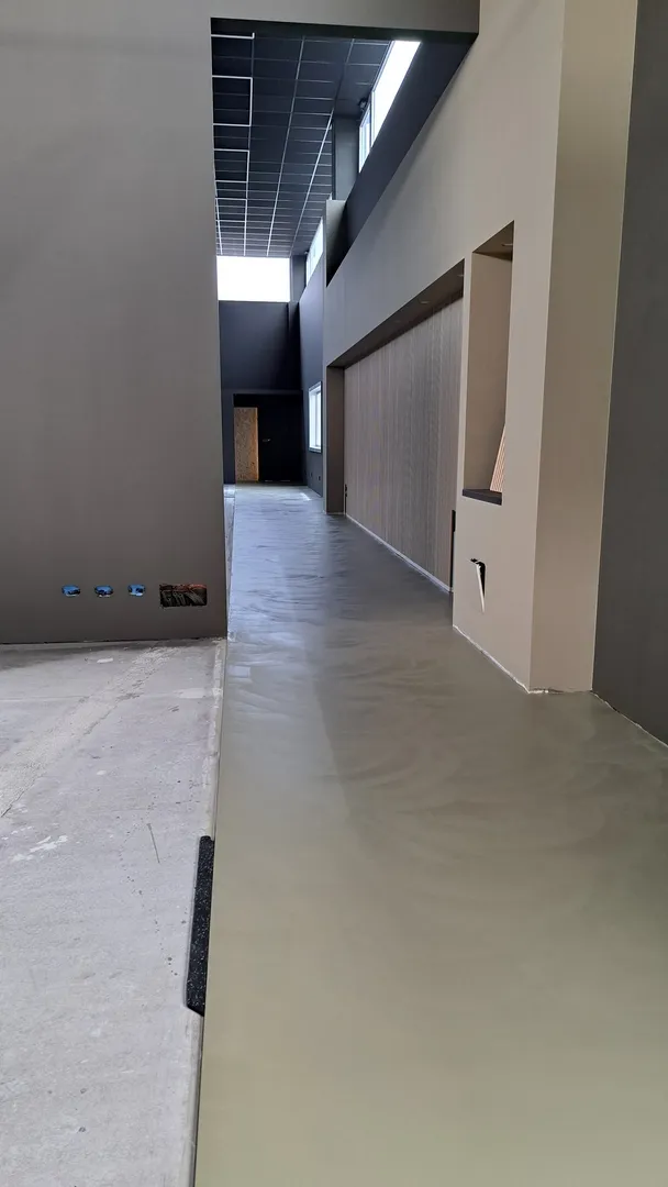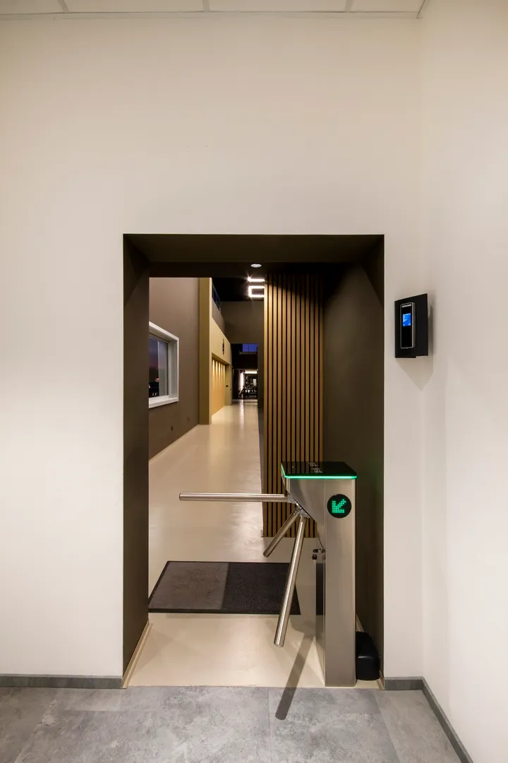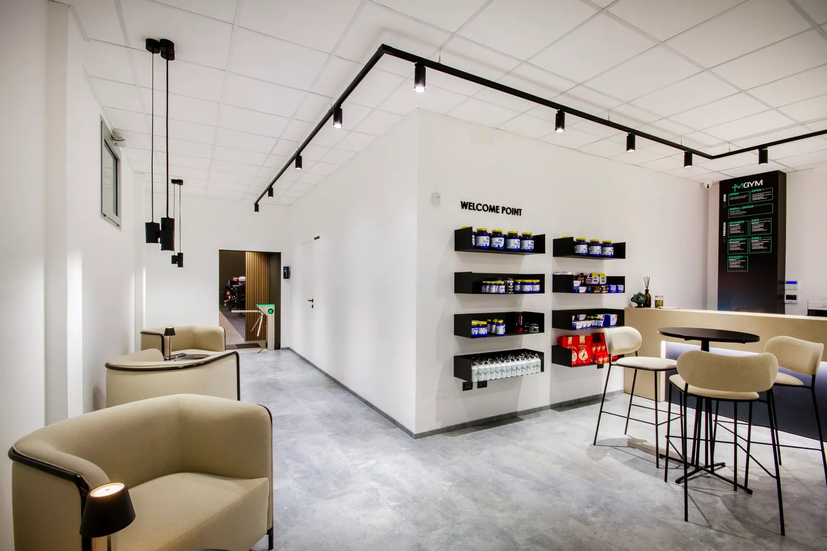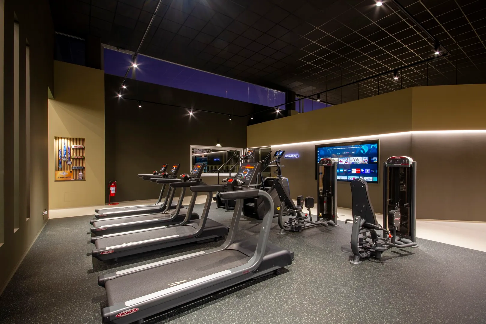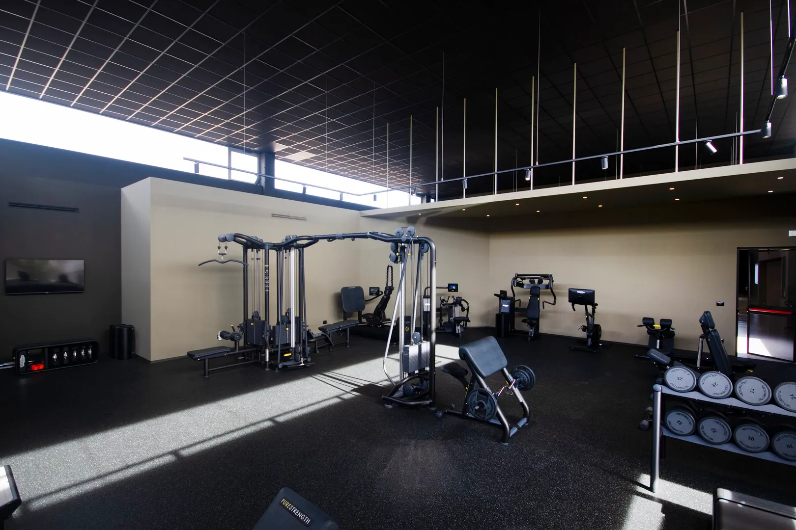 Il percorso che unisce le varie macro-aree è rifinito in resina ad alta resistenza colore “taupe chiaro”, unico materiale di pavimentazione diverso dal tappetino nero puntinato in TPE che è invece utilizzato per l’intera estensione della palestra.