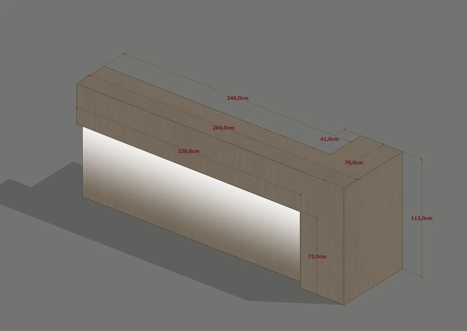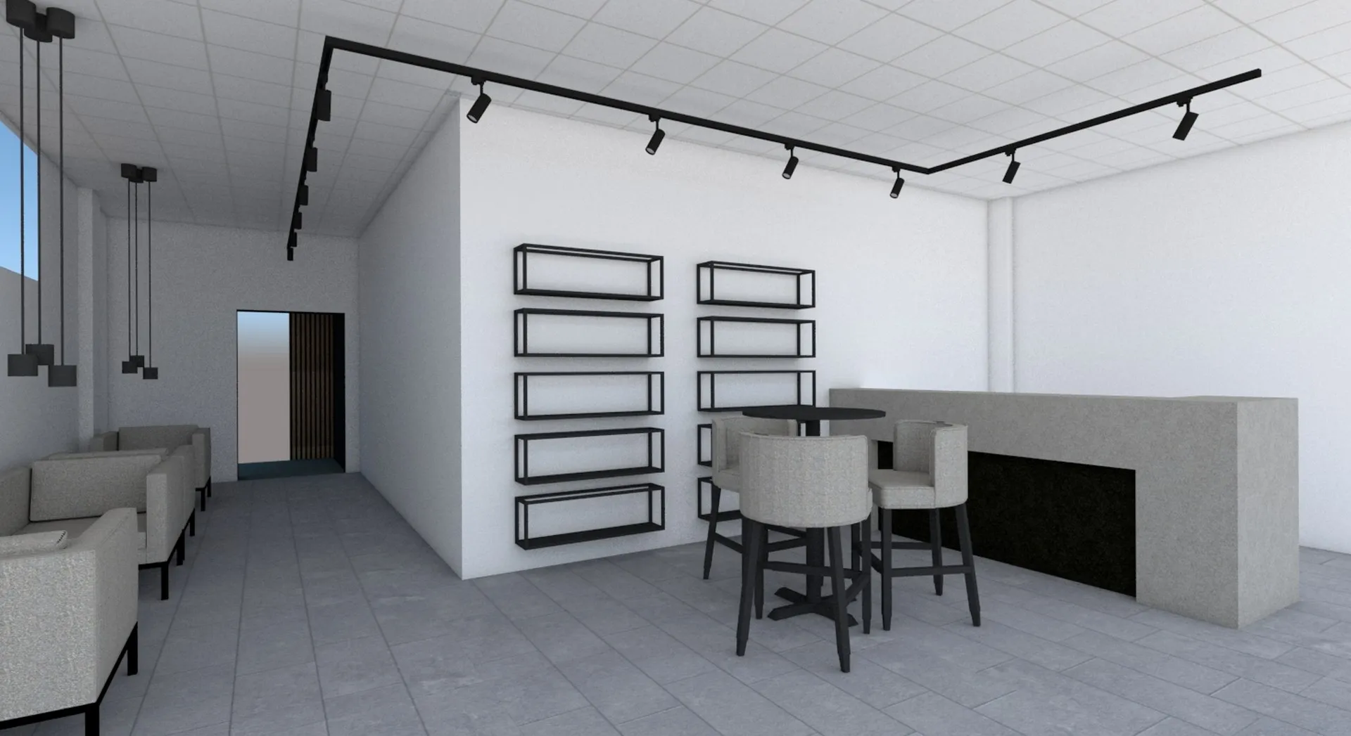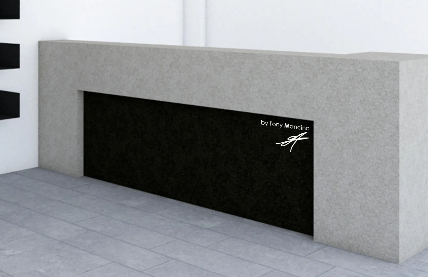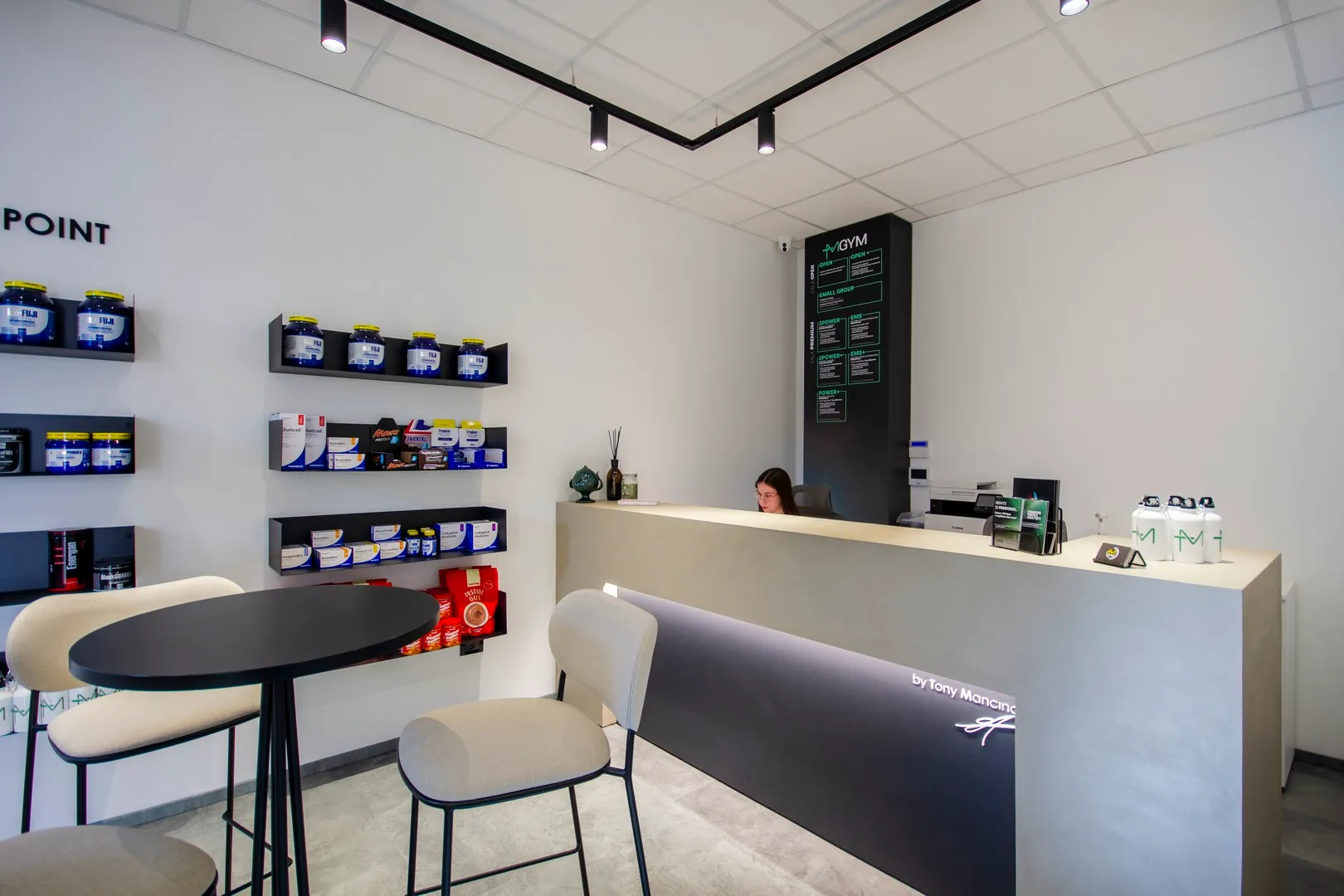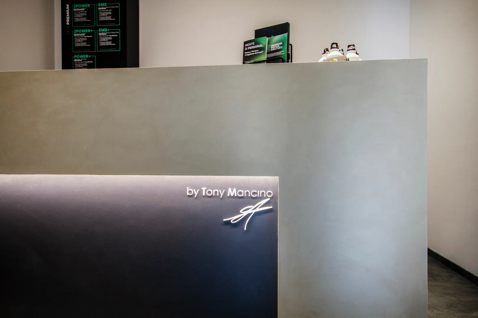 Il progetto dell’area “welcome point” è stato caratterizzato da una particolare complessità soprattutto derivante dalla esiguità dello spazio a disposizione, considerando che il bancone reception, oltre a dover assolvere la sua funzione di mobile contenitivo per gli archivi gestionali, costituisce anche il primo elemento visibile appena varcato l’ingresso; pertanto ho ipotizzato in un primo momento, così come richiesto dal cliente, di concepirlo con finitura legno rovere, integrandolo con i ripiani che sarebbero stati realizzati di lato; successivamente ho ideato un elemento più semplice, rivestito con resina colore taupe chiaro e moka nella porzione inferiore, illuminata con una lineare radente, dove ho posizionato la firma vettorializzata di Tony Mancino.
