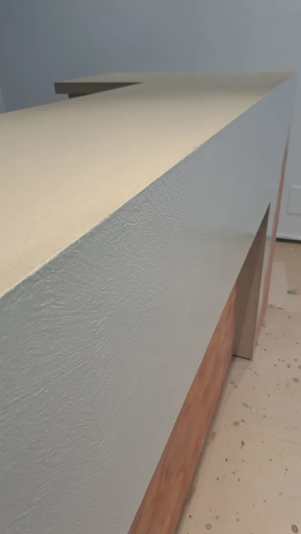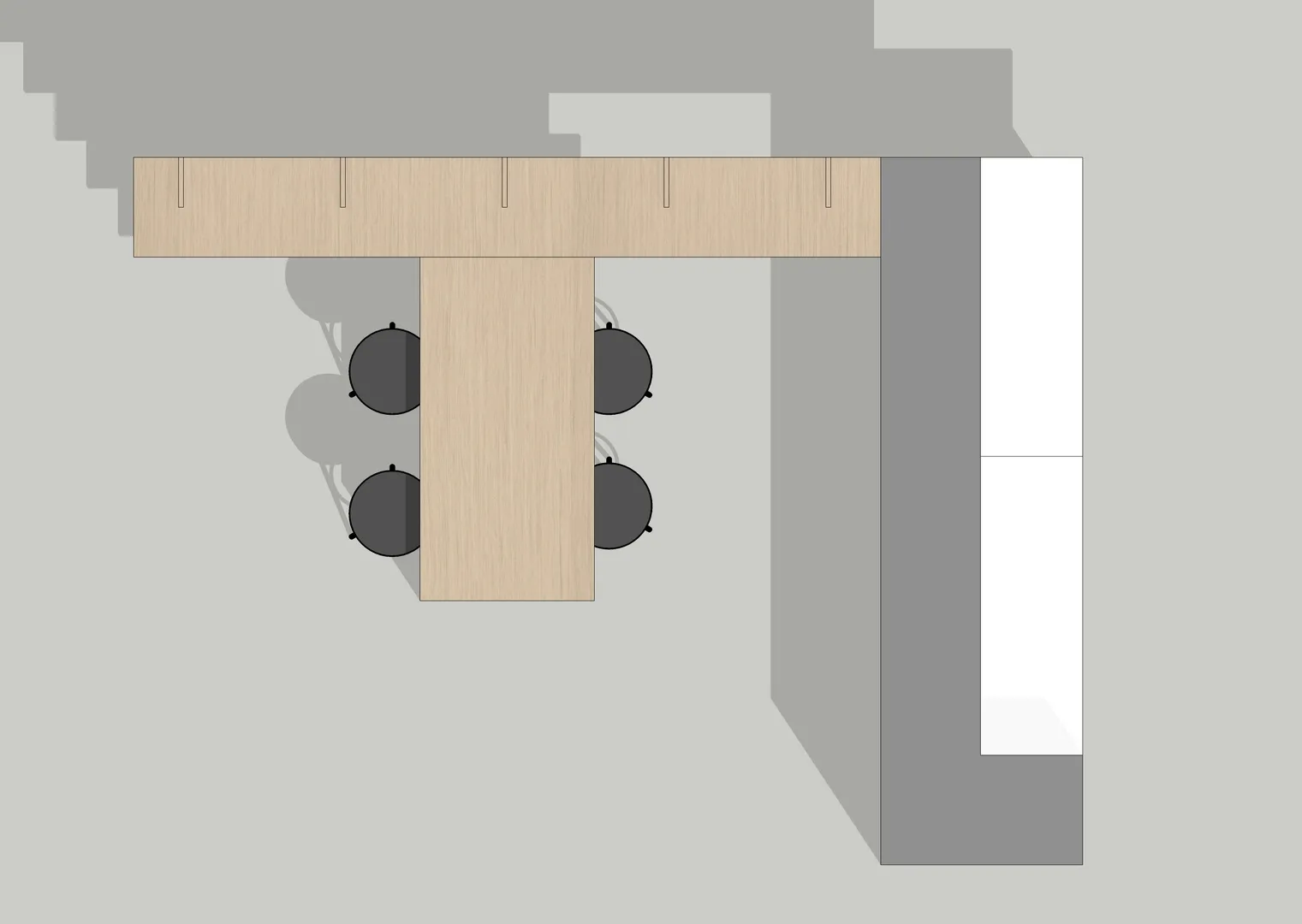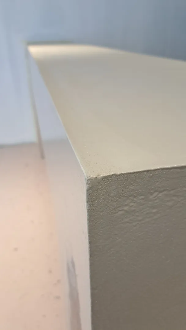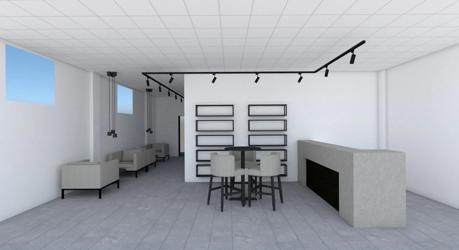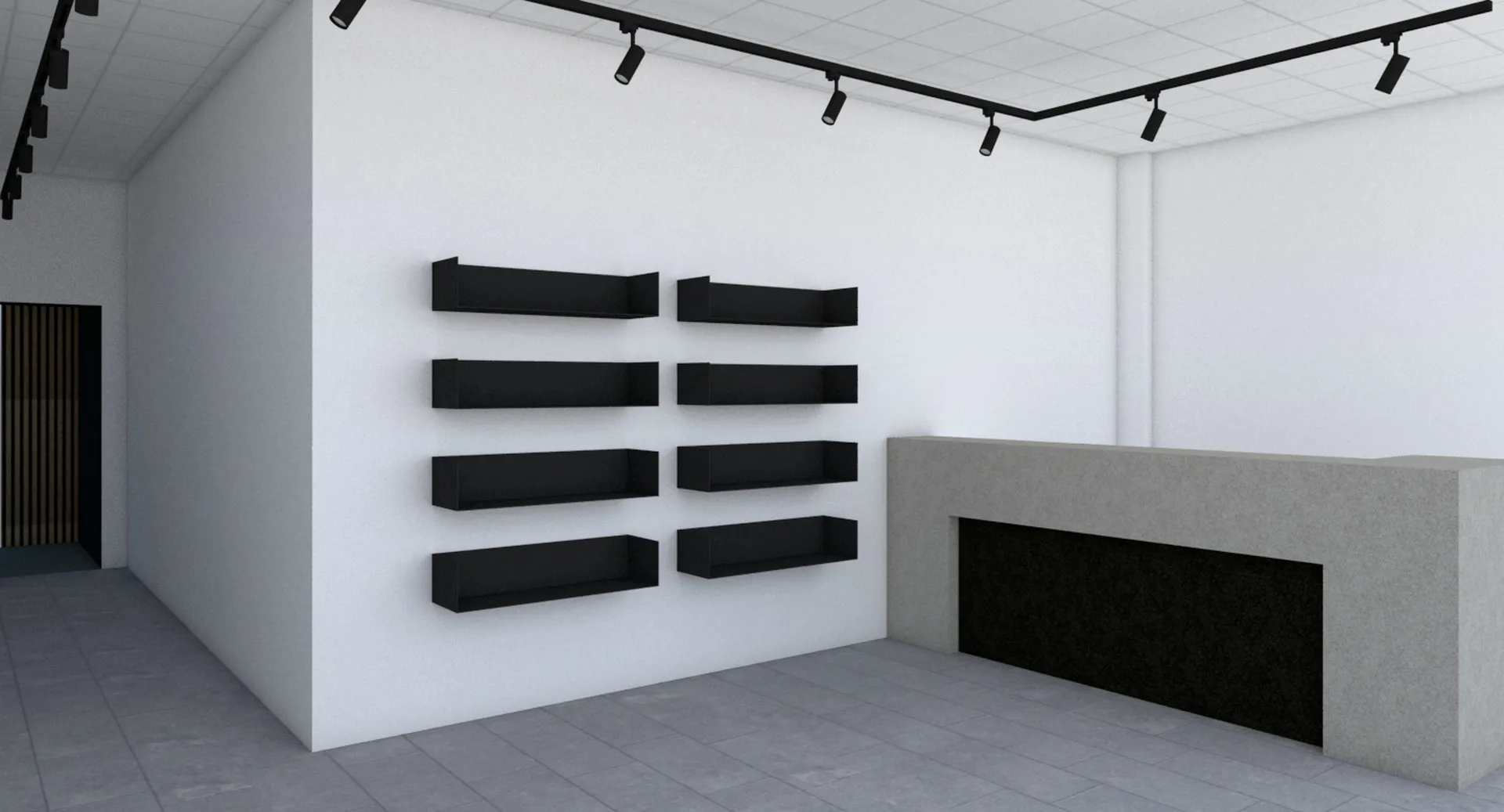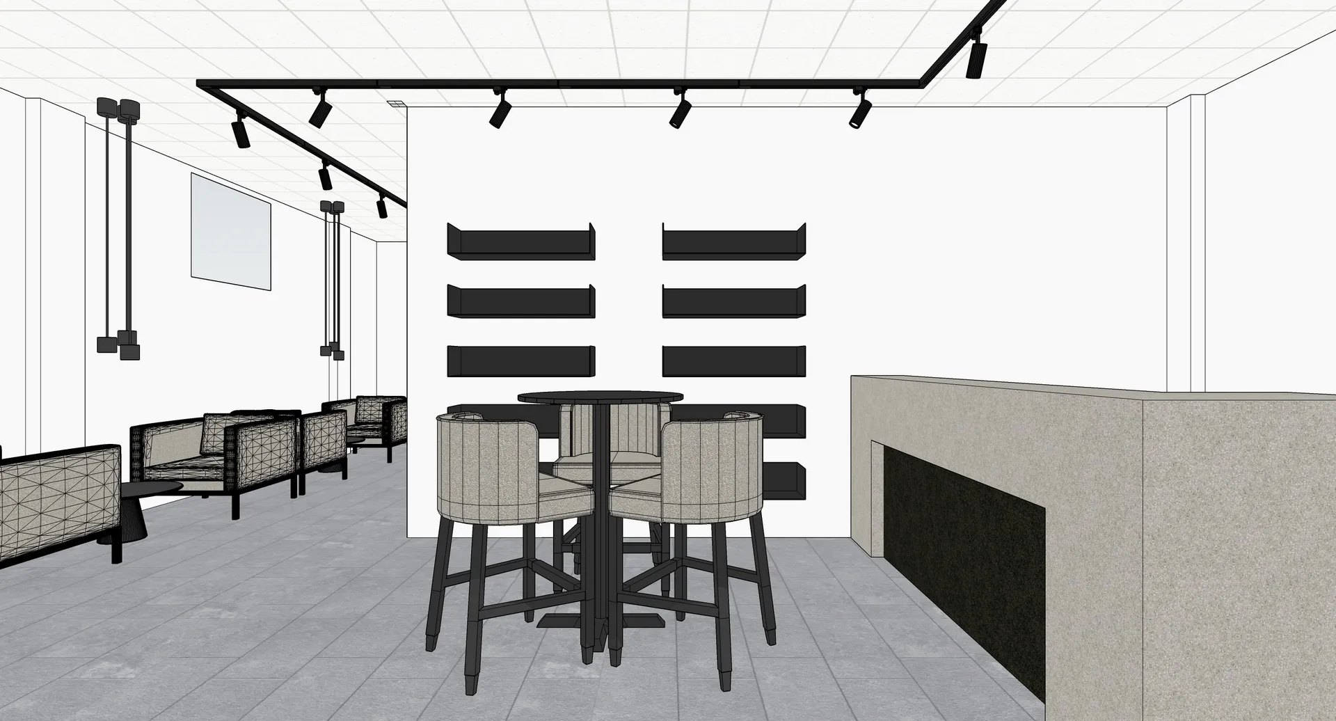 Il progetto dell’area “welcome point” è stato caratterizzato da una particolare complessità soprattutto derivante dalla esiguità dello spazio a disposizione, considerando che il bancone reception, oltre a dover assolvere la sua funzione di mobile contenitivo per gli archivi gestionali, costituisce anche il primo elemento visibile appena varcato l’ingresso; pertanto ho ipotizzato in un primo momento, così come richiesto dal cliente, di concepirlo con finitura legno rovere, integrandolo con i ripiani che sarebbero stati realizzati di lato; successivamente ho ideato un elemento più semplice, rivestito con resina colore taupe chiaro e moka nella porzione inferiore, illuminata con una lineare radente, dove ho posizionato la firma vettorializzata di Tony Mancino.