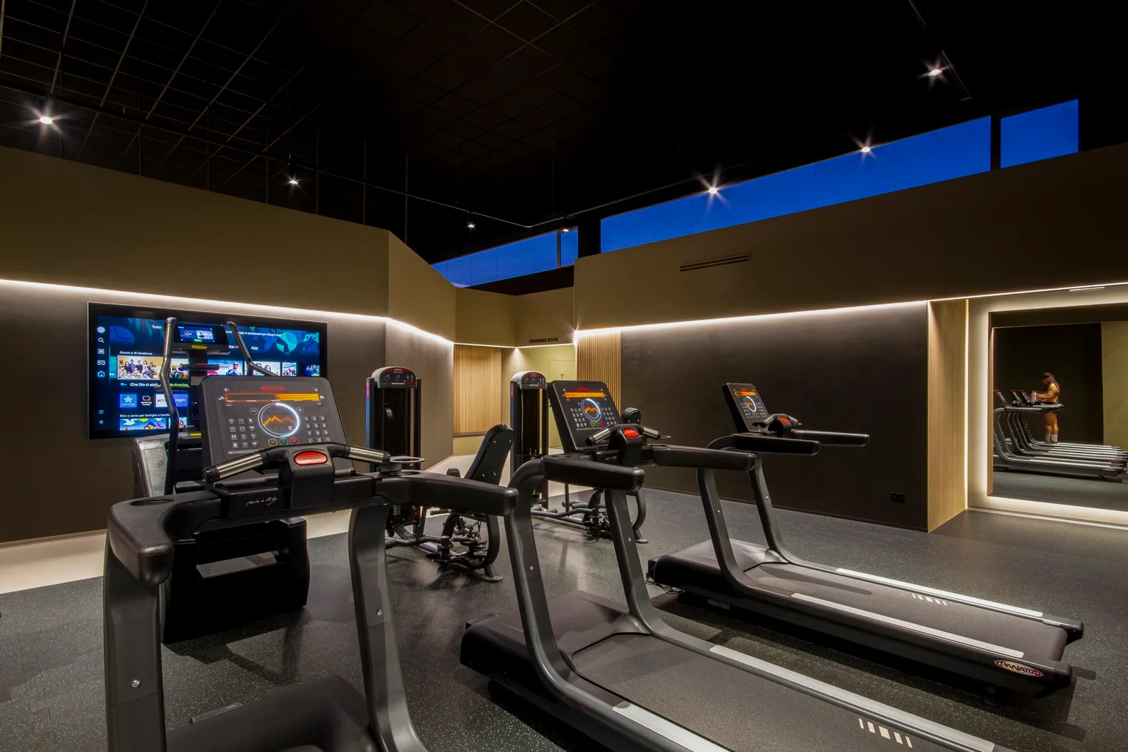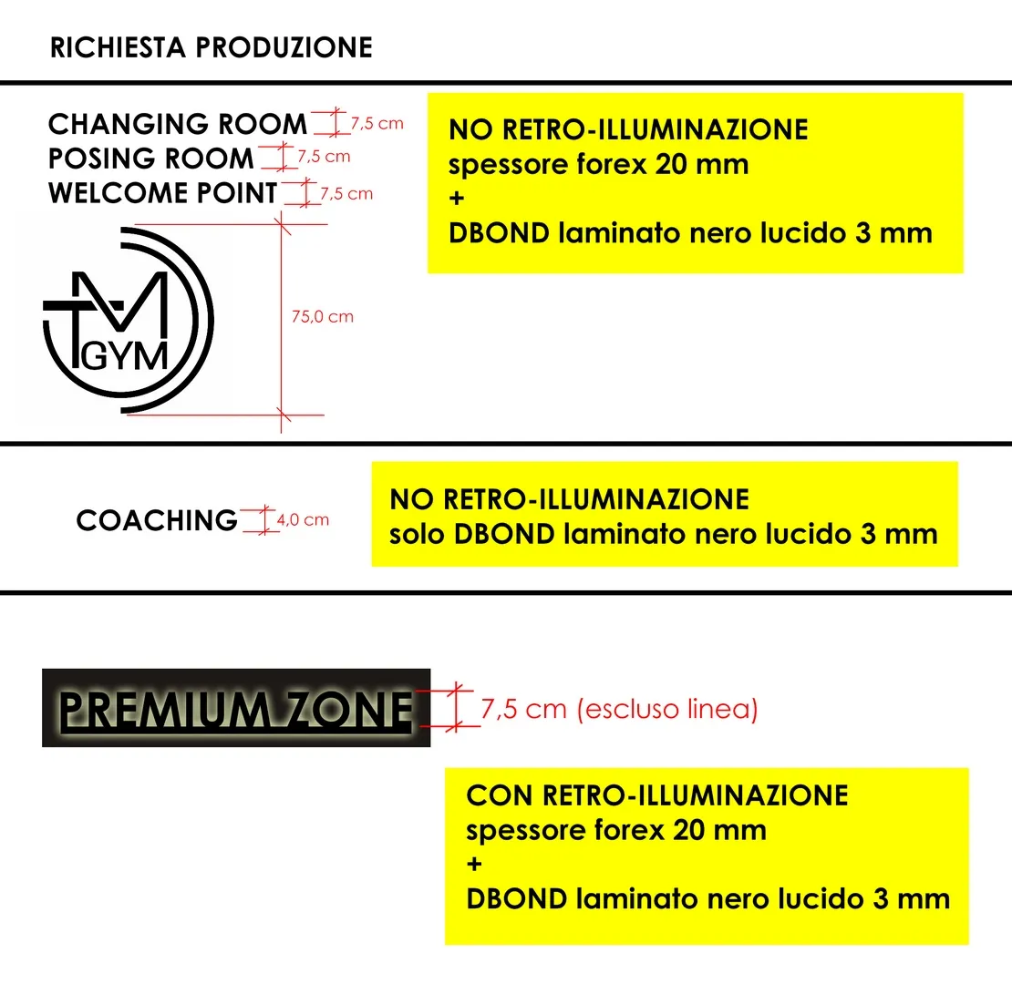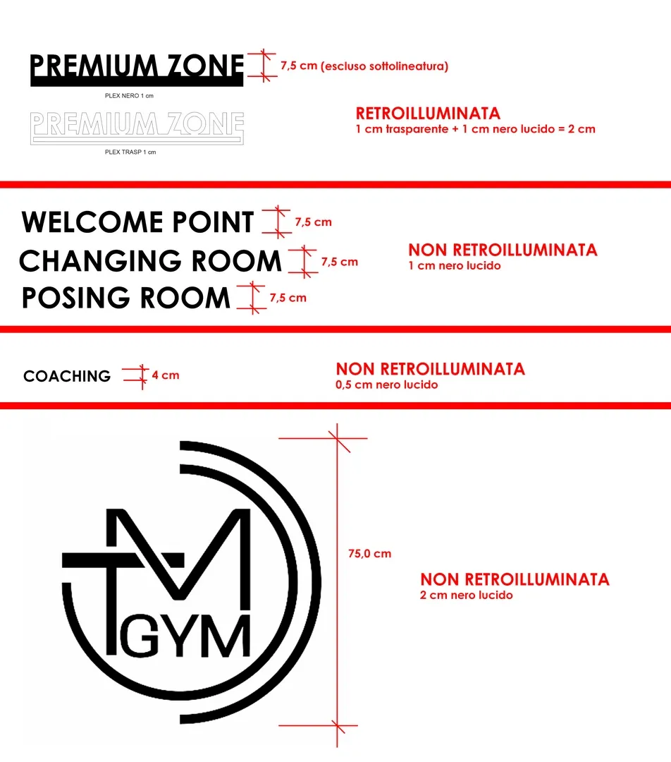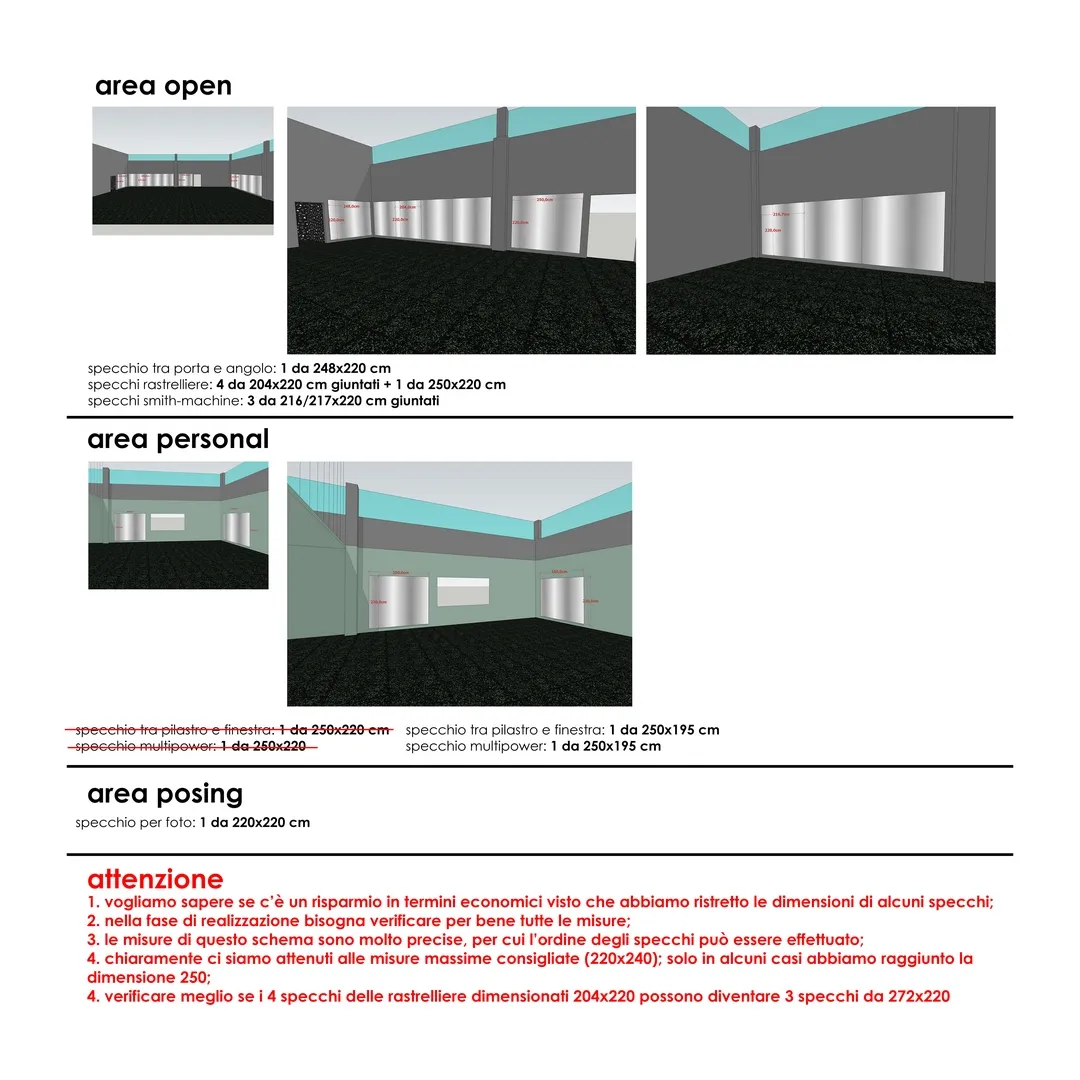 Interessante il progetto delle “infografiche” sparse per la palestra e realizzate con caratteri a rilievo in materiale plexiglass, tutte disegnate e curate nei dettagli; e gli specchi realizzati con telaio strutturale, sospesi con “stacco” rispetto al piano di posa e in alcuni casi anche retro-illuminati.