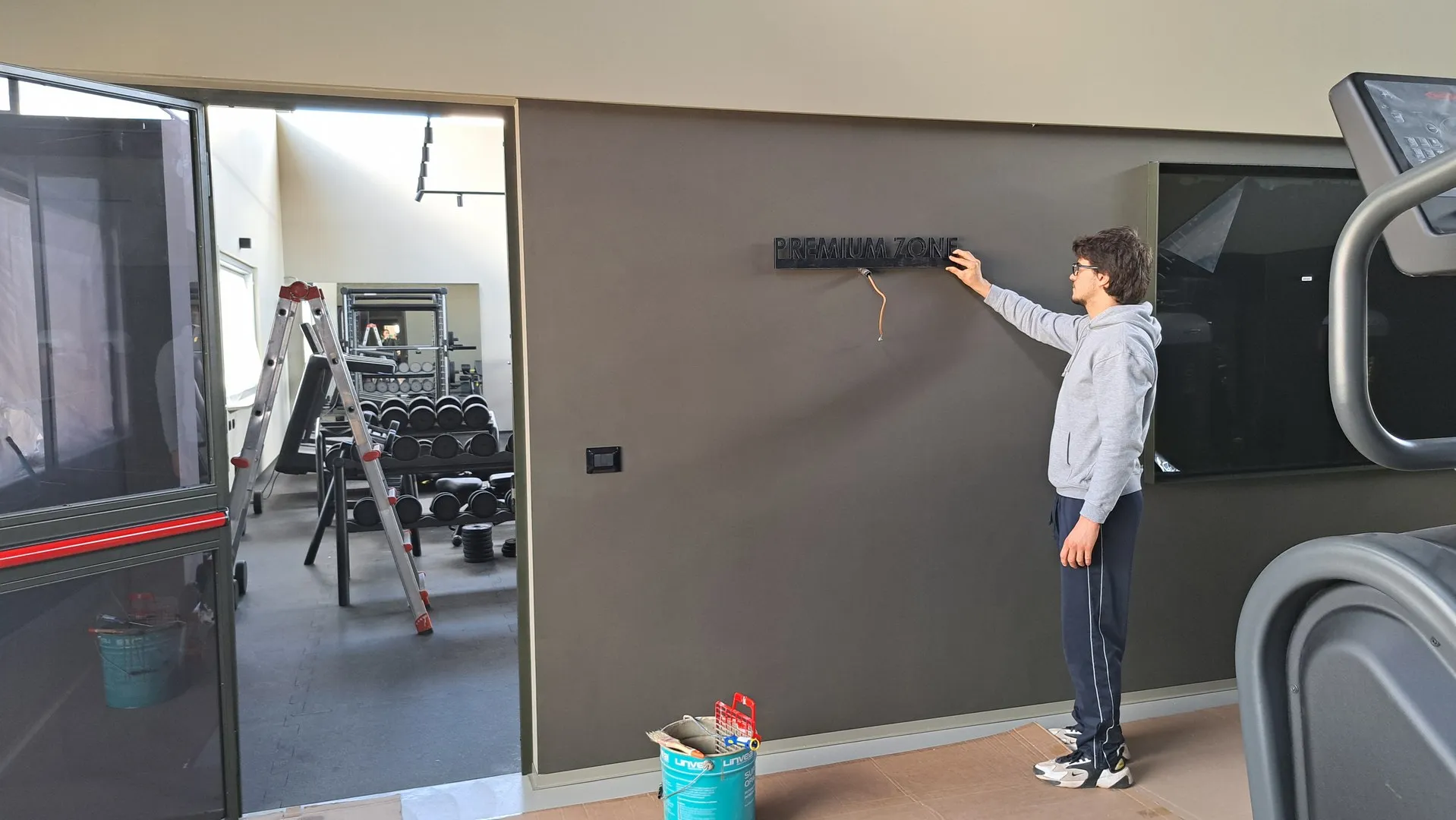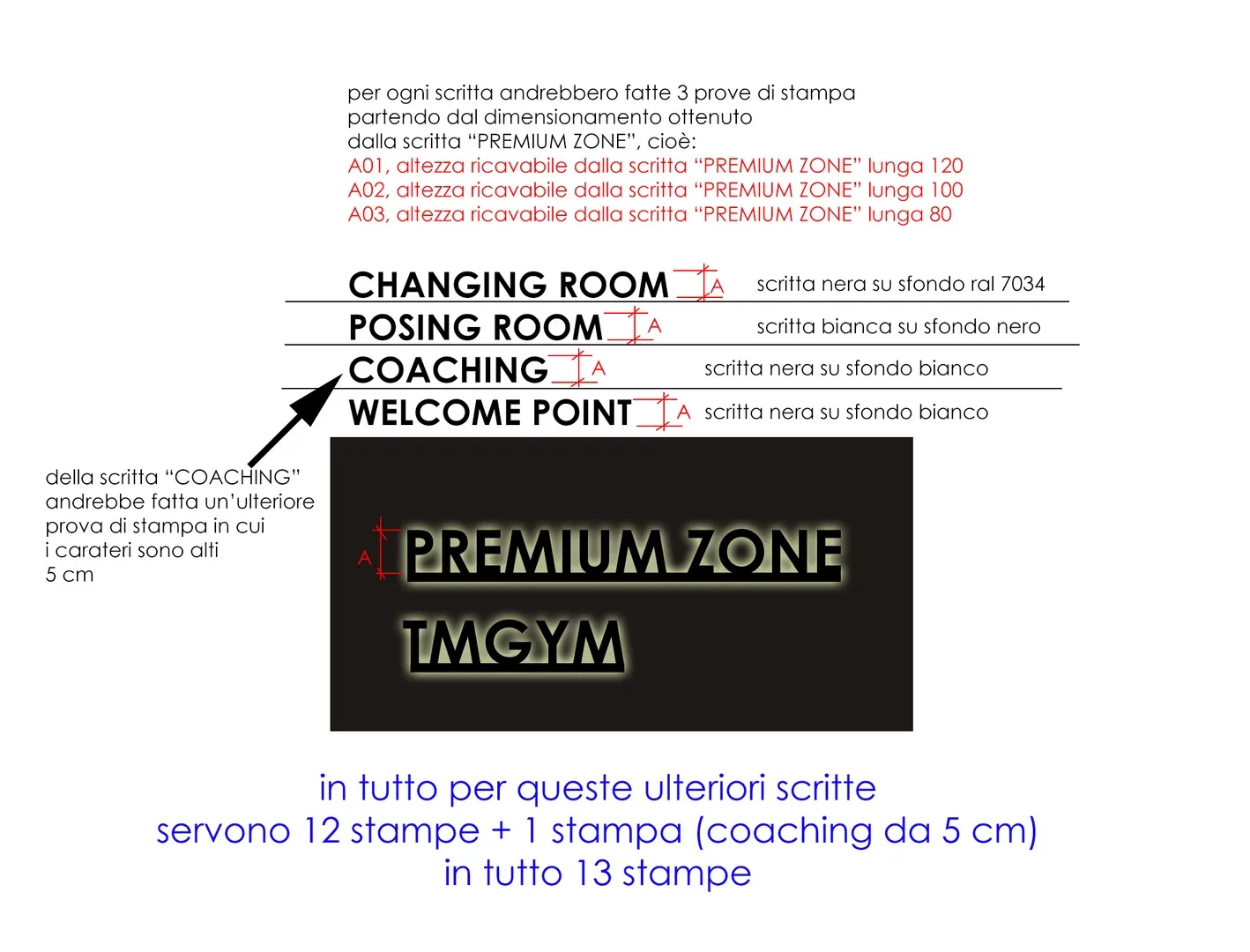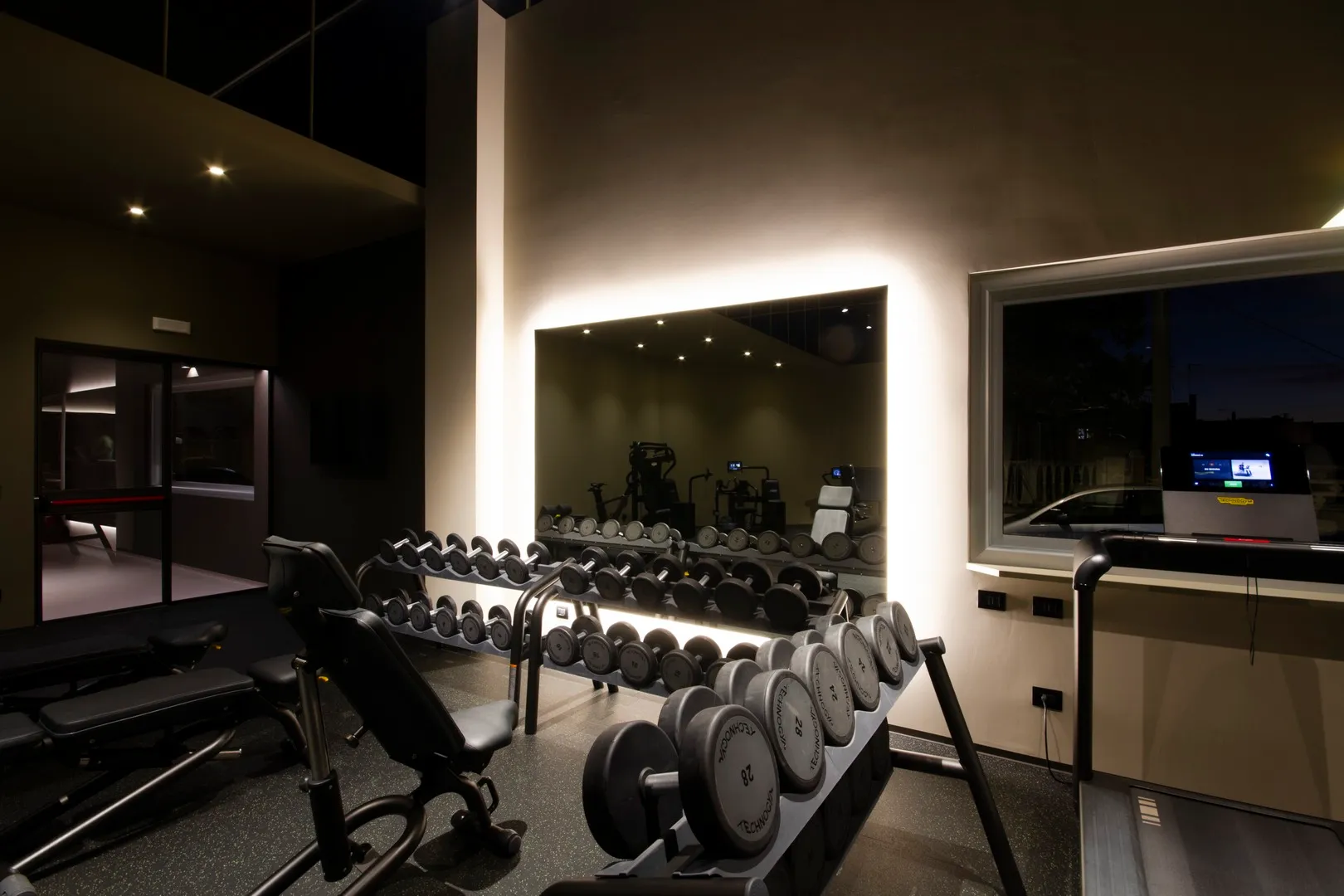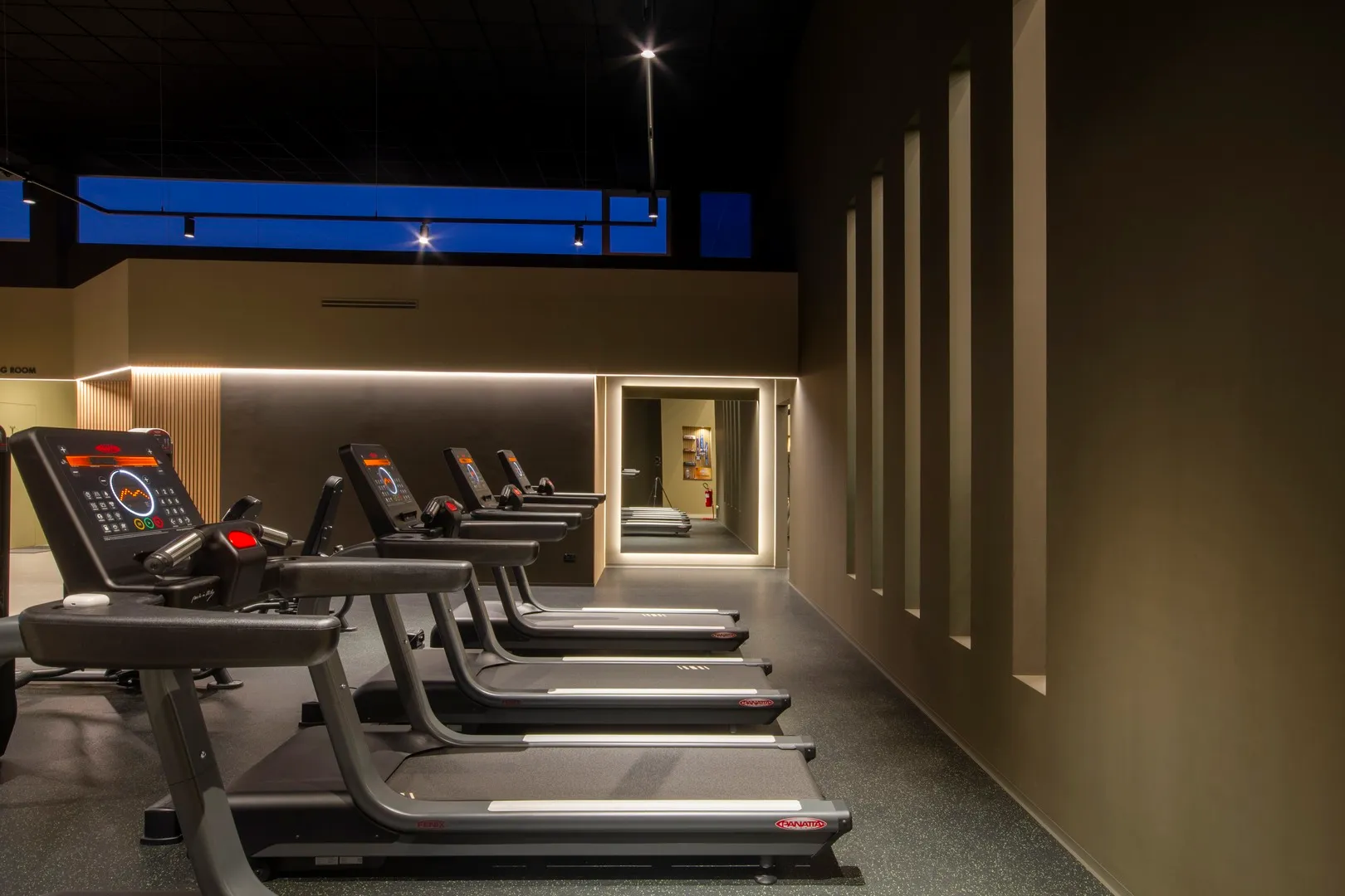 Interessante il progetto delle “infografiche” sparse per la palestra e realizzate con caratteri a rilievo in materiale plexiglass, tutte disegnate e curate nei dettagli; e gli specchi realizzati con telaio strutturale, sospesi con “stacco” rispetto al piano di posa e in alcuni casi anche retro-illuminati.