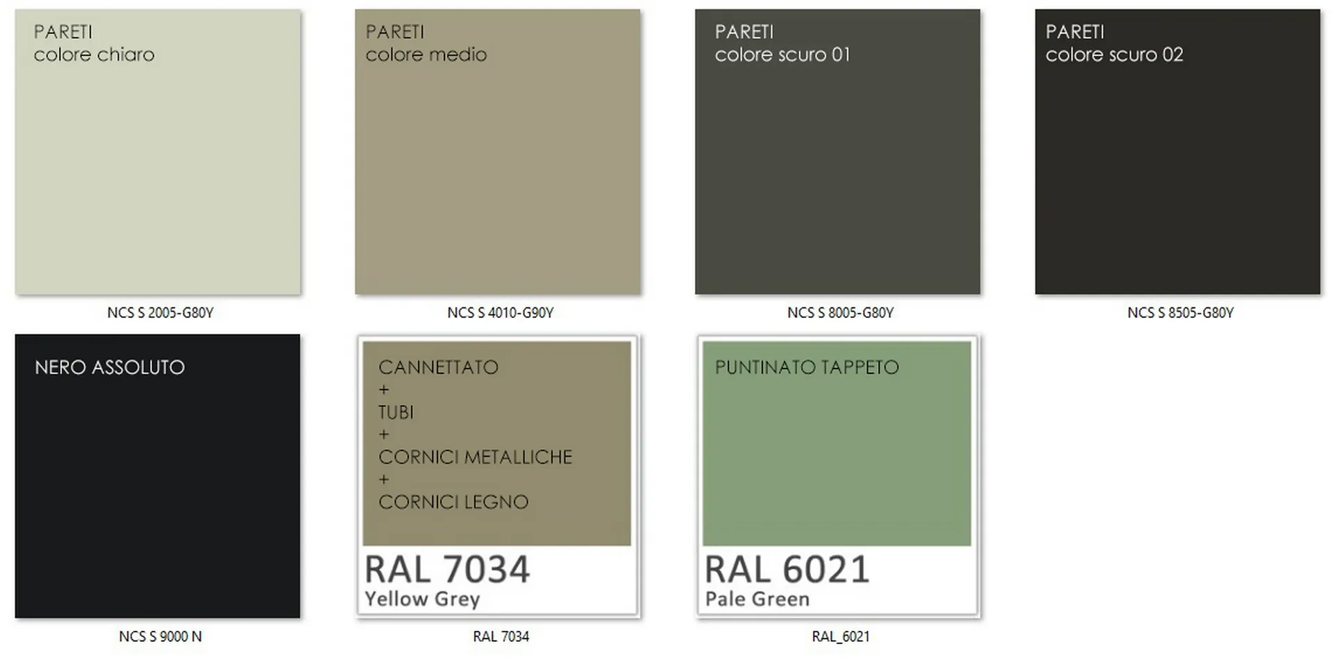 La pianificazione dei colori è avvenuta vivendo il cantiere, cercando di captare le sensazioni del luogo nelle varie fasce orarie, giungendo a soluzioni di nuance che dal “moka” scivolano verso “patinature” color verde-oliva e bianco-glauco.
