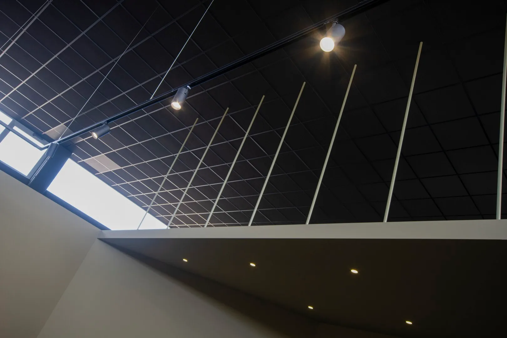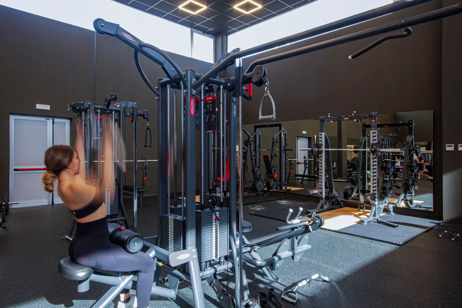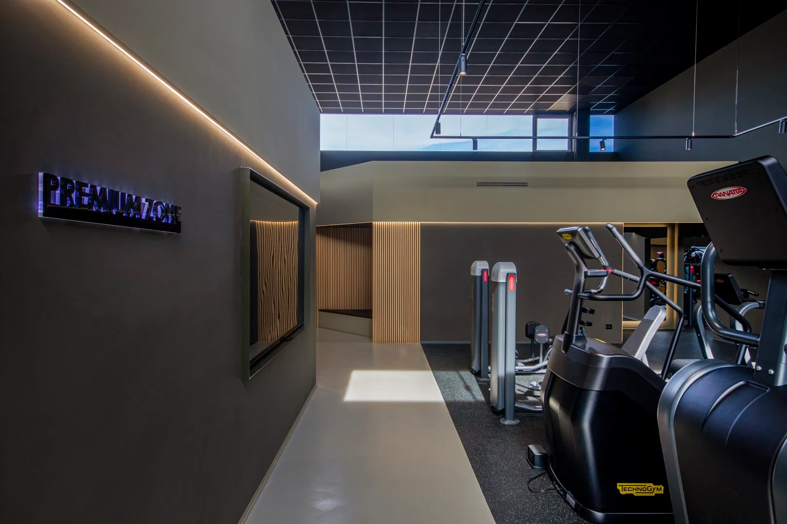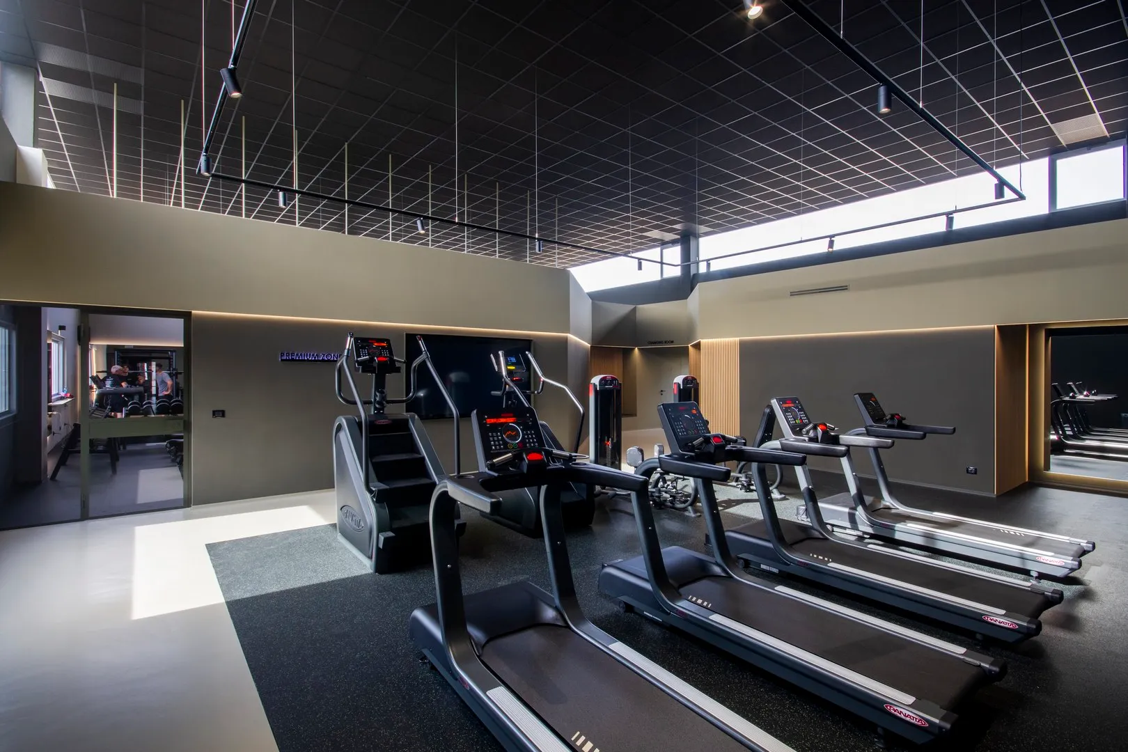 Interessante da un punto di vista strutturale è il solaio sospeso con cavi d’acciaio rivestiti da tubolari, che crea una zona di “compressione”, rendendo leggibile e armonico il passaggio alla sala “premium” (più piccola di quella “open”) dedicata agli allievi che sono seguiti da istruttori “personal” a porte chiuse.