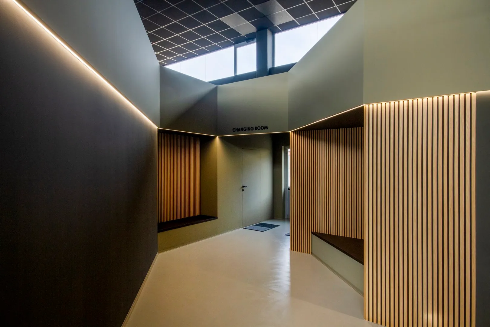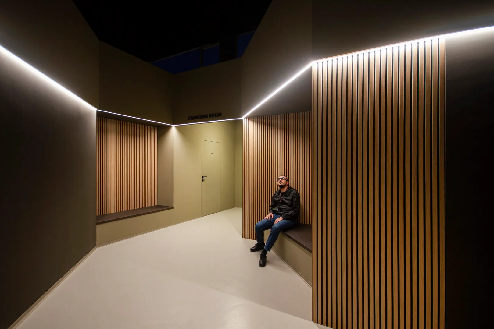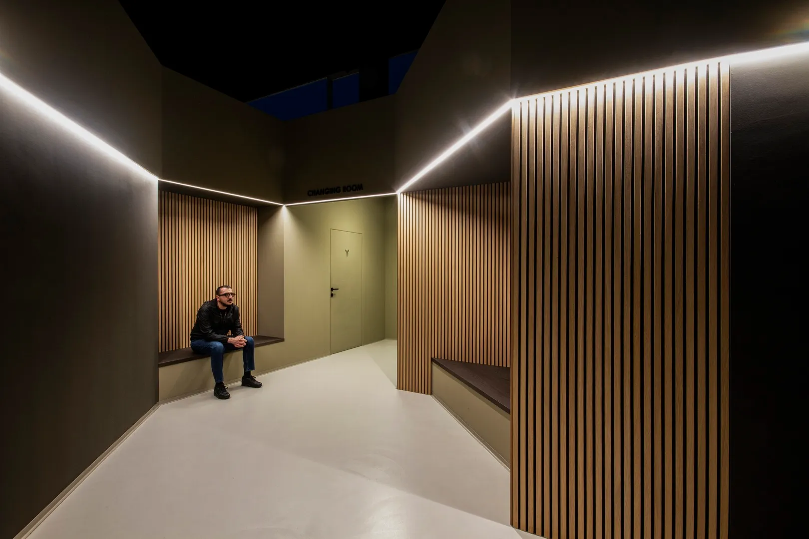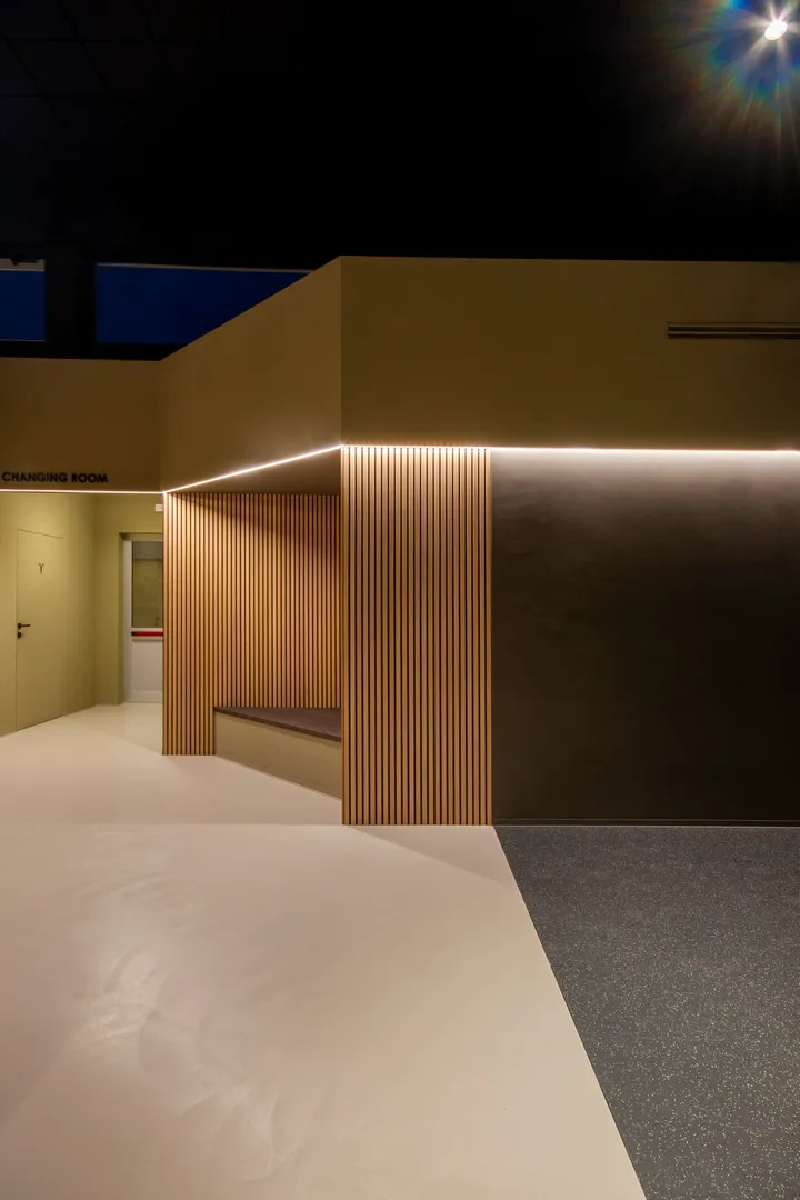 Così come le geometrie delle sedute di attesa, appena adiacenti allo spazio “changing room”, sono come delle piccole “alcove”, dove per un attimo ci si può anche sedere, magari per meditare sulla straordinaria forza ed energia che l’essere umano possiede.
