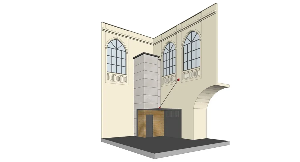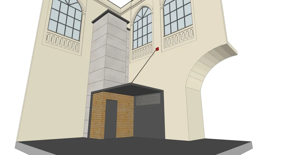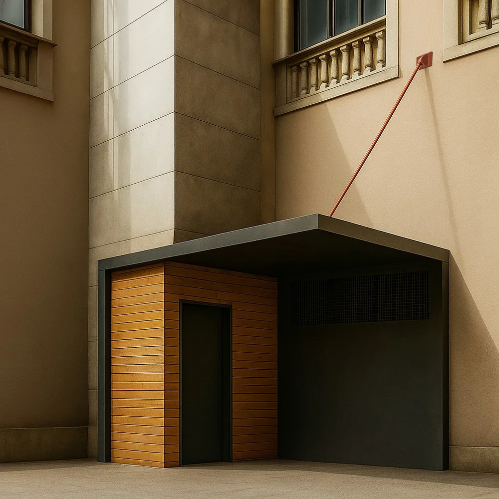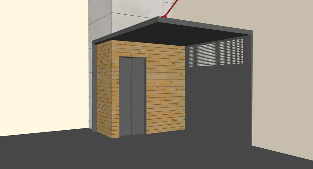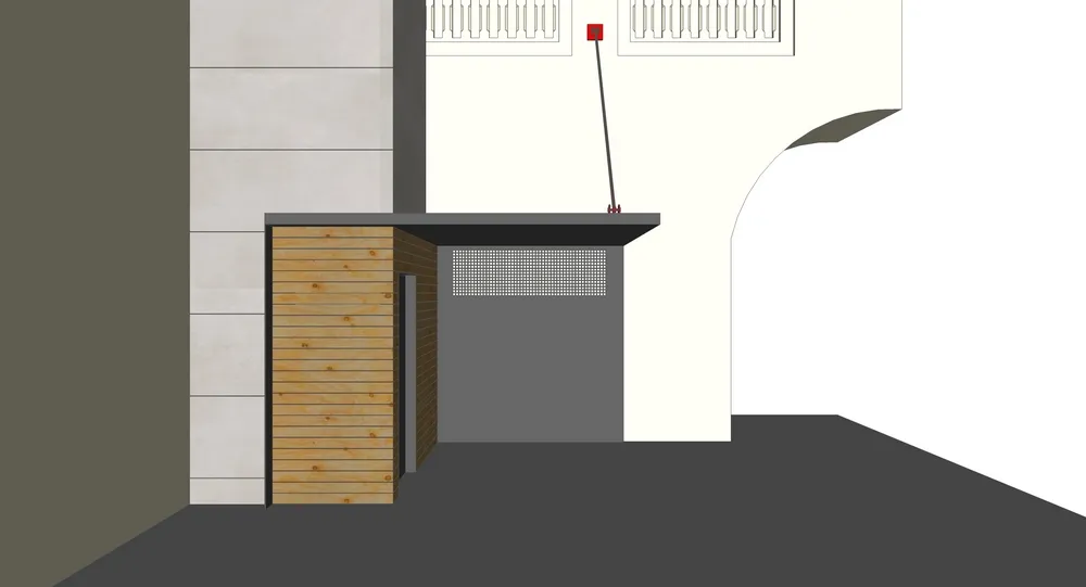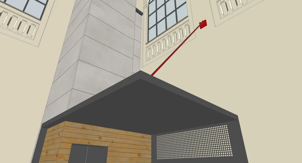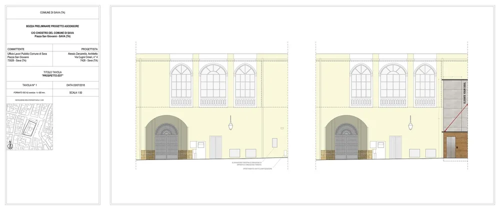 La mia prima bozza del progetto ASCENSORE (dopo aver ricevuto l'incarico dall'Ufficio Lavori Pubblici di Sava), da collocare nell'atrio del Municipio, utilizzando materiali insoliti dal gusto nordico (legno naturale, lamiera verniciata a caldo, pannelli di gres effetto cemento) anche per determinare uno "stacco netto" con il contesto, con uno spirito "conservazionista". La leggerezza del tirante con staffa di colore rosso, anch'esso verniciato a caldo, che regge lo sbalzo della tettoia, bilancia l'imponenza volumetrica del vano ascensore. Ora la bozza dovrà essere valutata dalla Soprintendenza dei Beni Culturali di Taranto. Mi auguro che sarà accolta.