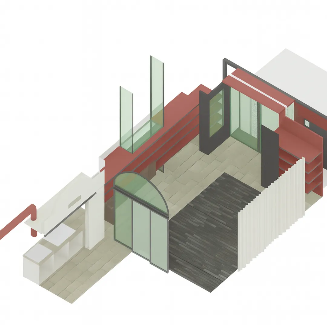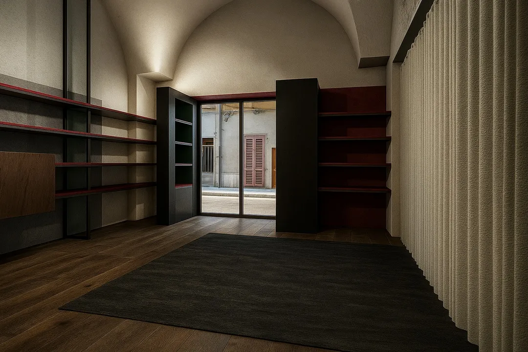 Proposta di riconfigurazione di uno spazio da convertire in casa-laboratorio (FLIOMENA LAB). Filomena V. è un'artista di Manduria (TA) che si occupa di vetrate con legatura a piombo. Lei necessita di ristrutturare il suo spazio, così ha incaricato l'architetto Zanzarella di ideare una nuova disposizione degli ambienti in modo da poter ottenere una sala espositiva nella prima stanza voltata, situata in corrispondenza dell'ingresso all'edificio. La particolarità del progetto è insita soprattutto nel trattamento dell'esterno, ideato (come si vede dal video) in modo tale da chiudere completamente le aperture con robuste porte scorrevoli di lamiera trattata che si azionano con un sistema elettrico.