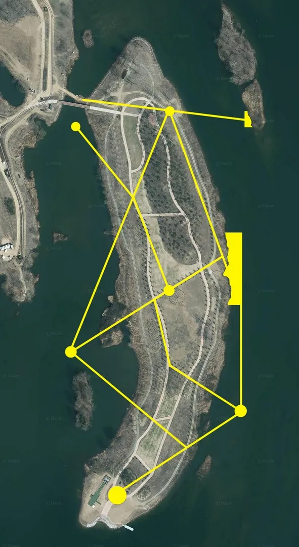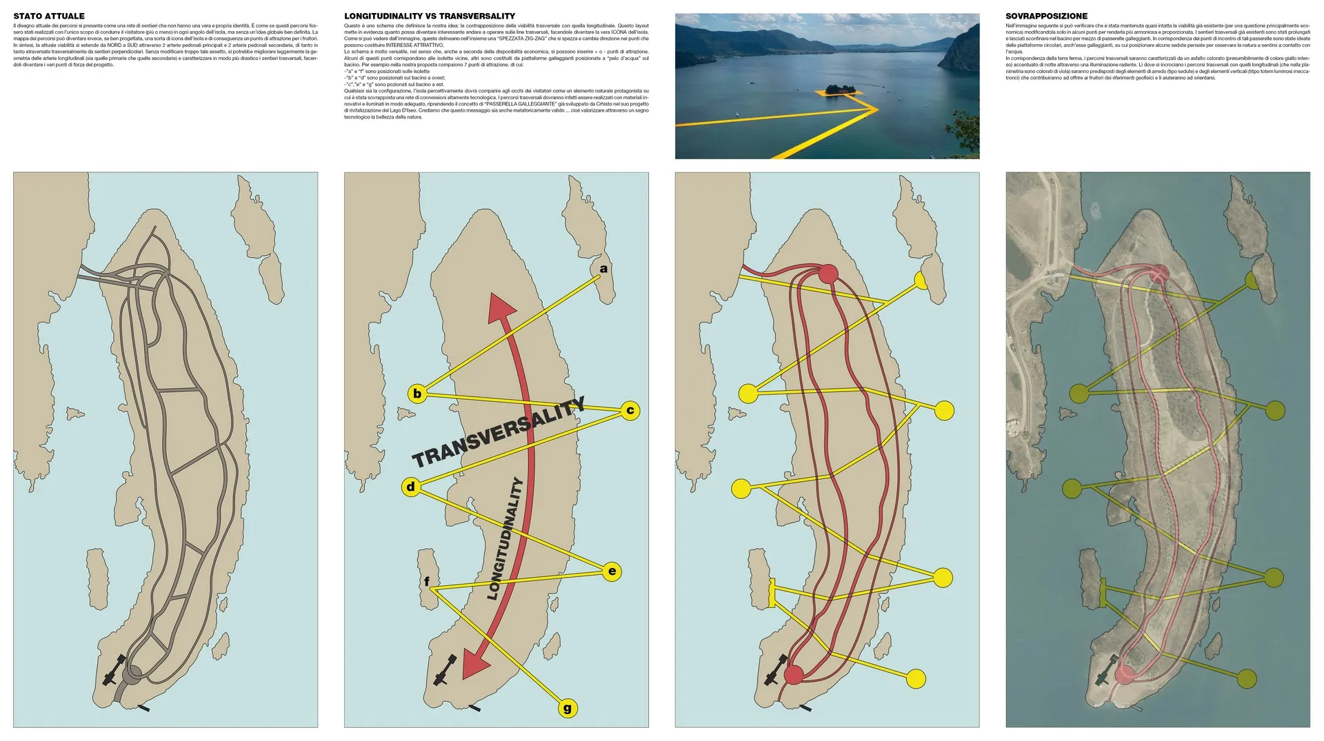 Nel caso di JARA, l'architetto vede nel segno della "spezzata" una metafora di connessione e osservazione; la linea zig-zagante si estende lungo il suo percorso, in direzioni trasversali rispetto alla forma longitudinale dell'isola, conducendo i visitatori verso luoghi di interesse anche a largo dalla riva, punti dai quali si possa ammirare il paesaggio con un certo "distacco" e con un senso di quiete a-spaziale e a-temporale.