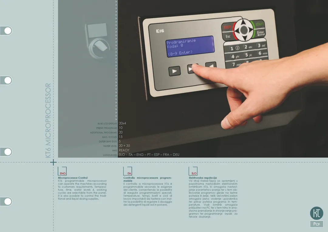 Siamo a dicembre e a inizio del nuovo anno 2010 l'azienda KREBE TIPPO finalmente promuoverà il suo nuovo logo disegnato e ideato dall'architetto Alessio Zanzarella. In questo articolo vi è una breve sintesi del percorso creativo e collaborativo che l'architetto ha intrapreso da ormai quasi un anno con l'azienda. Il logo KT sancisce la forza di questa azienda che per mezzo delle sue iniziali, vuole comunicare l'orgoglio e la consapevolezza della sua leadership in ambito "macchinari per il lavaggio industriale". L'architetto ha ideato anche le etichette in rilievo e le serigrafie da apporre sulle lavatrici dopo aver effettuato una meticolosa selezione dei colori e delle finiture, fino a ideare un logo pressofuso nell'acciaio. Oltre al logo istituzionale, Zanzarella ha disegnato anche il logo di una particolare funzione di cui queste macchine industriali sono dotate: il G FACTOR, che è un particolare procedimento grazie al quale nelle lavatrici KREBE TIPPO si attivano alcune peculiari performance. Nel percorso di direzione artistica rientrano diversi step di progettazione, come ad esempio il controllo e la gestione di tutte le stampe serigrafiche, con le relative prove di stampa, che saranno effettuate sui packaging. A chiudere il cerchio, la creazione del folder/catalogo istituzionale dell'azienda, ideato e creato dall'architetto con i programmi più avanzati di illustrazione grafica e che raccoglie tutte le informazioni tecniche relative ai macchinari prodotti dall'azienda in più di 10 lingue. Tra le immagini proposte, alcune schede grafiche del folder, concepito in colori tenui a seconda degli ambiti trattati. Per la copertina del catalogo, l'architetto ha scelto un materiale rigido, il d-bond in finitura "grigio specchio", tenuto chiuso da un elastico dello stesso colore del logo e sulla cui fascia interna sono stati fissati gli anelli che raccolgono le singole schede. In fondo alle immagini, alcune prime bozze di ideazione del logo.