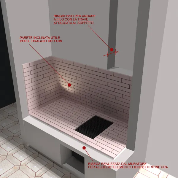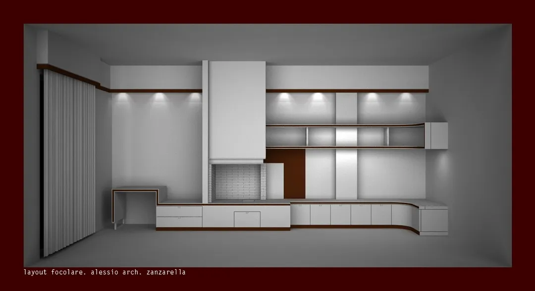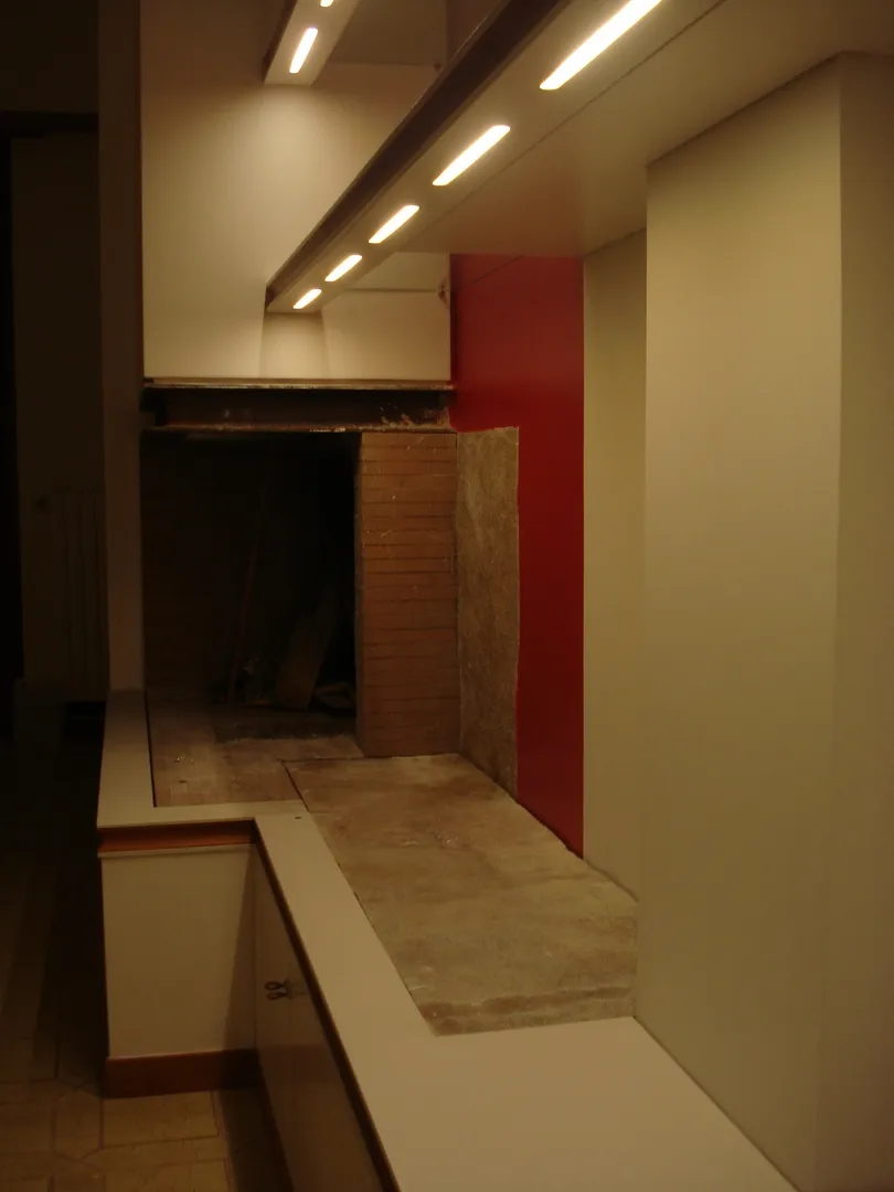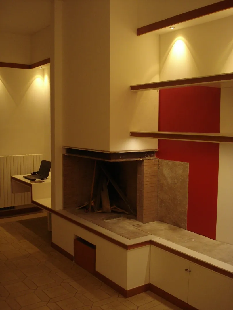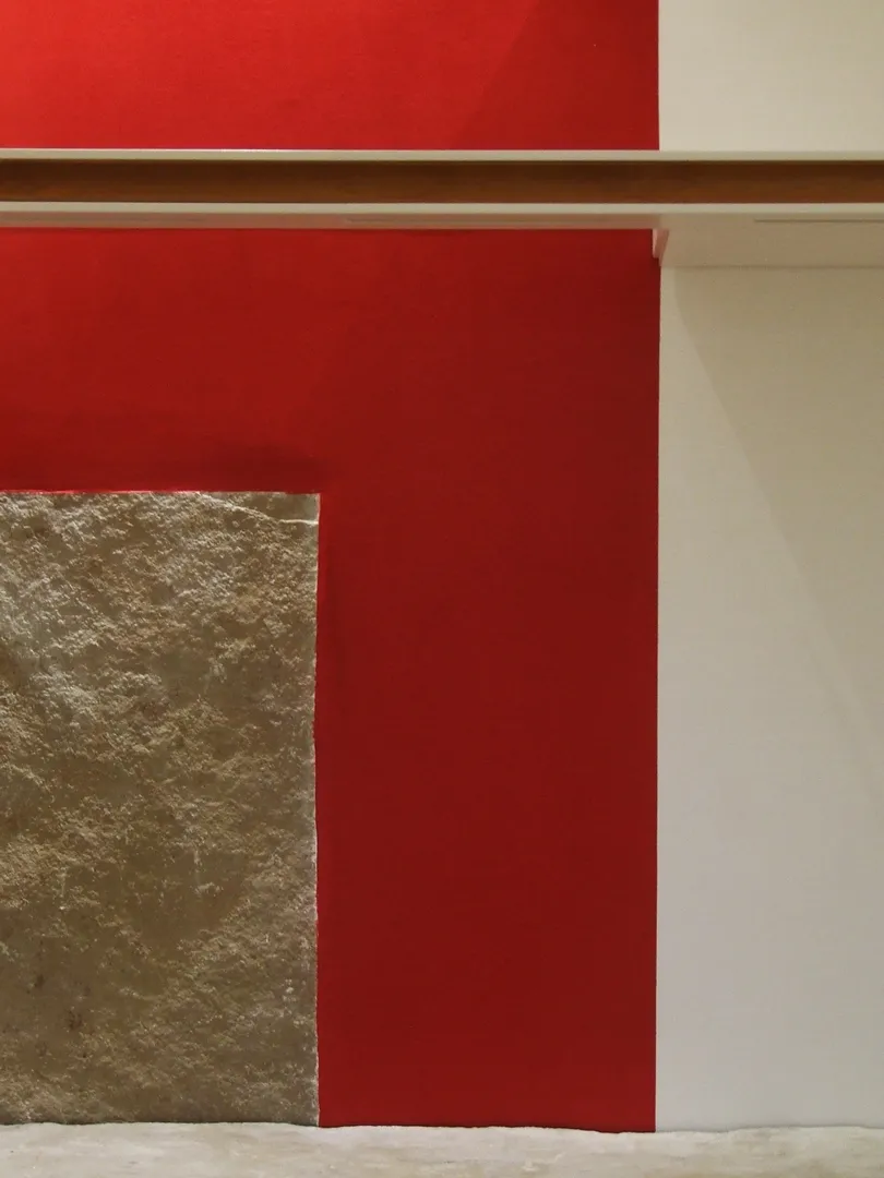 - per concludere, la creazione di un riquadro di pittura murale colore rosso carminio, che crea un'antitesi con la presenza adiacente del fuoco del camino.