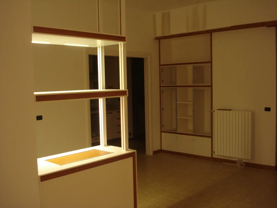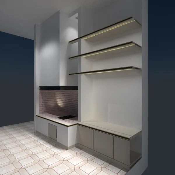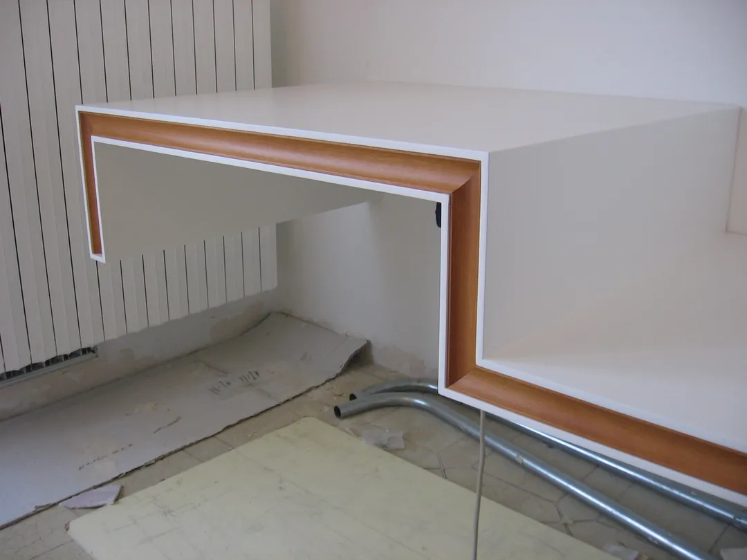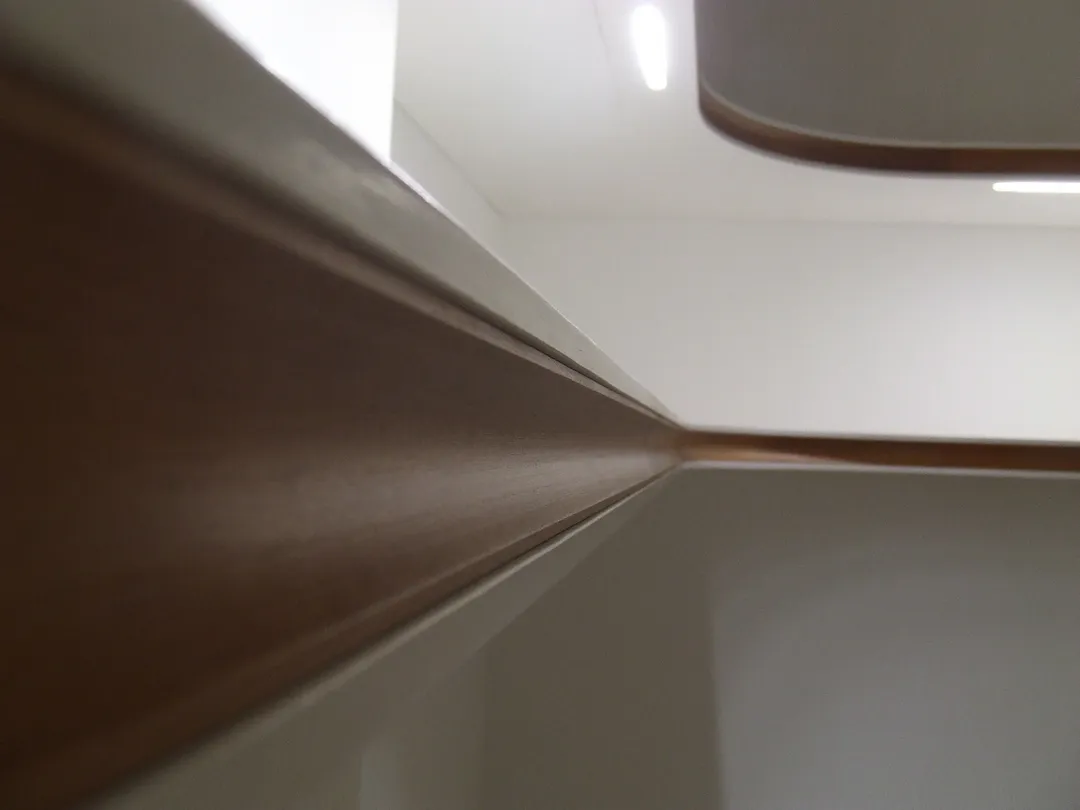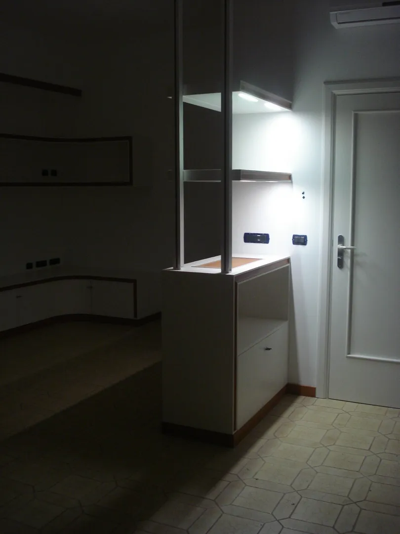- la falegnameria con illuminazione integrata nei ripiani, a loro volta decorati sulle fasce frontali con un profilo di legno naturale raggiato;