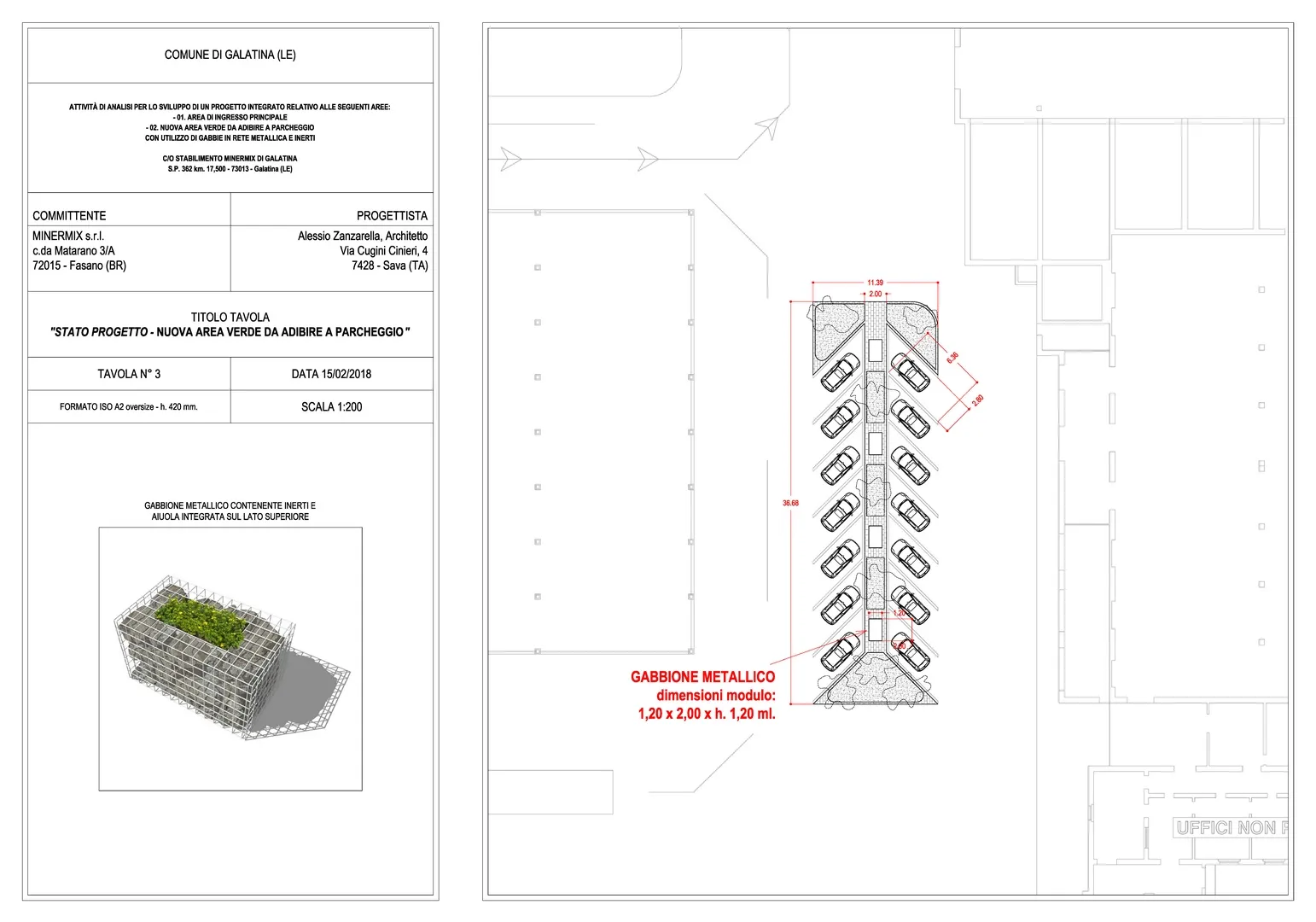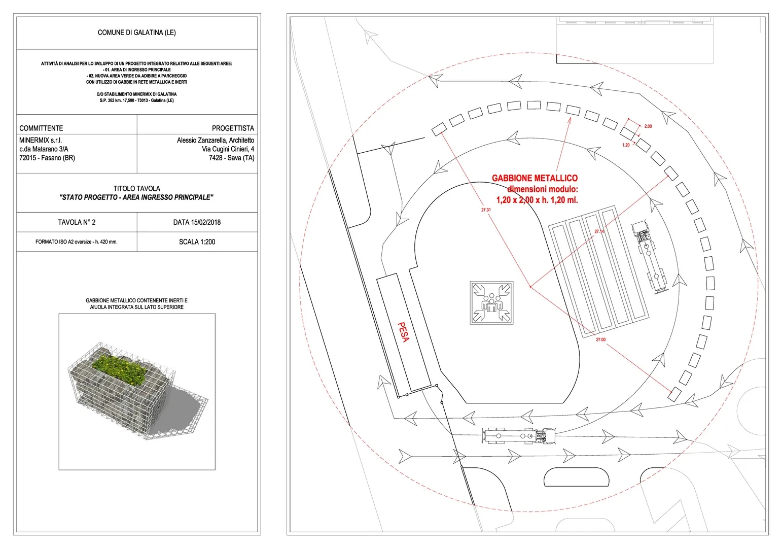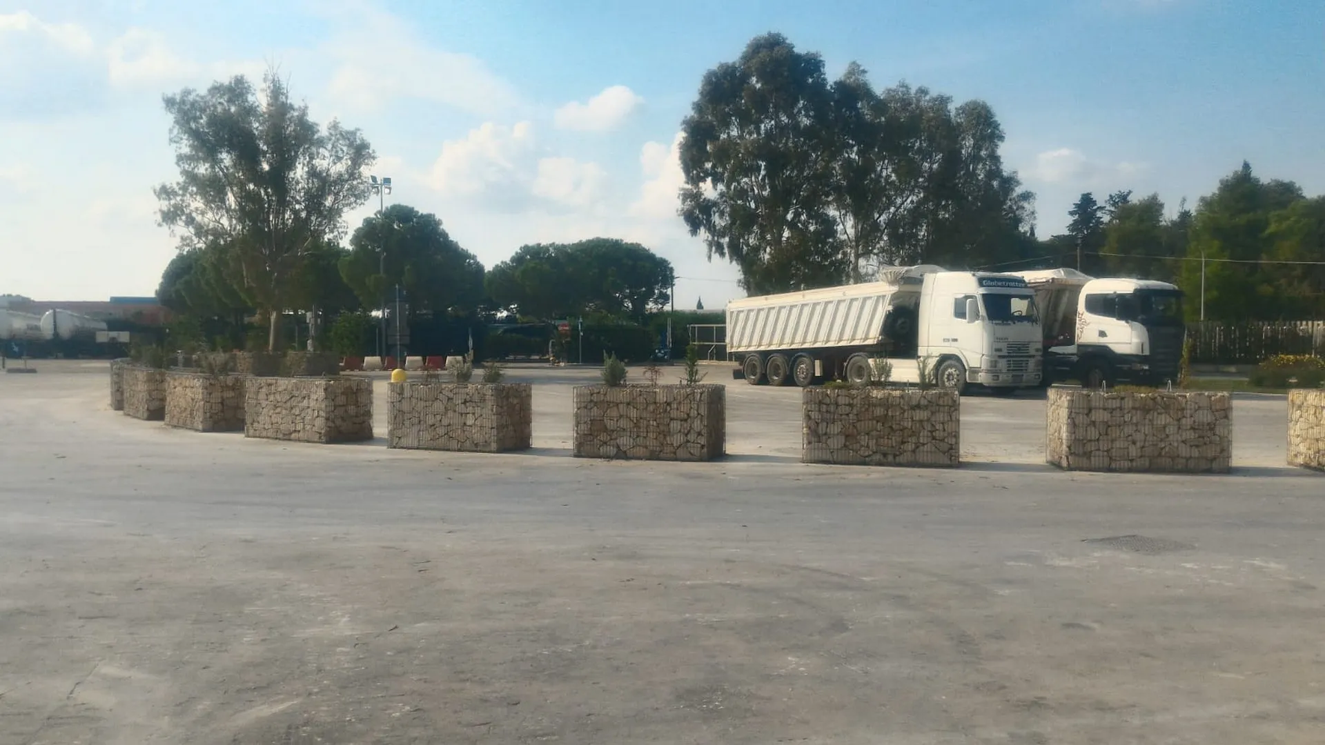 Consegnato il progetto di ri-organizzazione dell'area parcheggio della sede MINERMIX di Galatina (LE), azienda che si occupa di produzione di calce e inerti. L'architetto Zanzarella si è occupato di modellare e disporre in planimetria i gabbioni metallici acquistati dall'azienda per delimitare i transiti dei tir in uscita e in entrata in corrispondenza della vasta area di ingresso ai parcheggi.