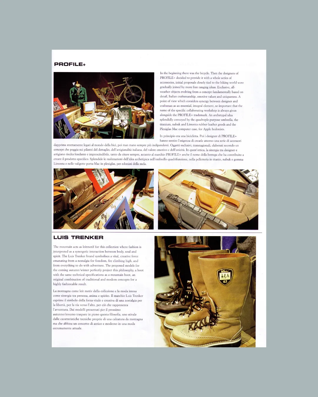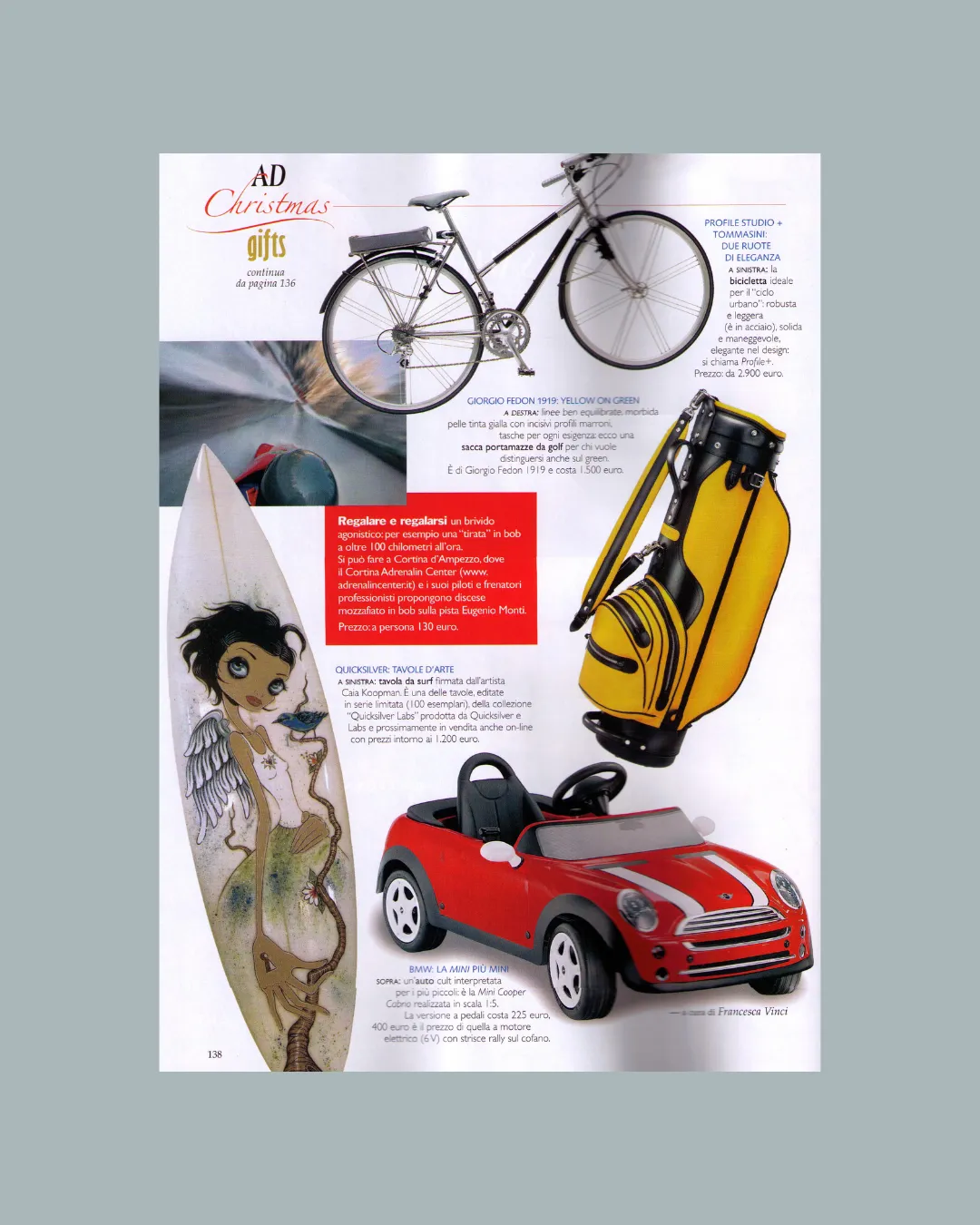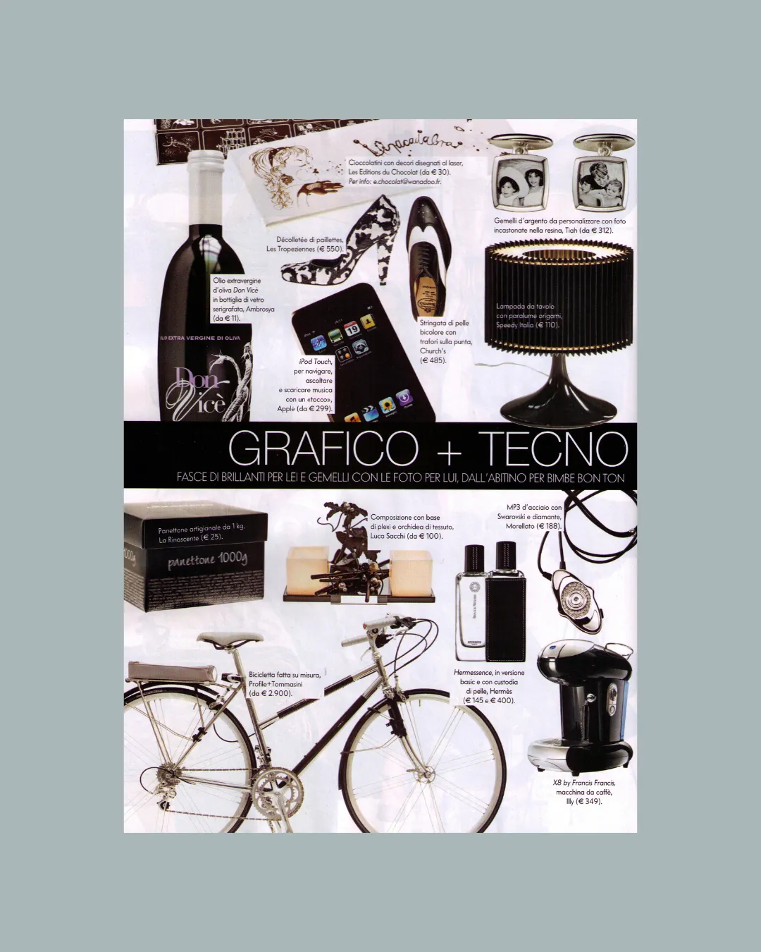 La collezione che abbiamo creato rompe la continuità della visione tradizionale che ha caratterizzato finora il contesto della bicicletta, trasformandola da semplice mezzo sportivo o di locomozione in accessorio complesso, portatore di bellezza, gusto, eleganza. Siamo partiti da uno dei migliori telai in acciaio prodotti in Italia: il Tommasini; oltre ad averne reinventato colori, finiture, mood, per dare vita ad un prodotto completamente customizzabile, nel contempo abbiamo anche ideato una linea di oggetti affini, tra cui alcuni accessori per la bicicletta, una linea di pelletteria in tessuto gommato, alcune valigie in plexiglass e una seggiola da mare.