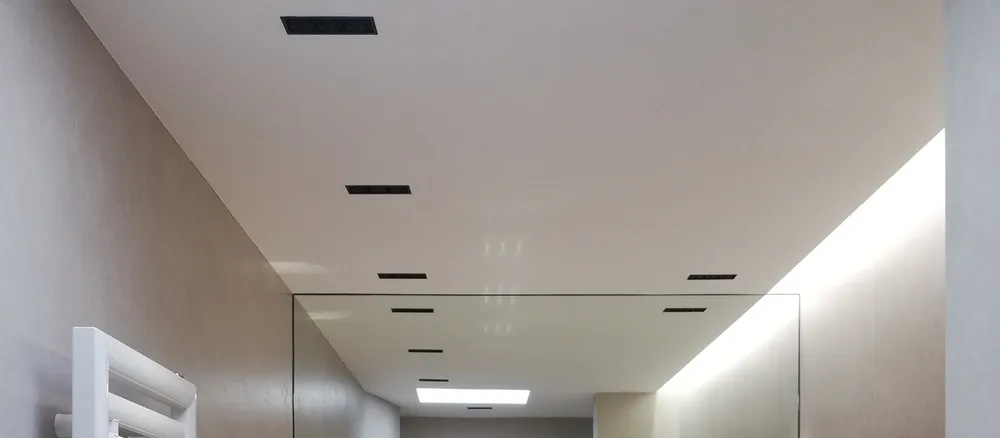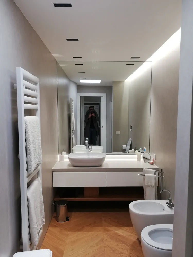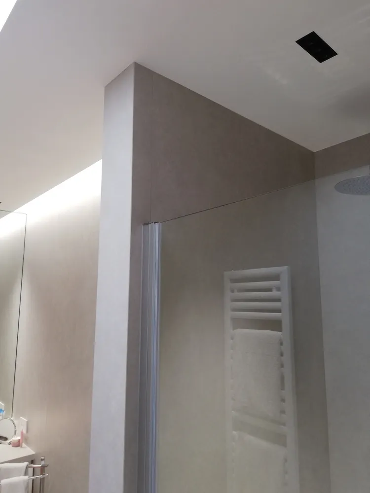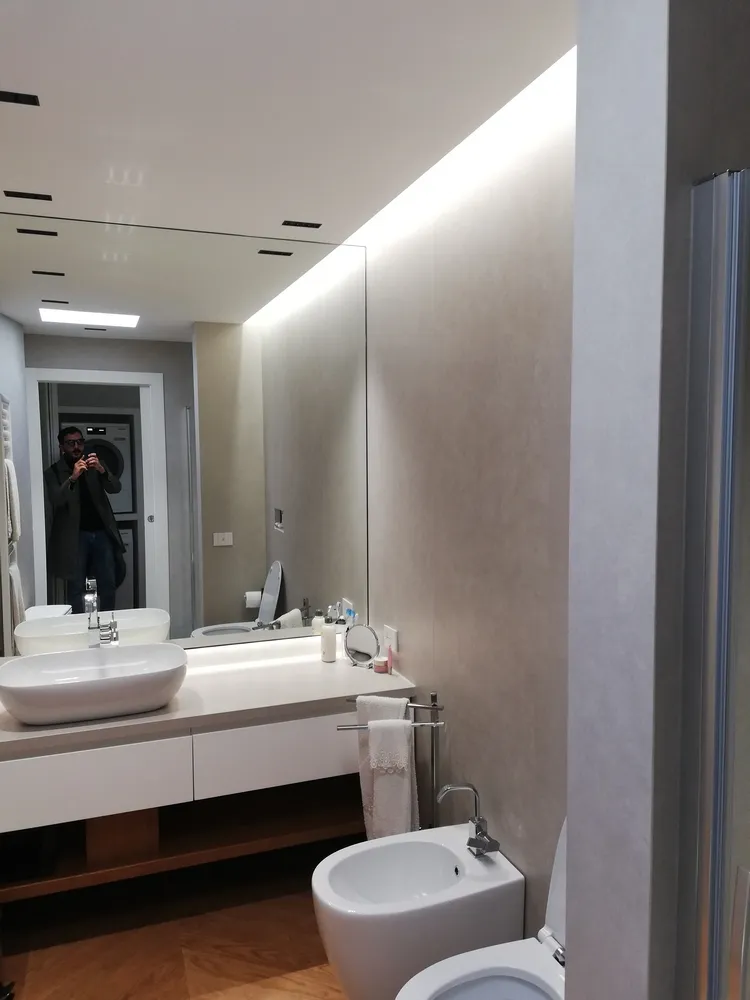 Gioca un ruolo importante anche la luce artificiale, determinata da faretti a incasso nel controsoffitto e da una gola con strip led in corrispondenza della parete dei sanitari.