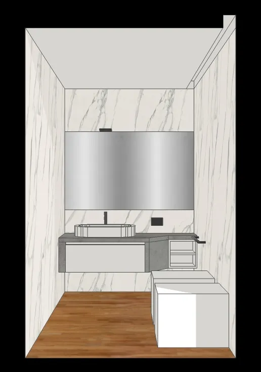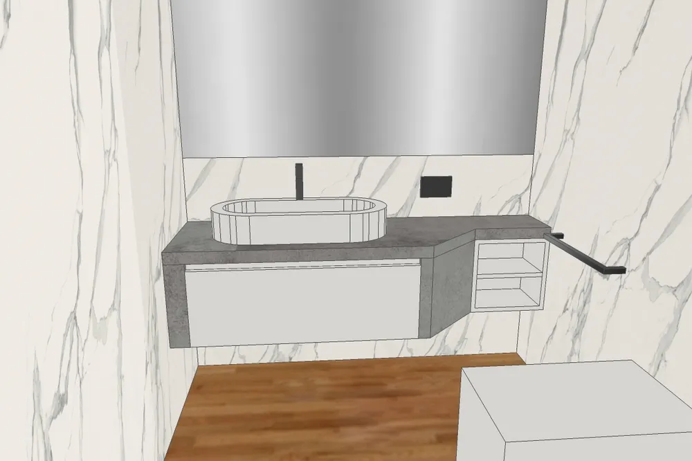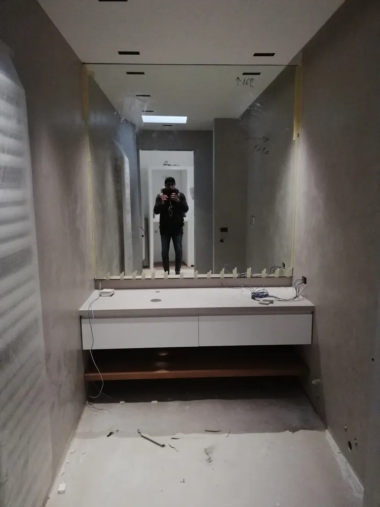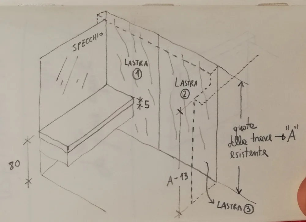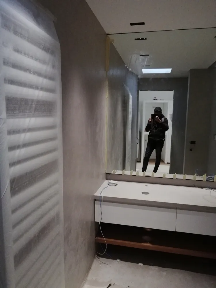 Dopo la posa del parquet (vedi LINK), in questo periodo i lavori si stanno concentrando nel bagno di ATTICO SABRINA. Da sempre la cliente ha voluto utilizzare il gres grande formato per rivestire le pareti del bagno a tutta altezza. In una prima bozza, di cui alcune immagini sono proposte di seguito, si era optato per una soluzione di grandi lastre effetto marmo. Ma alcune vicissitudini mi hanno condotto a scegliere un materiale di più facile approvvigionamento, comunque grande formato: si stratta della collezione FOKOS by Laminam, un materiale che simula l'effetto omogeneo del micro-cemento e che si accosta benissimo ai toni caldi del parquet.