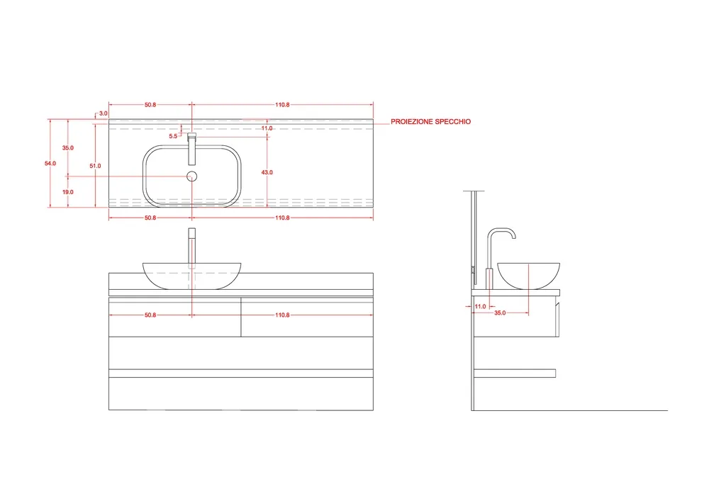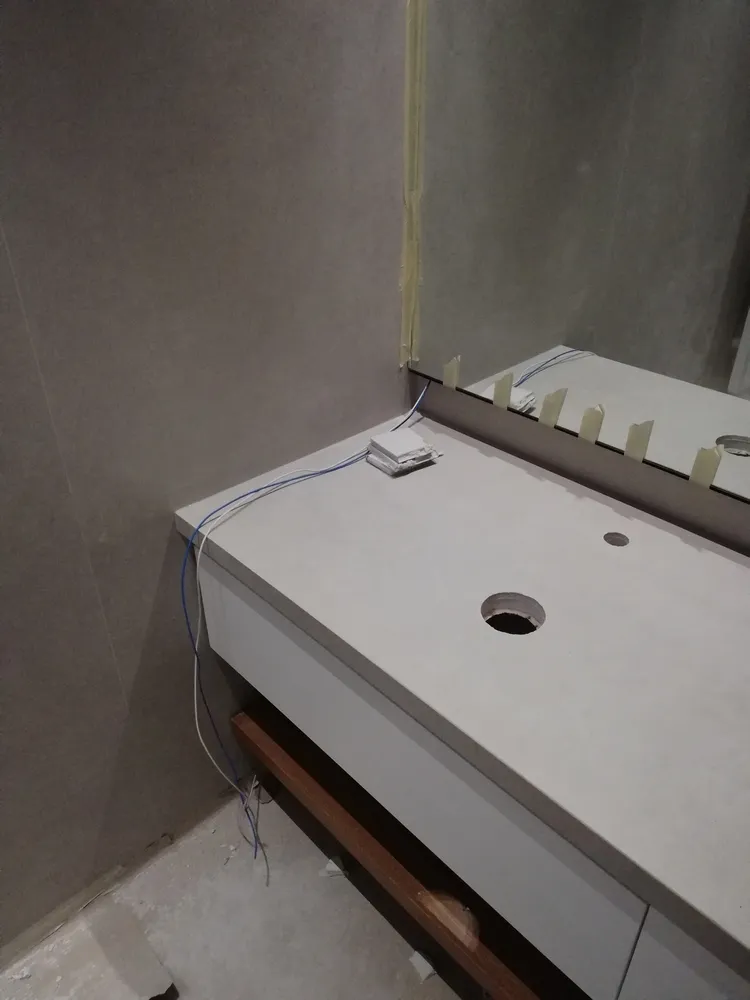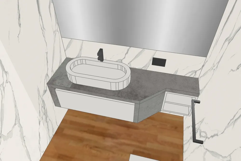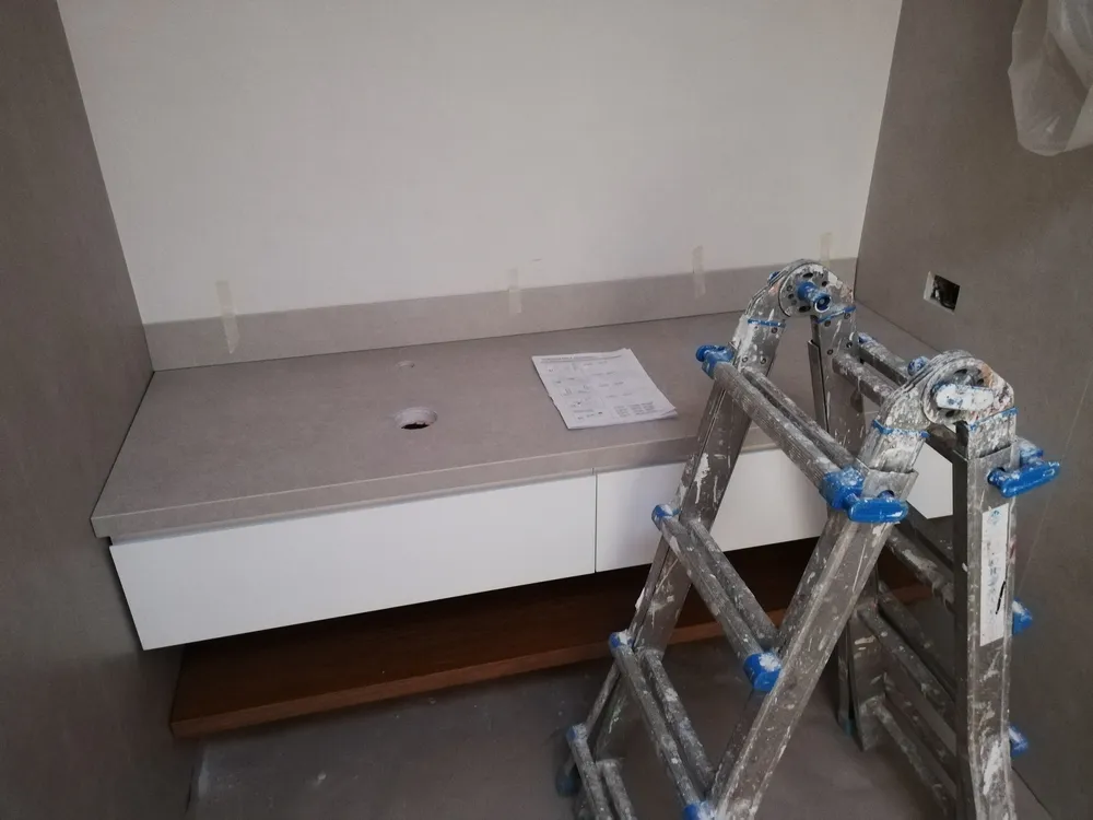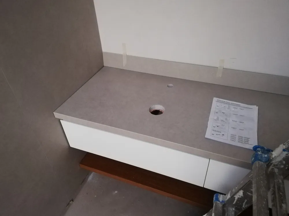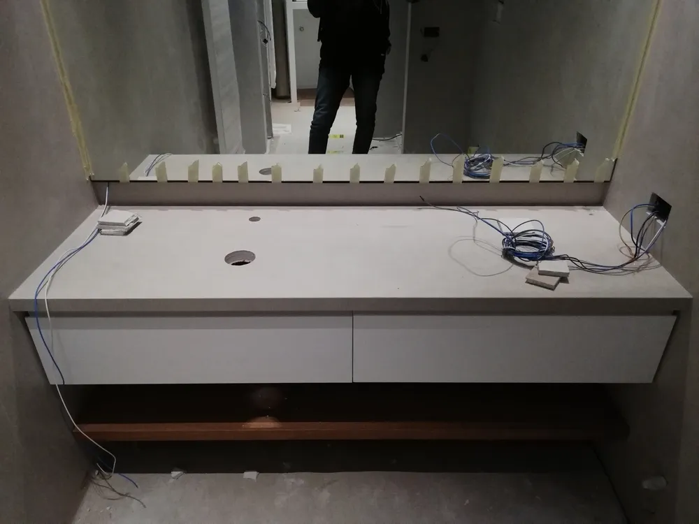 Il top lavabo è anch'esso realizzato in gres grande formato, della stessa tipologia di quello già usato sulle pareti, perfettamente sigillato sul suo perimetro. Al di sotto, i due cassetti in legno laccato e il piano impiallacciato in rovere come il parquet, sono integrati e creati "su misura".