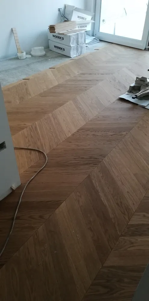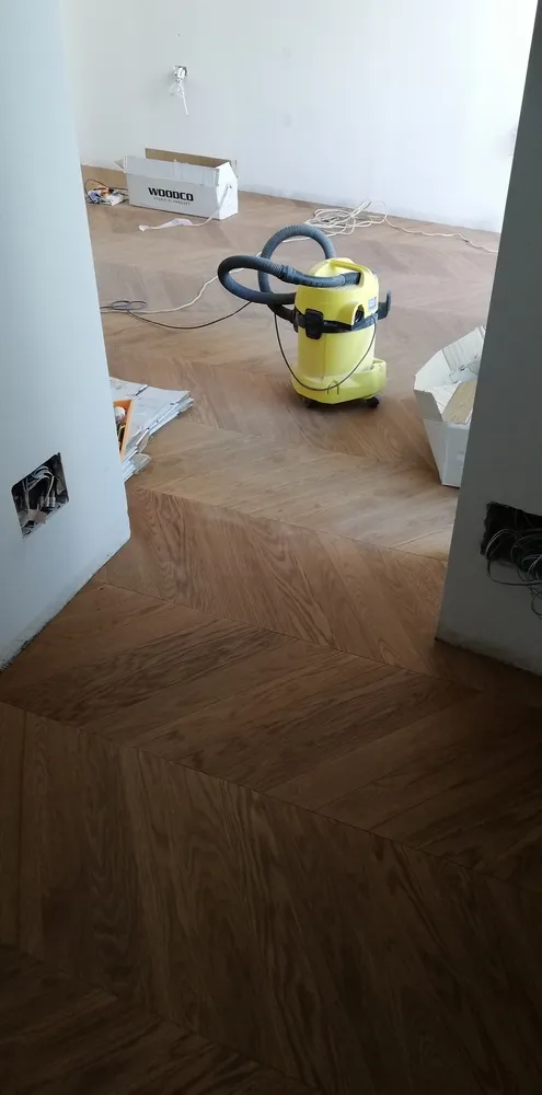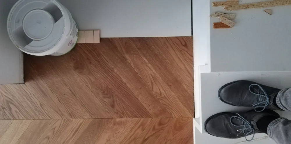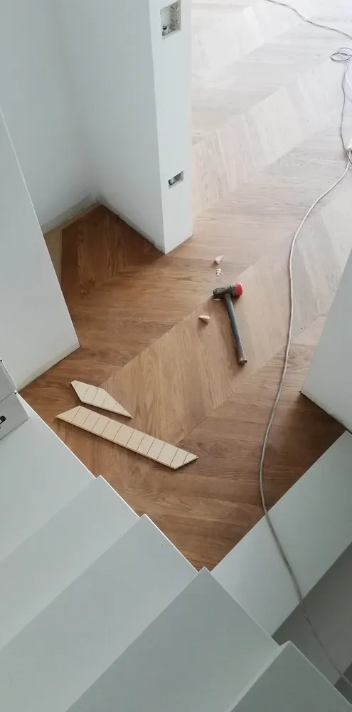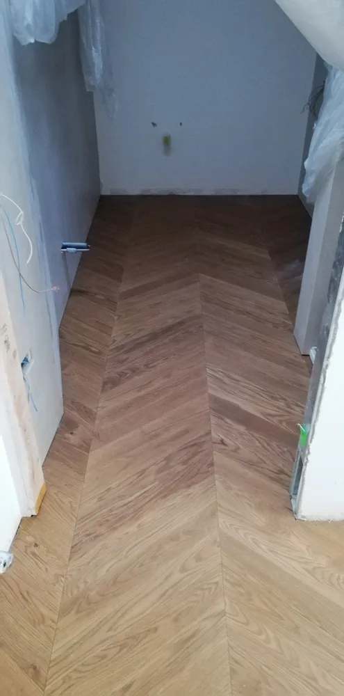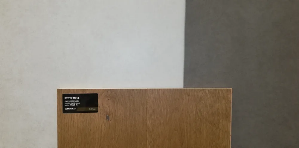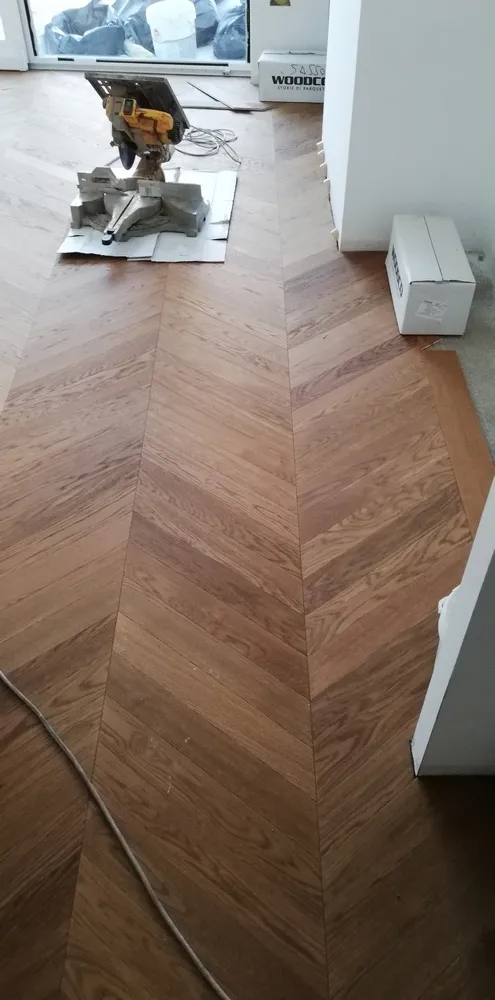 Oggi finalmente siamo in una situazione abbastanza avanzata, nonostante il covid e nonostante le difficoltà di movimento degli stessi operai all'interno del cantiere, per via degli spazi esigui. Dopo la preparazione del sottofondo, l'azienda Fidelia di Matera ha posato a "spina francese" il parquet DREAM ROVERE MIELE by Woodco. Un parquet dall'aspetto molto naturale, autentico; davvero elegantissimo.