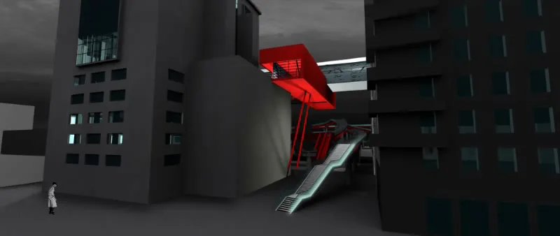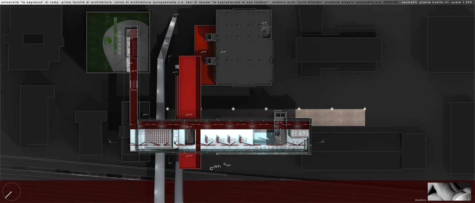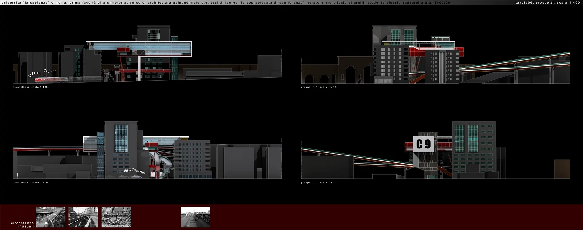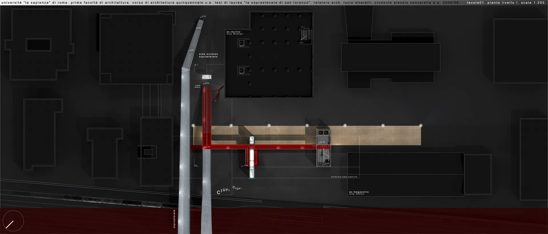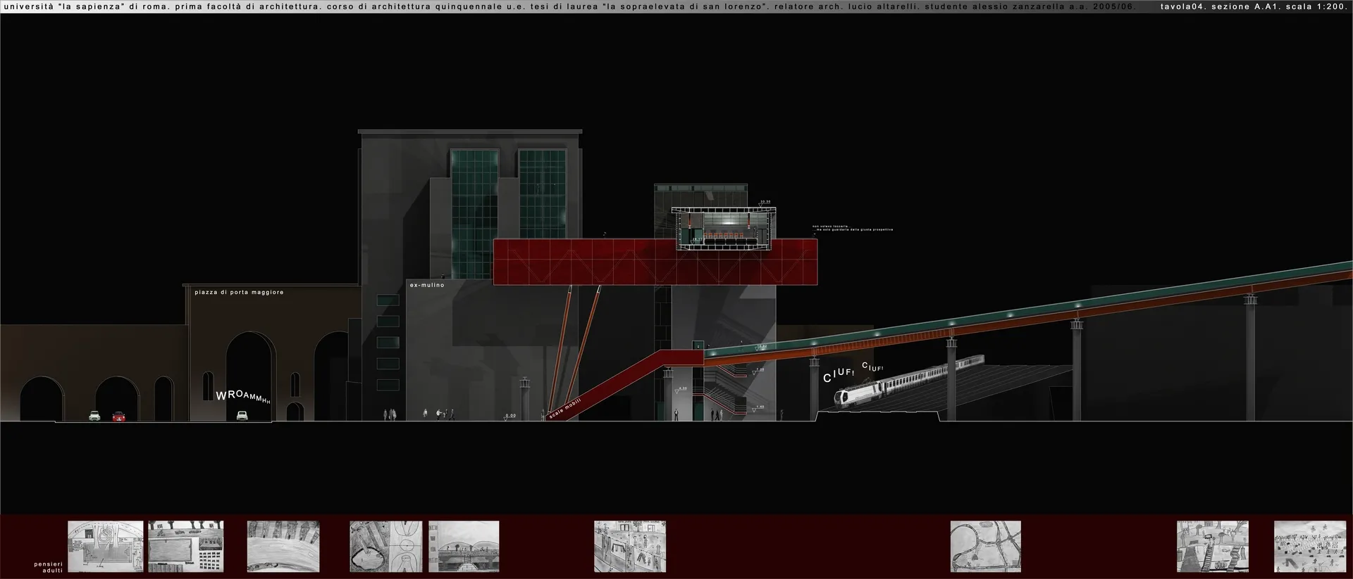 In questo contesto nasce la mia tesi, che tratta un tema che poi verrà approfondito nel progetto delle High Lines di New York dagli architetti Diller Scofidio + Renfro. Infatti il sistema architettonico è un impianto polifunzionale dedicato alle performance artistiche e alle arti in generale, localizzato a Roma sull'ingresso alla TANGENZIALE EST e collocato in una dimensione temporale futuribile in cui la famosa sopraelevata, elemento urbano spesso ricorrente nella storia del cinema post-moderno italiano, è diventata pedonale ed è percorsa a piedi solo per ammirare il dolce panorama della città eterna. L'edificio pone le sue fondamenta nell'ingresso alla tangenziale da Porta Maggiore, quasi "appoggiandosi" sugli edifici ormai un po’ usurati da un esistenzialismo urbano depresso, spezzando la continuità dell'asfalto con la rete della viabilità romana e rendendola raggiungibile solo a piedi per mezzo dell'ascensore o del vano scala.