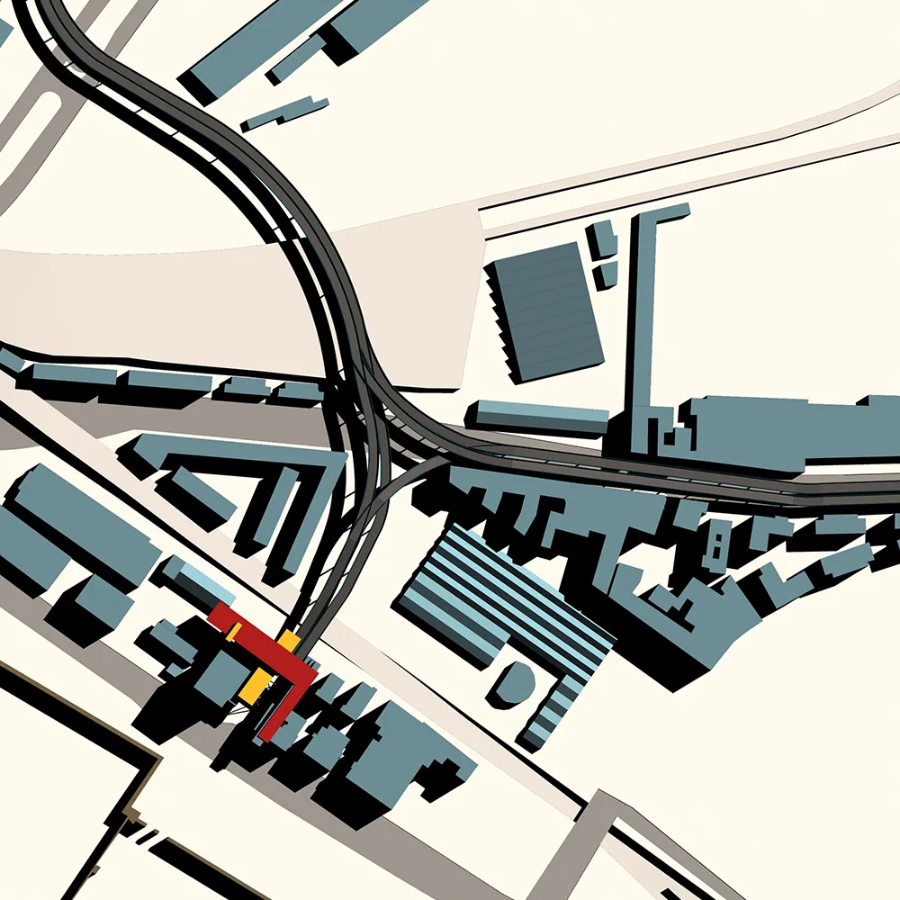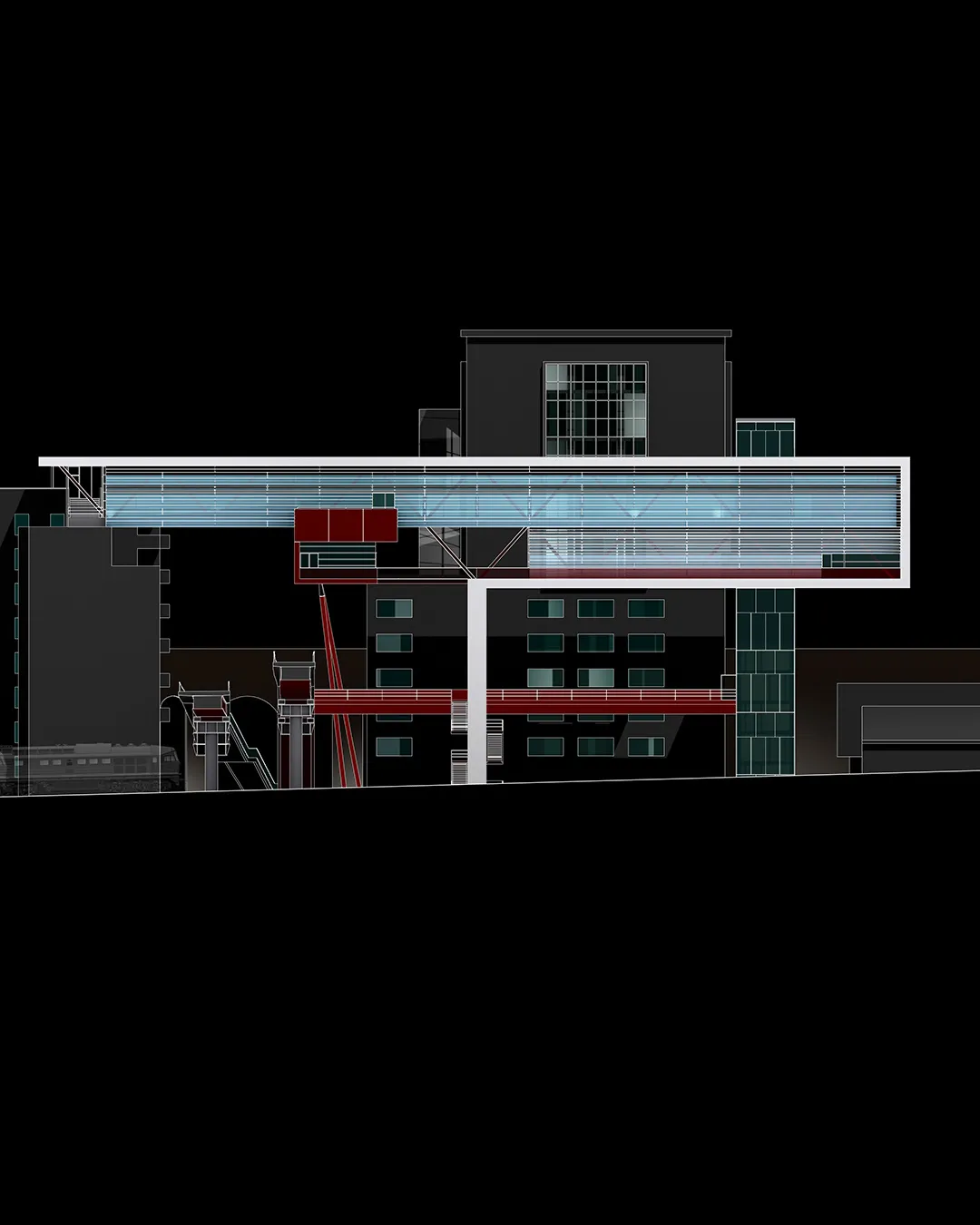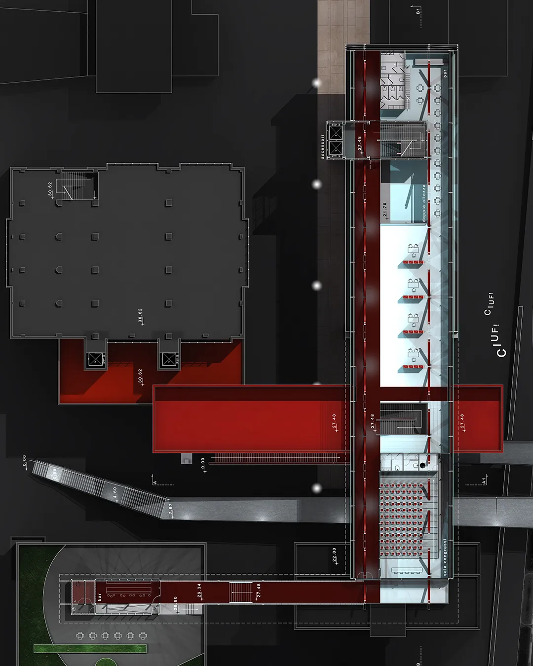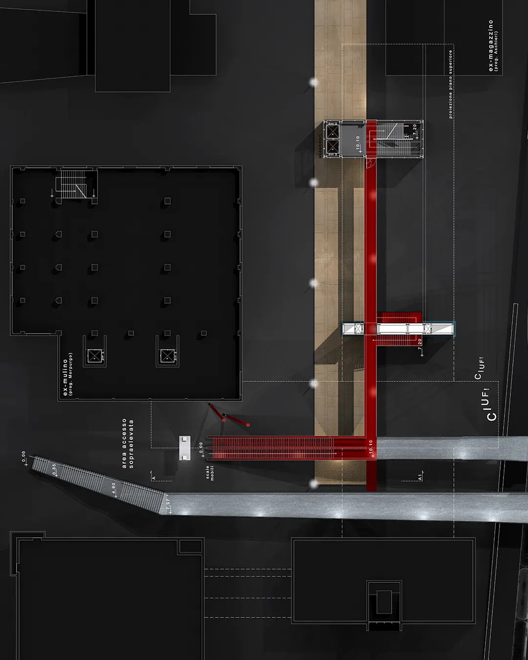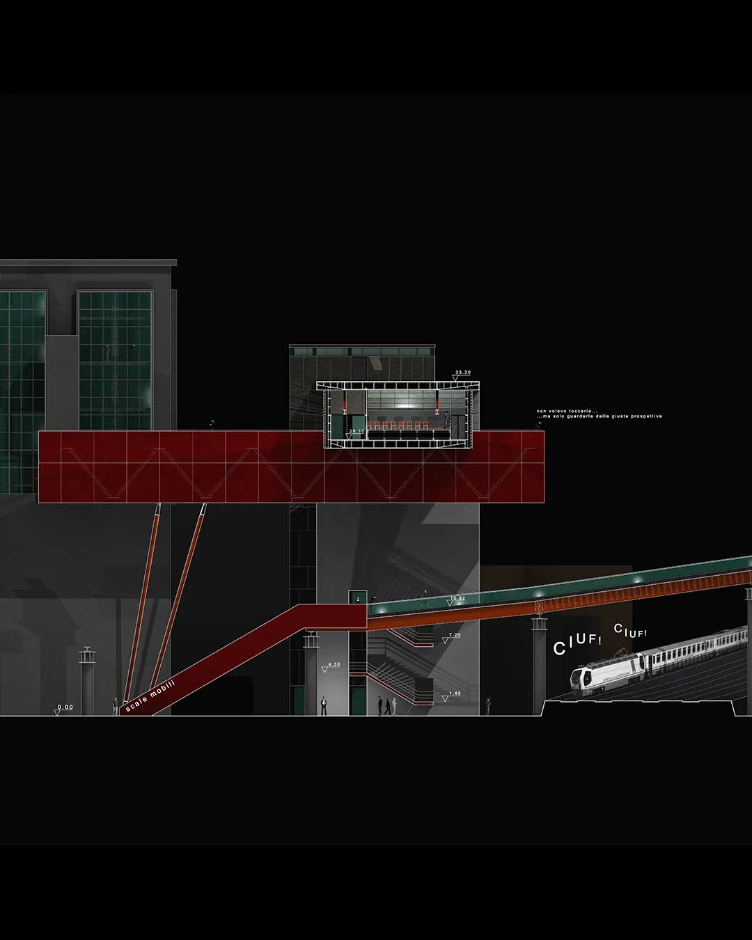 In questo contesto nasce la mia tesi, che tratta un tema che poi verrà approfondito nel progetto delle High Lines di New York dagli architetti Diller Scofidio + Renfro. Infatti il sistema architettonico è un impianto polifunzionale dedicato alle performance artistiche e alle arti in generale, localizzato a Roma sull'ingresso alla TANGENZIALE EST e collocato in una dimensione temporale futuribile in cui la famosa sopraelevata, elemento urbano spesso ricorrente nella storia del cinema post-moderno italiano, è diventata pedonale ed è percorsa a piedi solo per ammirare il dolce panorama della città eterna. L'edificio pone le sue fondamenta nell'ingresso alla tangenziale da Porta Maggiore, quasi "appoggiandosi" sugli edifici ormai un po’ usurati da un esistenzialismo urbano depresso, spezzando la continuità dell'asfalto con la rete della viabilità romana e rendendola raggiungibile solo a piedi per mezzo dell'ascensore o del vano scala.