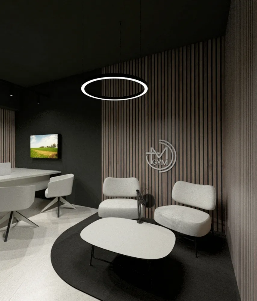 Presentazione di una proposta dello spazio "COACHING", interno alla palestra TMGYM, i cui lavori sono stati completati ad aprile di quest'anno (vedi LINK per scoprire il progetto completo). Lo spazio "COACHING" che costituisce l'ufficio privato di Tony Mancino, proprietario della palestra, è l'unico ambiente in cui ancora non sono stati effettuati lavori, in attesa di definirne meglio la sua funzione. Avendo una metratura piuttosto limitata, ho tentato di dilatare lo spazio sulla direttrice verticale, rivestendo le pareti a tutta altezza con i wood panels by Woodupp, già utilizzati anche nelle altre aree della palestra, per determinare una certa continuità stilistica; così come la pavimentazione in resina taupe-chiaro, anch'essa già adoperata nelle altre aree. Caratteristiche di questo piccolo spazio ufficio sono: l'inserimento di una superficie trattata a "giardino verticale", tanto voluta dal cliente; la creazione di una scrivania su misura illuminata con binario elettrificato; infine l'angolo podcast, con una sospensione led "a corona", utile per le dirette social.