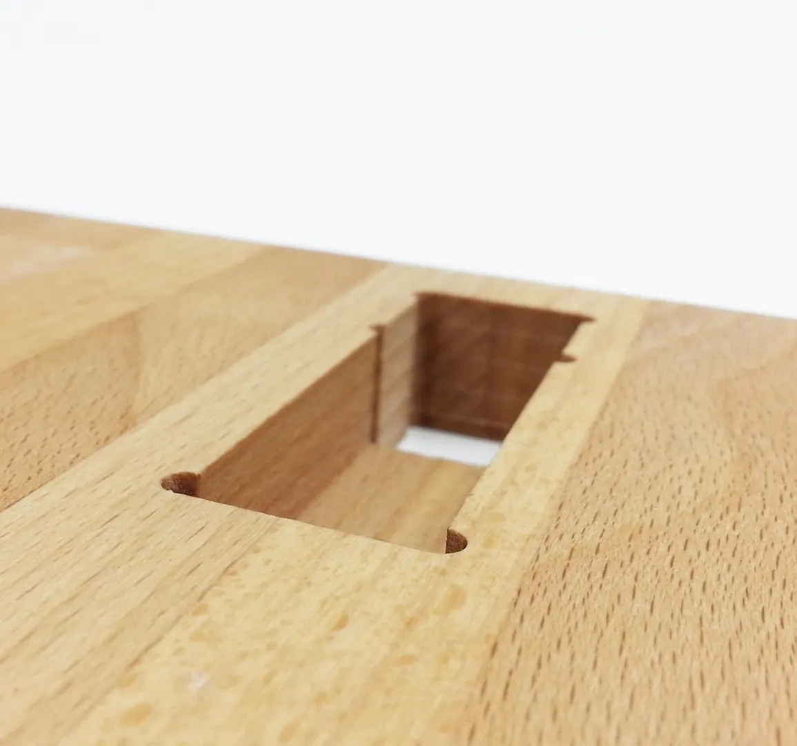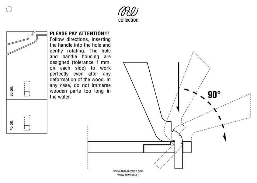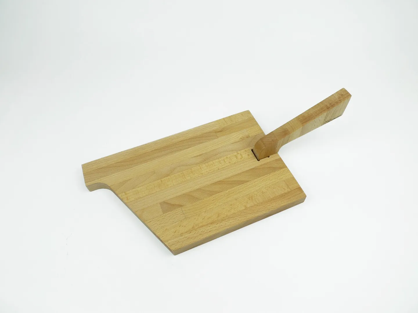 "SKERU" è un tagliere provvisto di manico, che è stato da me ideato con il presupposto di produrre entrambe le forme (il piano orizzontale + il manico) da un unico massello di legno da 3 cm. Concepito in 2 misure da 30 e 45 cm, "SKERU" è lavorato a controllo numerico e ha una linea di produzione che prevede uno spreco quasi nullo, nel senso che già il pannello di legno lamellare all'origine è sezionato in modo da sfruttare al massimo le sue dimensioni. Il manico di ciascun tagliere, seguendo lo stesso principio, è ottenuto dalla sezione rispettiva e studiato in modo tale che possa alloggiarsi nella superficie del tagliere, passando per il traforo sagomato anch'esso con controllo numerico. Lo spicchio di legno rimanente dalla lavorazione viene poi utilizzato incollandolo nel suo packaging (della serie “non si butta via nulla”) per garantirne stabilità e ridurre più possibile il movimento dell'oggetto durante il trasporto. Nell'illustrazione viene esemplificato il movimento rotatorio del manico durante il suo inserimento nel piano orizzontale.