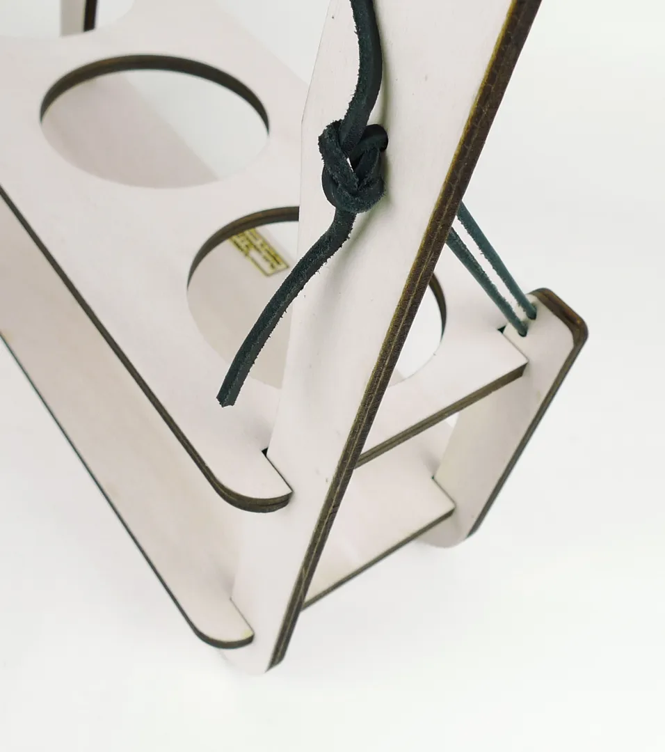 Quando ho ideato "SUITKA" ho pensato a tutte le occasioni in cui mi sono trovato a dover regalare 3 buone bottiglie di vino, senza sapere come poterle presentare, se non con la solita scatola di cartone che una volta aperta è pressoché inutilizzabile. Così nasce questo progetto, dall'esigenza appunto di voler trovare un sistema carino, efficiente, comunque a basso costo, per trasportare al sicuro delle bottiglie. "SUITKA" è una suitcase per trasportare, grazie al suo comodo manico, elementi cilindrici: quindi bottiglie, piccoli vasi oppure riviste arrotolate; ma proprio grazie alla feritoia del manico, "SUITKA" può anche essere appesa a parete diventando un porta-oggetti funzionale non solo per un utilizzo temporaneo come "trasportino". Così come "SKERU", anche "SUITKA" è stata disegnata sfruttando al massimo la dimensione originaria del materiale multistrato di betulla spessore 6 mm. Infatti anche in questo caso non vi è alcun spreco di materiale, se consideriamo che anche la sagoma del pannello restante dal taglio a laser, una volta incollata nel packaging, garantisce una trasportabilità impeccabile dell'oggetto, diventandone l'alloggiamento. Anche "SUITKA" è un oggetto montabile fai-da-te incastrando i vari pezzi che lo compongono e tenendoli insieme grazie a dei laccetti in cuoio in dotazione anch'essi all'interno della scatola.