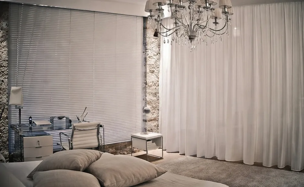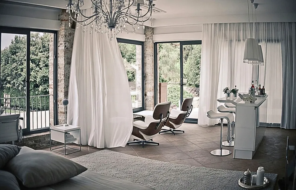 Ma non solo; il controsoffitto, completo di gole e ribassamenti, ha determinato gli spazi utili di alloggiamento per le tende divisorie: quella che chiude il guardaroba a destra del camino e quella che divide trasversalmente i 2 ambienti principali, la zona letto e la zona bar, in cui successivamente sono state posizionate le 2 "Lounge Chair & Ottoman" (comprese di pouff) by Vitra, disegnate dai designer marito e moglie Charles Eames Jr. and Ray-Bernice Eames.