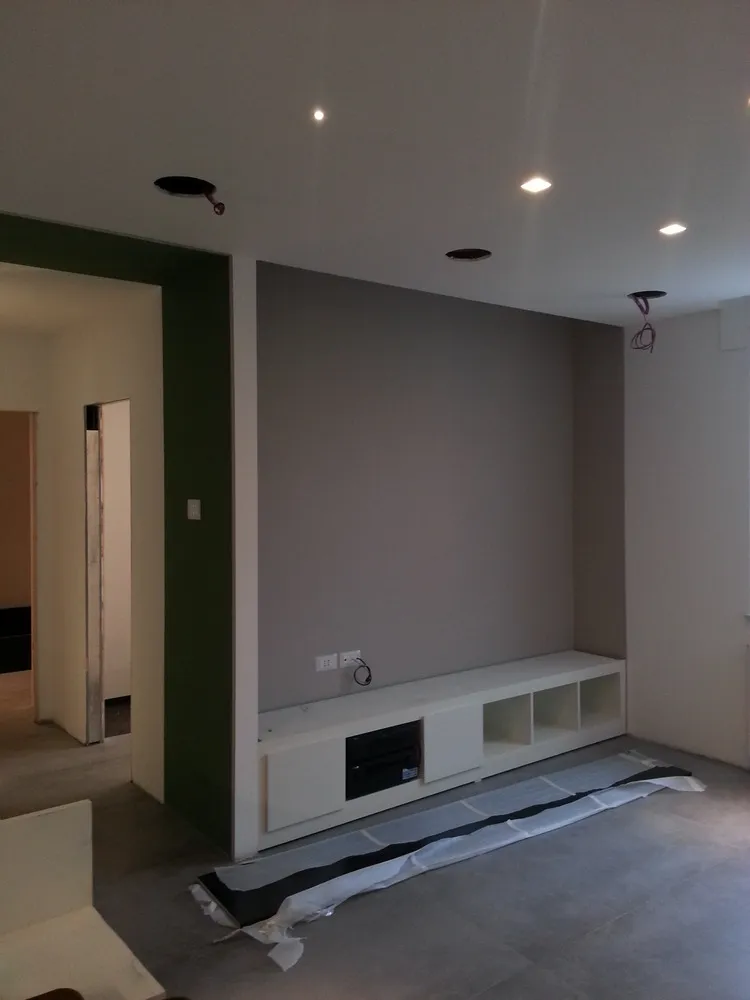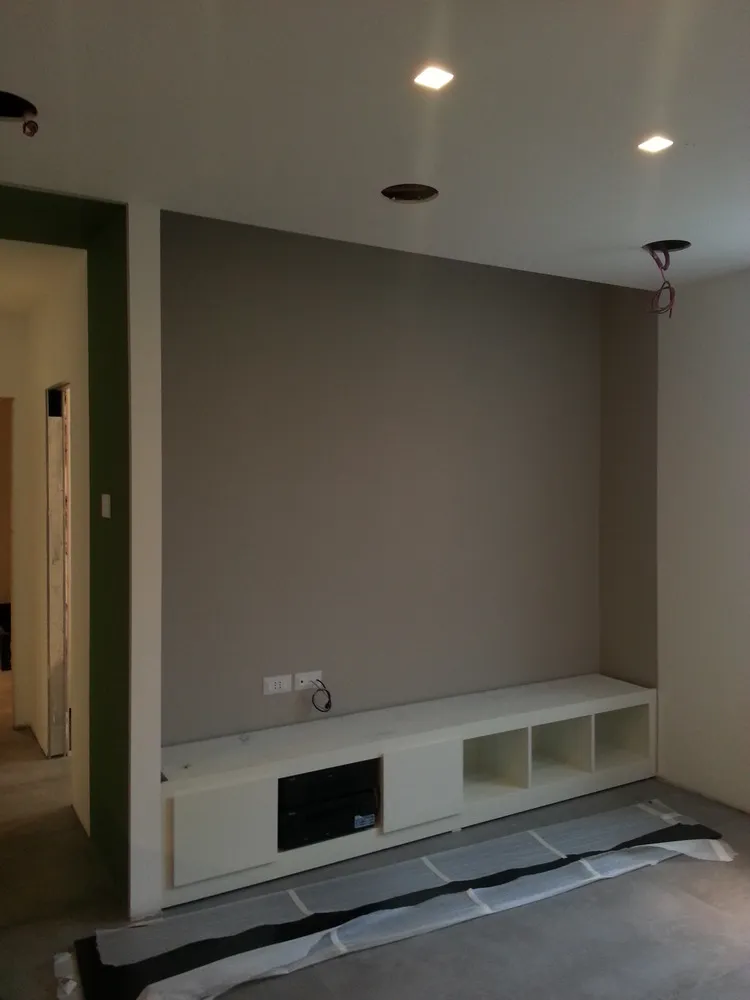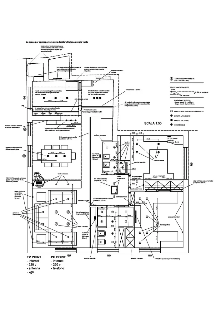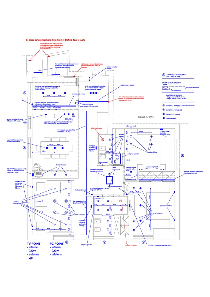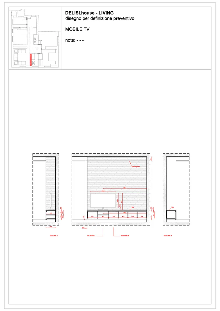 Anche l’angolo TV è stato progettato come parte integrante delle geometrie dell’ambiente. In questo spazio ho ideato un mobile basso su misura, perfettamente integrato nella muratura, valorizzato da una elegante gola luminosa superiore che diffonde una luce morbida con effetto wall-washing. Dedico sempre particolare attenzione alle dimensioni del mobile TV: la sua altezza, infatti, è determinante per garantire un corretto centro di osservazione dello schermo. Questo deve essere accuratamente calibrato in relazione sia alle dimensioni del televisore sia alla distanza del divano frontale, al fine di assicurare il massimo comfort visivo. Di seguito sono illustrate tutte le fasi di realizzazione del progetto.