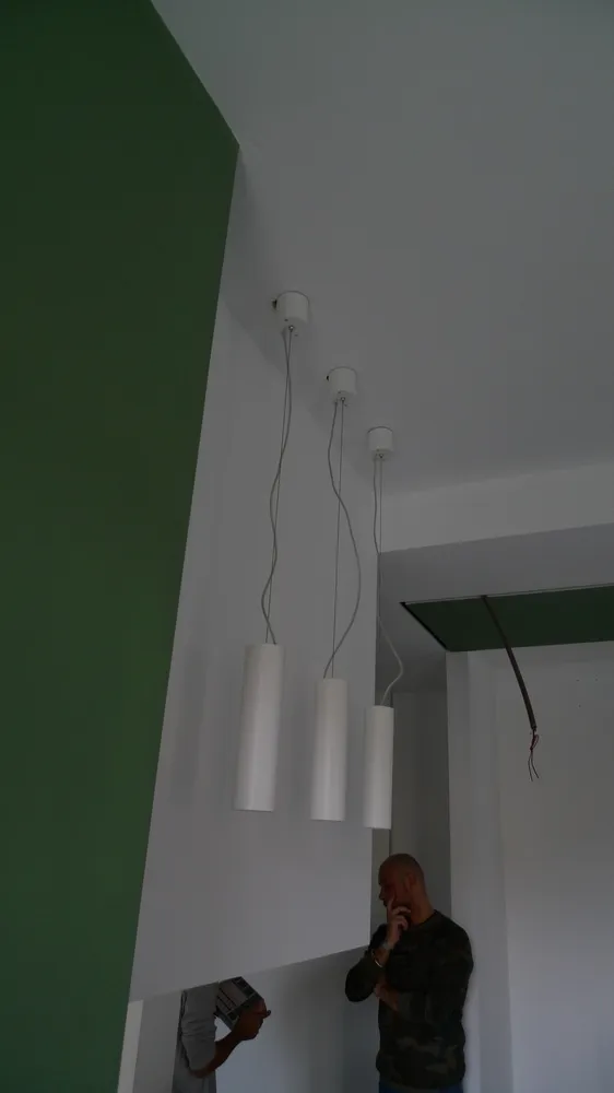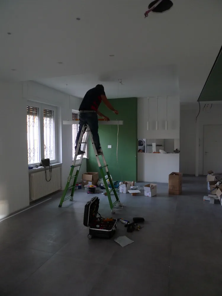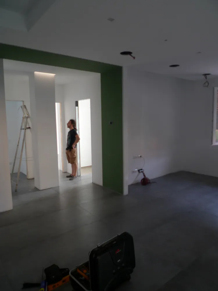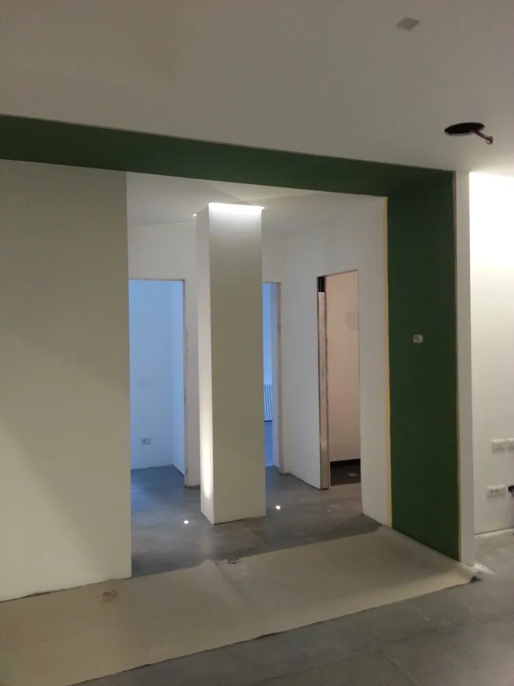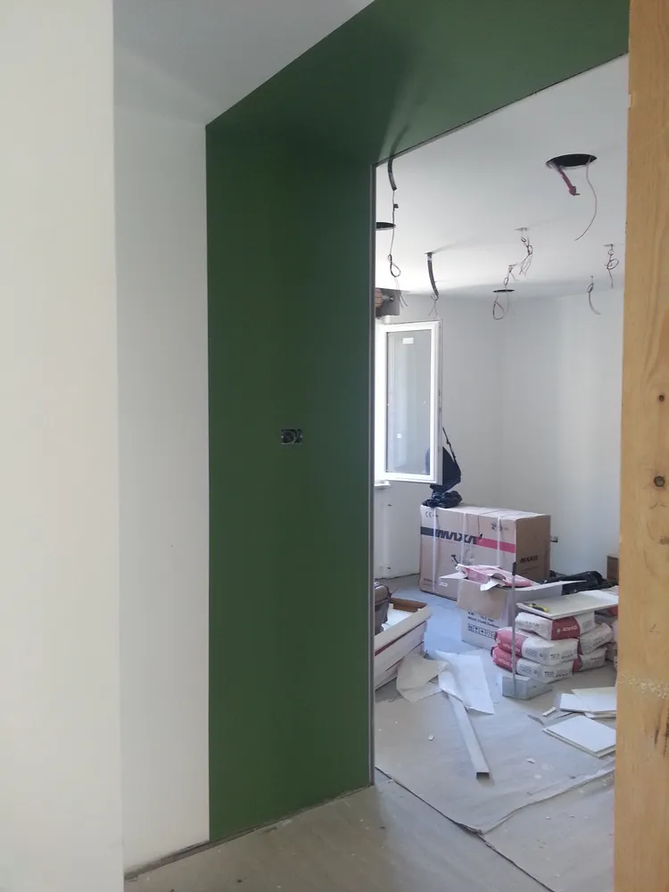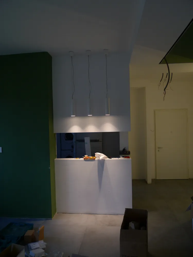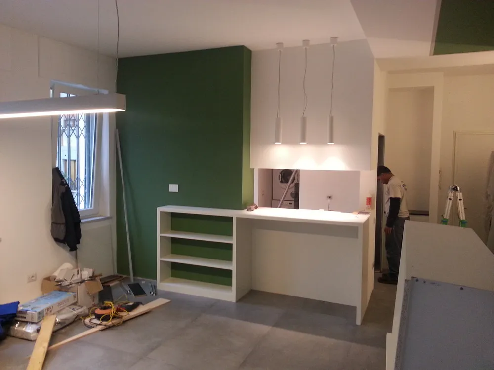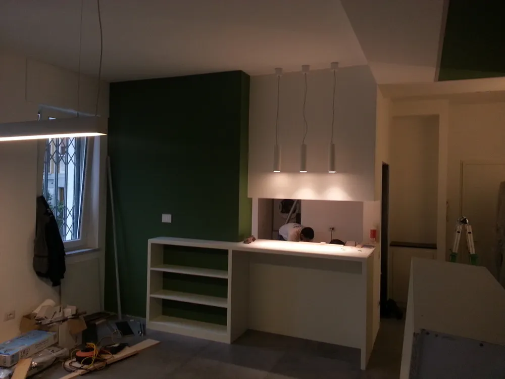 A un certo punto, l’avanzamento del cantiere ha subito una significativa accelerazione: nel giro di poche settimane sono stati completati pavimenti, cartongessi e pitture. Durante una visita in cantiere ho finalmente potuto apprezzare in modo più concreto la materializzazione delle mie idee progettuali. In una delle foto si intravede anche la proprietaria della residenza, visibilmente colpita dalla “lingua verde”, elemento architettonico distintivo e fortemente caratterizzante dell’intervento (vedi LINK della relativa news). Altri scatti di questa fase mettono in evidenza la grande operosità di tutte le maestranze, coordinate da Epoke, oltre ad alcuni dettagli costruttivi degni di nota, come le gole realizzate in prossimità del pilastro del disimpegno e l’apertura della cucina, dove sarà collocato il bancone snack.