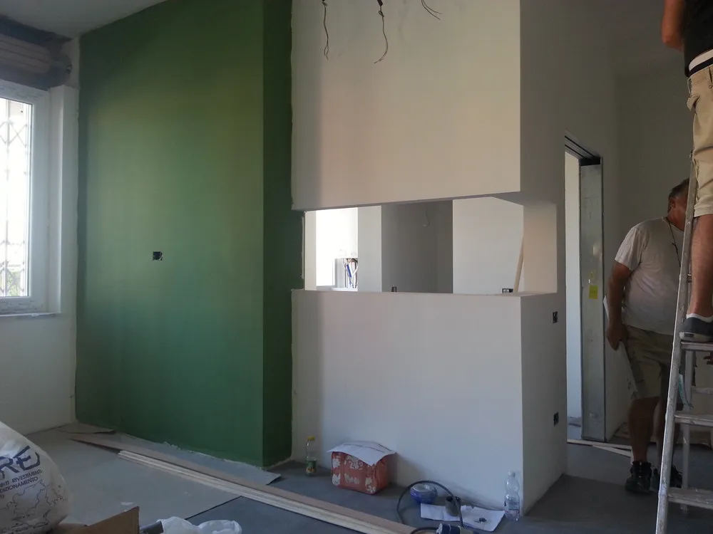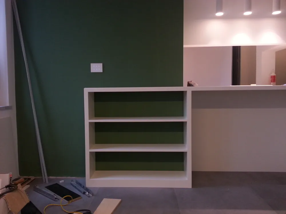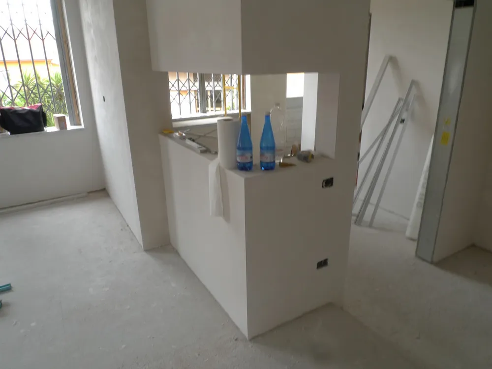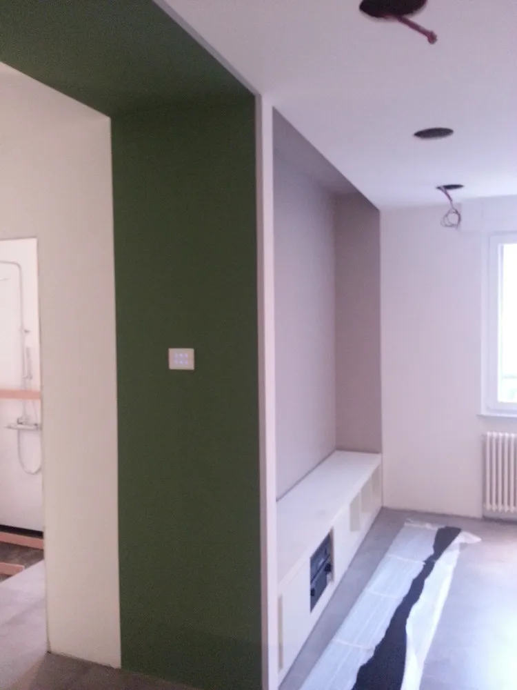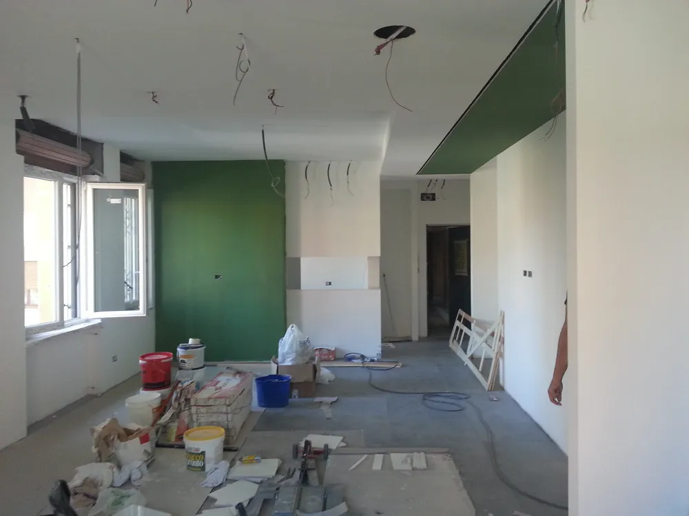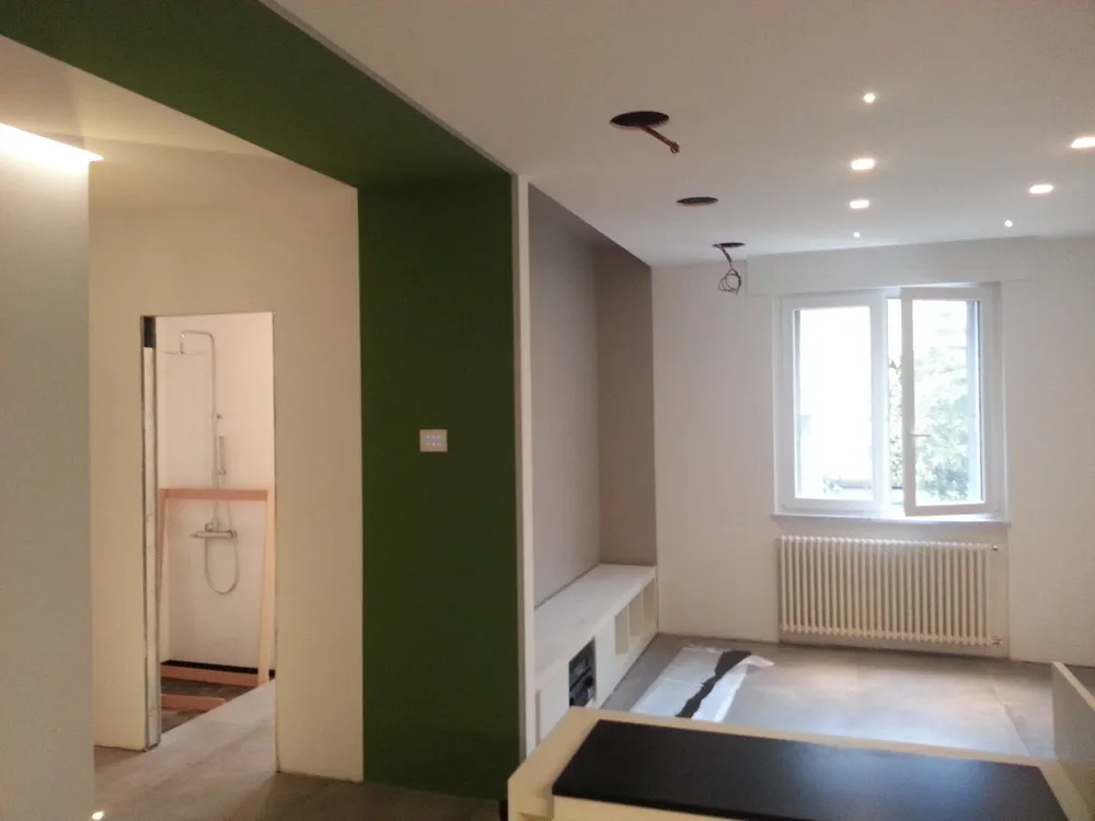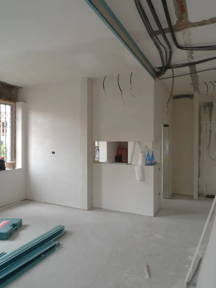 A un certo punto, l’avanzamento del cantiere ha subito una significativa accelerazione: nel giro di poche settimane sono stati completati pavimenti, cartongessi e pitture. Durante una visita in cantiere ho finalmente potuto apprezzare in modo più concreto la materializzazione delle mie idee progettuali. In una delle foto si intravede anche la proprietaria della residenza, visibilmente colpita dalla “lingua verde”, elemento architettonico distintivo e fortemente caratterizzante dell’intervento (vedi LINK della relativa news). Altri scatti di questa fase mettono in evidenza la grande operosità di tutte le maestranze, coordinate da Epoke, oltre ad alcuni dettagli costruttivi degni di nota, come le gole realizzate in prossimità del pilastro del disimpegno e l’apertura della cucina, dove sarà collocato il bancone snack.