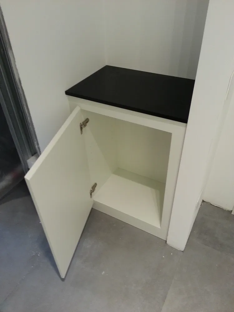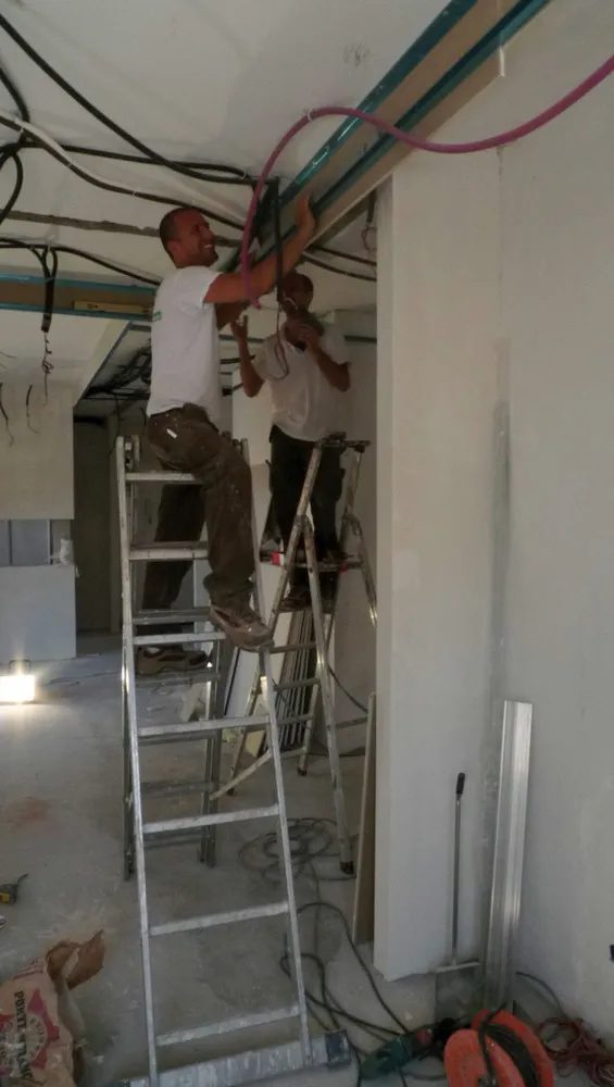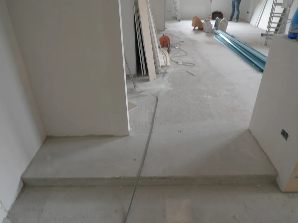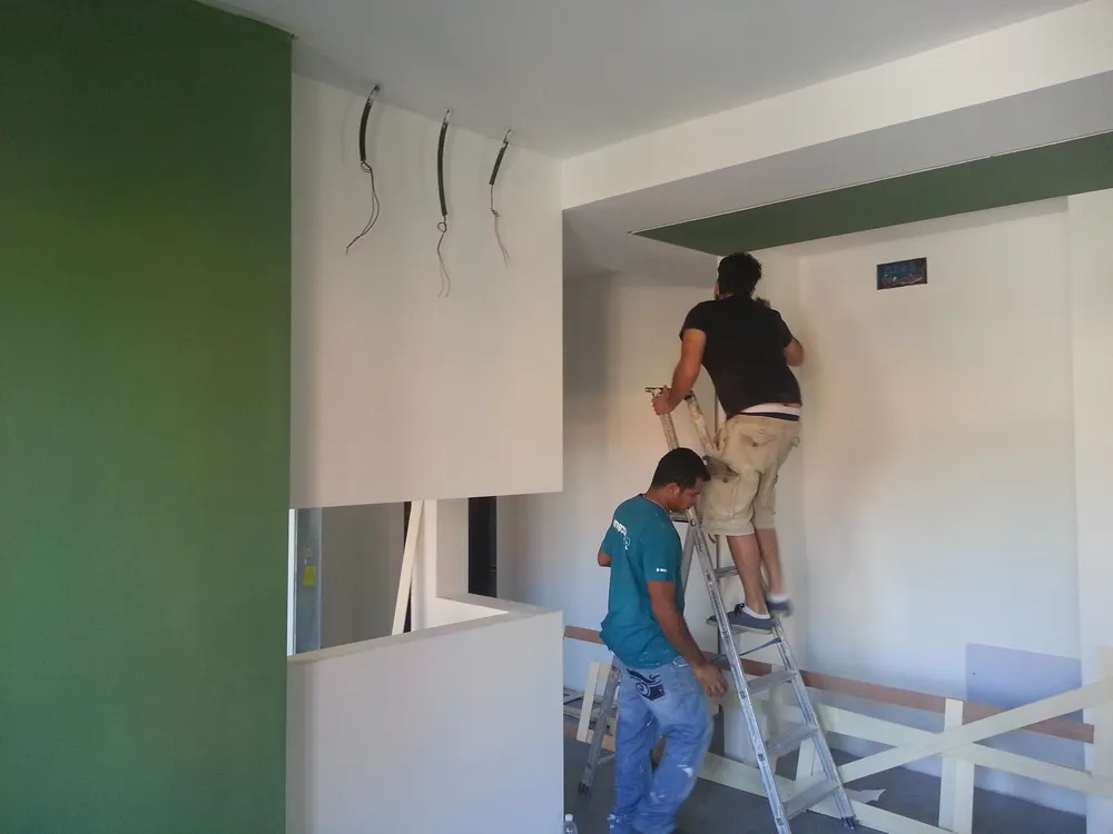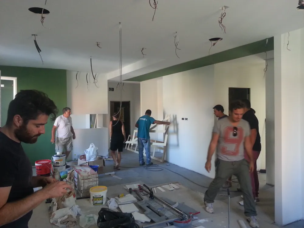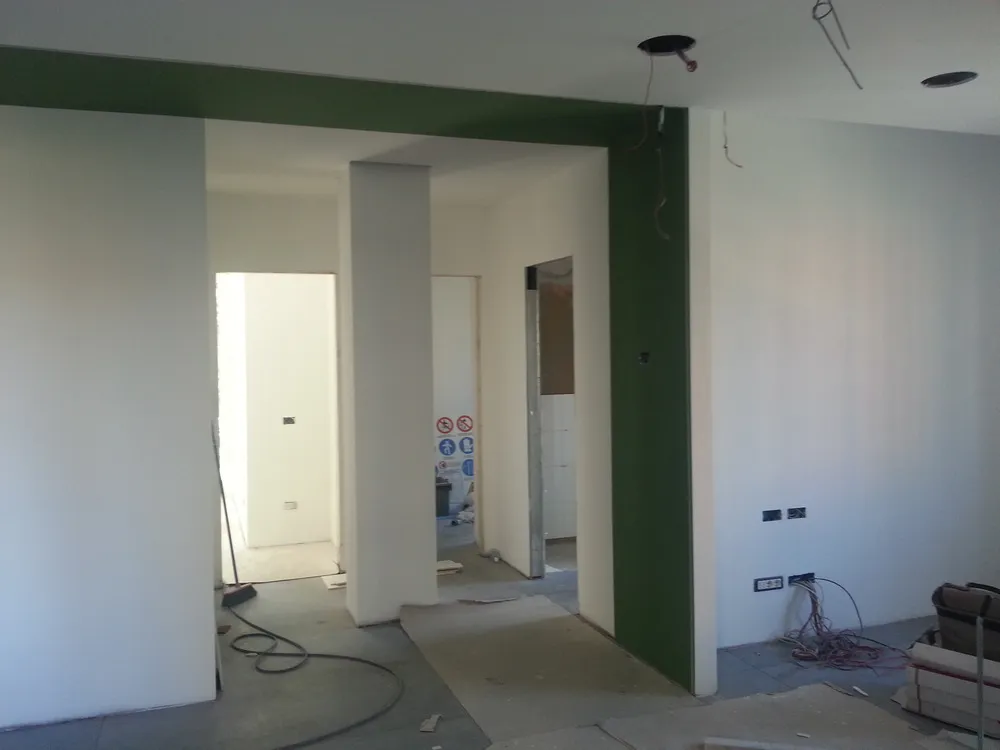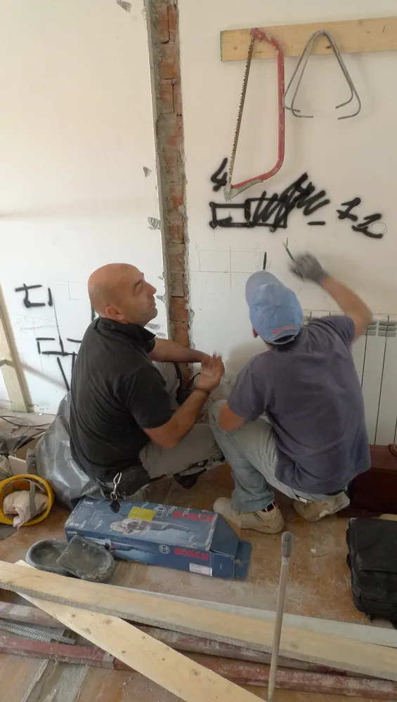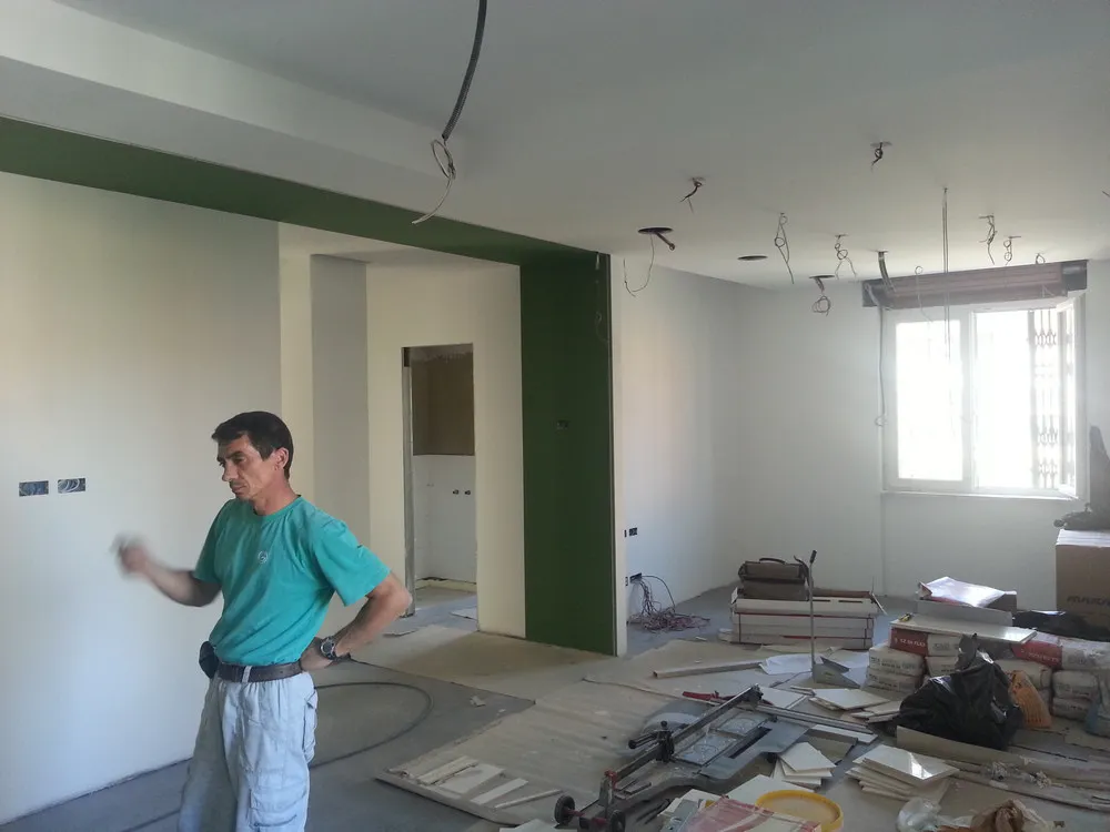 A un certo punto, l’avanzamento del cantiere ha subito una significativa accelerazione: nel giro di poche settimane sono stati completati pavimenti, cartongessi e pitture. Durante una visita in cantiere ho finalmente potuto apprezzare in modo più concreto la materializzazione delle mie idee progettuali. In una delle foto si intravede anche la proprietaria della residenza, visibilmente colpita dalla “lingua verde”, elemento architettonico distintivo e fortemente caratterizzante dell’intervento (vedi LINK della relativa news). Altri scatti di questa fase mettono in evidenza la grande operosità di tutte le maestranze, coordinate da Epoke, oltre ad alcuni dettagli costruttivi degni di nota, come le gole realizzate in prossimità del pilastro del disimpegno e l’apertura della cucina, dove sarà collocato il bancone snack.
