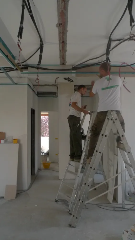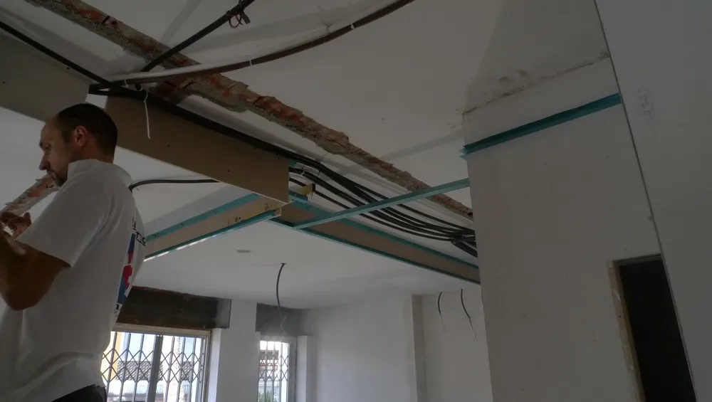 Dato che il progetto è stato concepito per garantire la massima versatilità nella posa degli impianti, prevedendone il passaggio all’interno di un controsoffitto in cartongesso, le immagini illustrano proprio questa fase operativa. Si tratta di un momento particolarmente delicato: sebbene quanto visibile rappresenti solo un passaggio preliminare (poiché la posizione definitiva di uscita dei corrugati viene stabilita solo dopo la realizzazione del controsoffitto) è comunque essenziale prestare grande attenzione. Risulta infatti fondamentale supportare adeguatamente gli impiantisti, affinché possano operare in modo fluido, senza incertezze nella configurazione dei cablaggi.