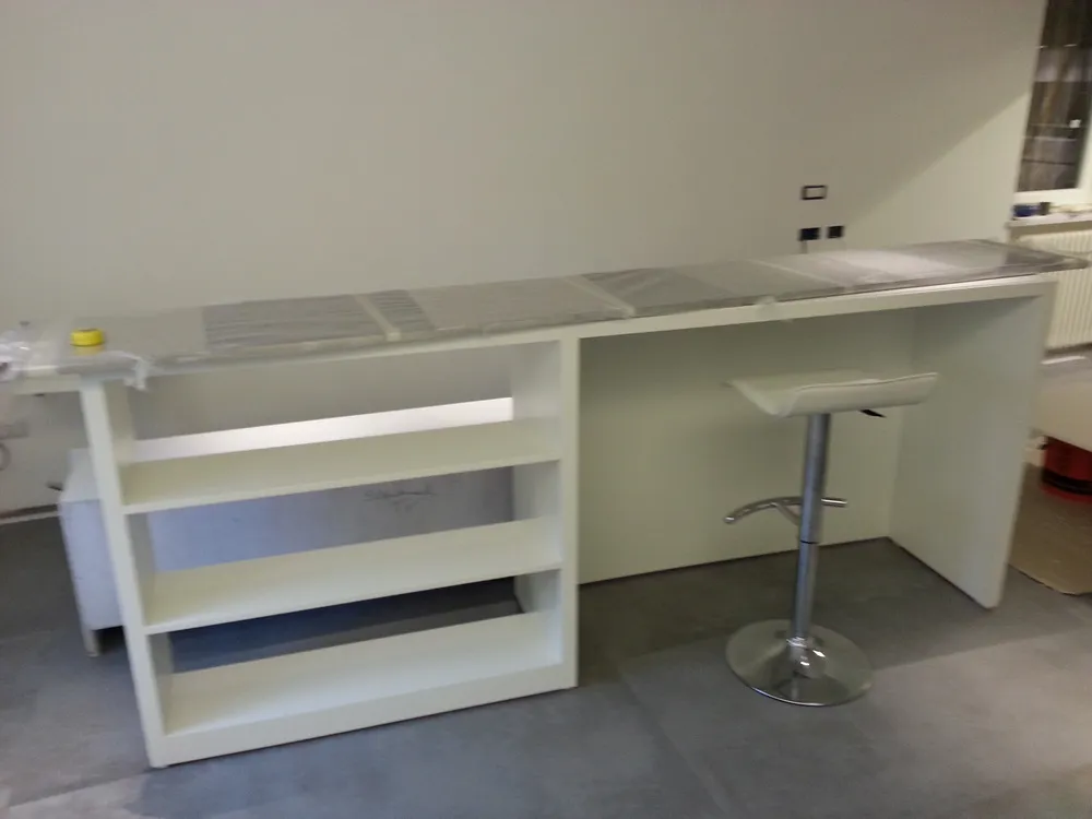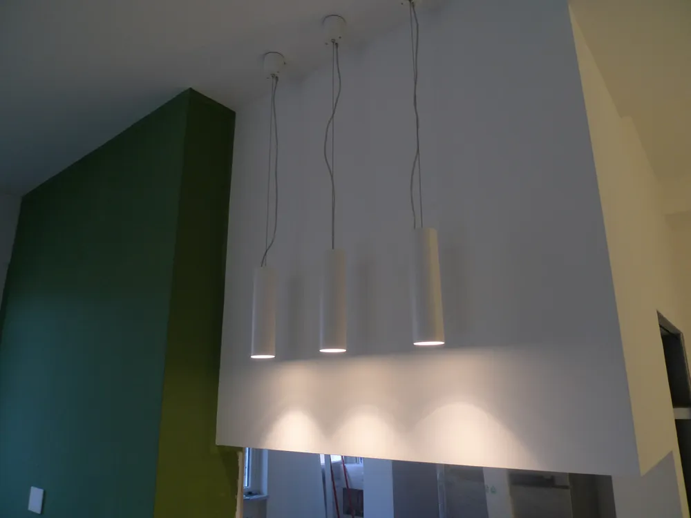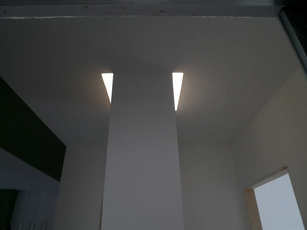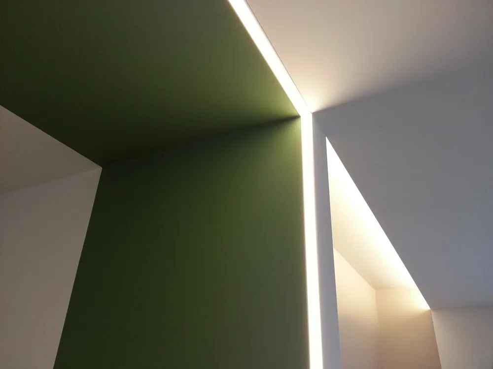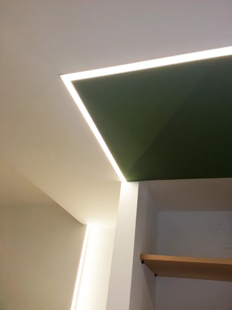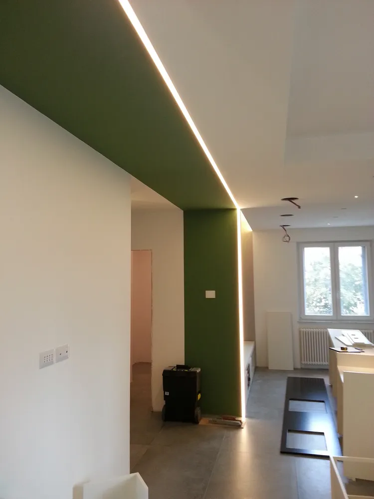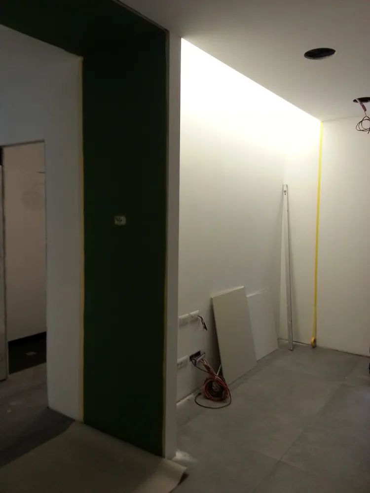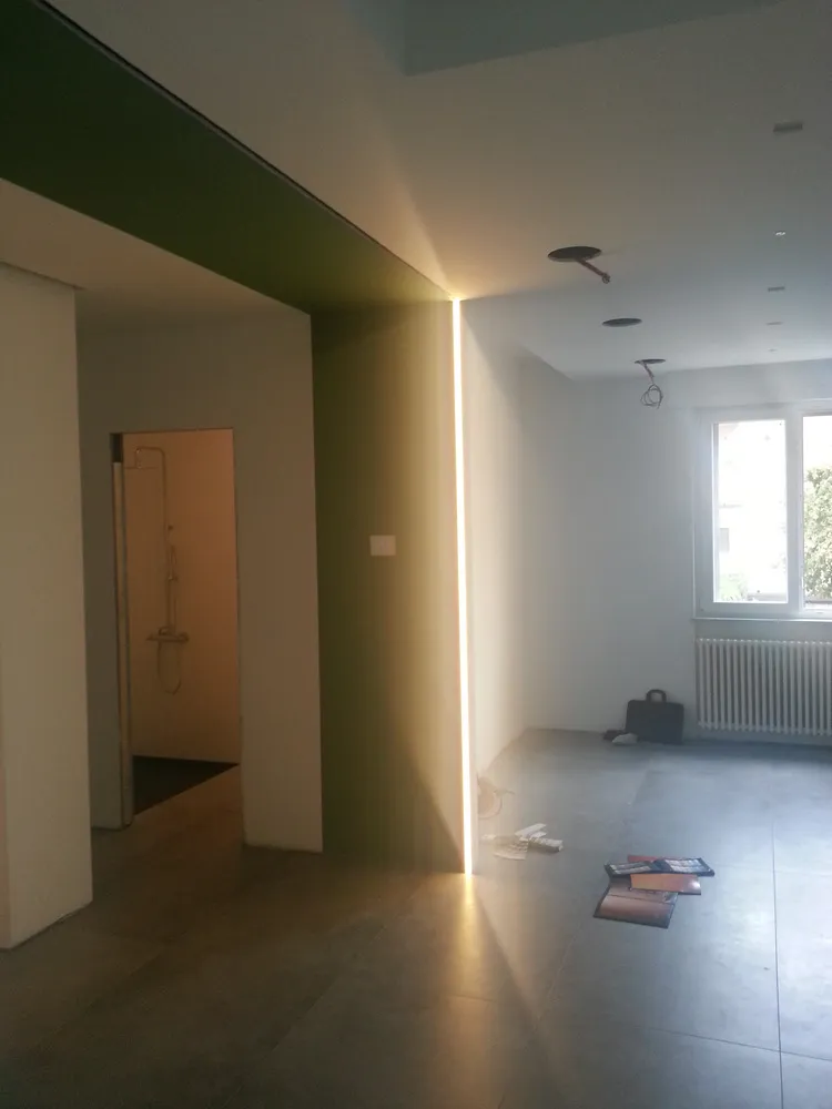 Per completare la fase impiantistica, è stato infine realizzato l'elemento più distintivo del progetto: la linea di luce che incornicia la “lingua verde”. Si tratta di un profilo in alluminio con diffusore opale, incassato e complanare , attraversato da una striscia LED ad alta luminosità, capace di valorizzare e rafforzare il segno architettonico di questo elemento. Nelle immagini si intravedono già anche i primi arredi integrati, installati all’interno degli spazi da me progettati, che iniziano a definire con maggiore chiarezza l’identità complessiva dell’intervento.