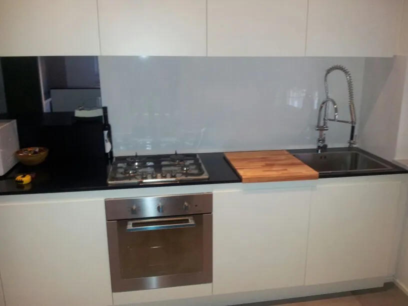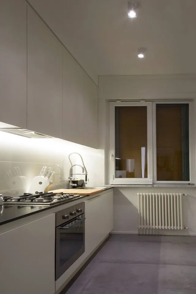 In conclusione, vengono presentate ulteriori immagini relative alla realizzazione in laboratorio della cucina e al suo successivo montaggio nella residenza. Sono inoltre documentati i divani realizzati artigianalmente e fotografati nella loro collocazione definitiva, uno dei due bagni, caratterizzato da linee essenziali, un ulteriore mobiletto integrato nella muratura (quello adiacente alla porta di ingresso all'appartamento) e alcuni arredi della camera da letto, anch’essi progettati e realizzati su misura.