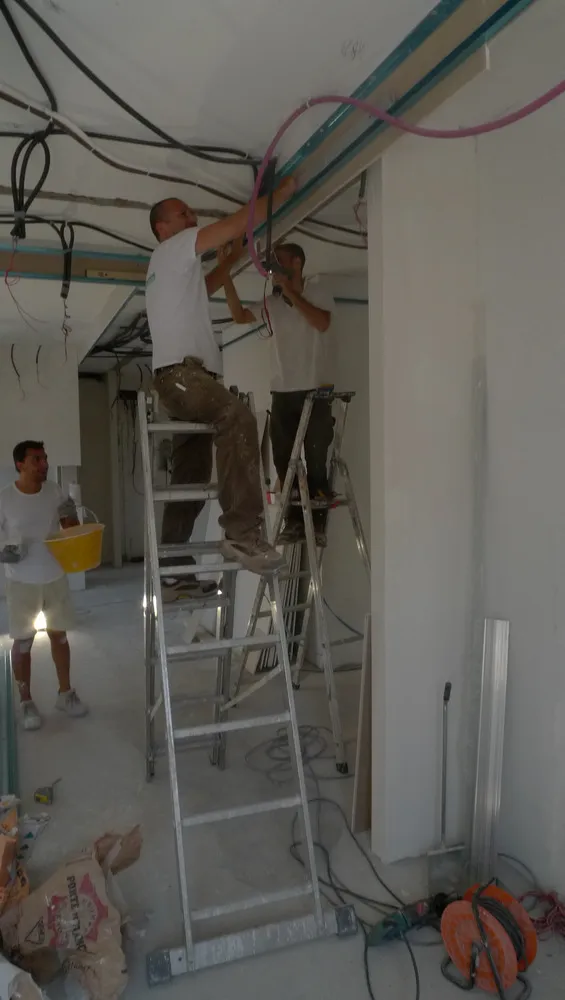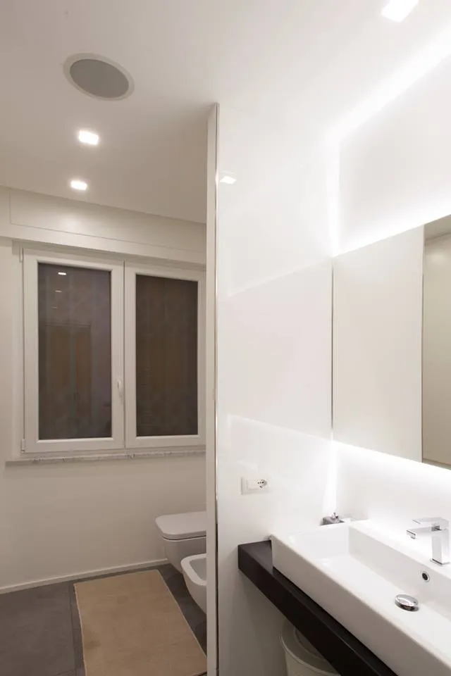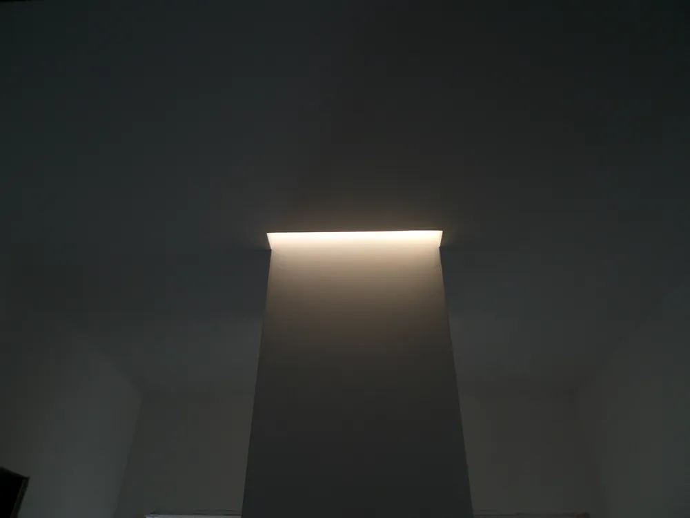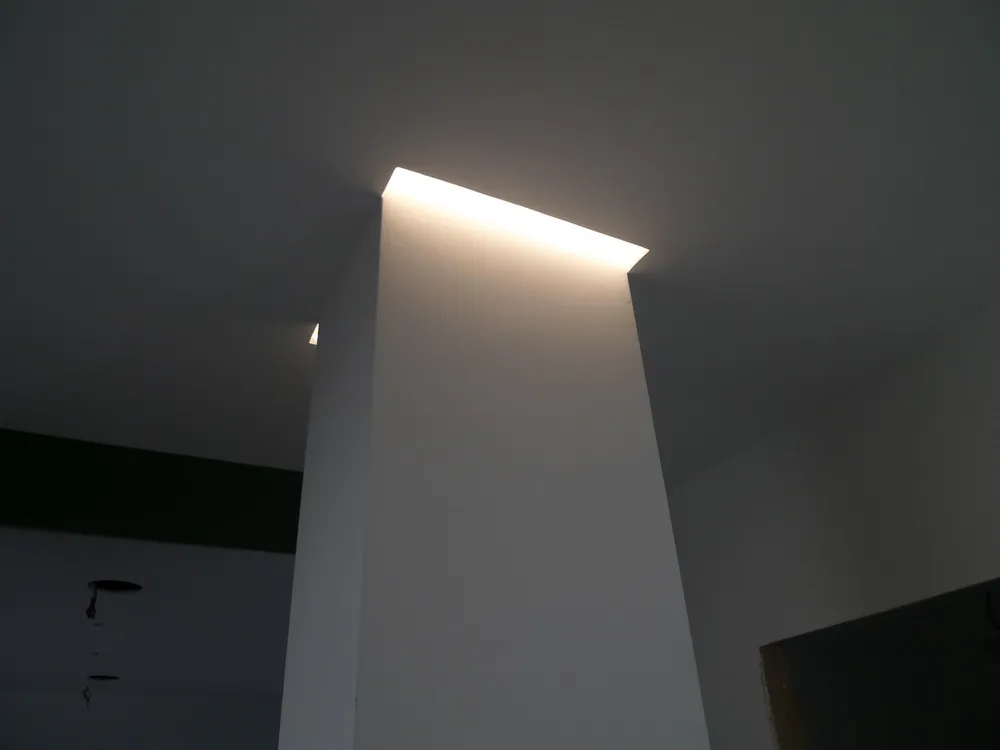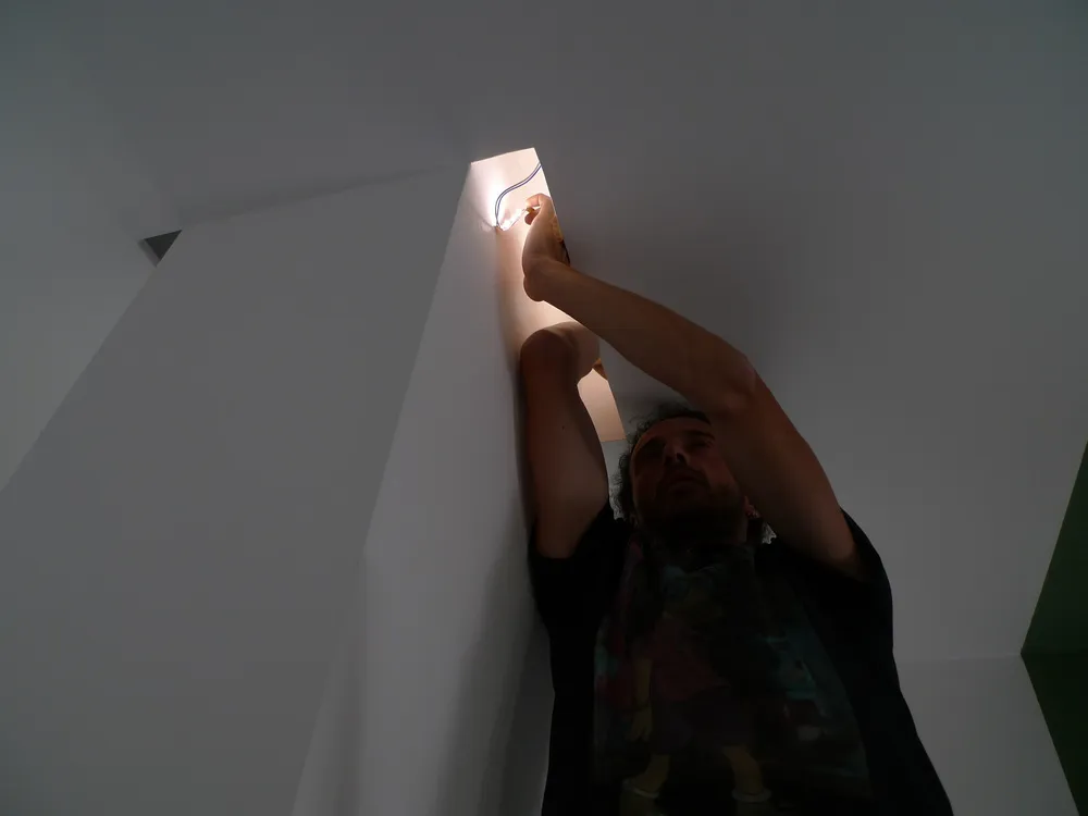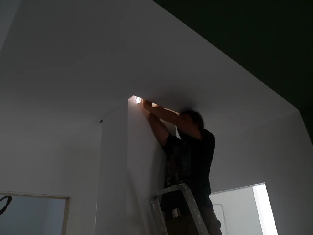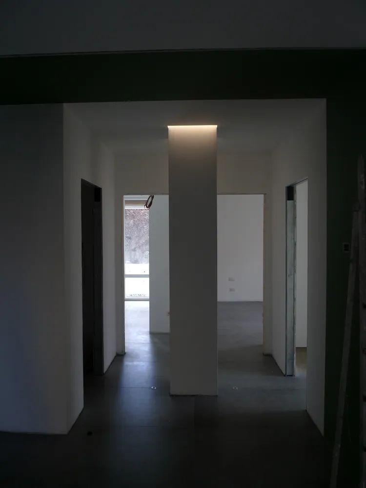 Tengo particolarmente a mostrare, anche attraverso le prossime immagini, quanta dedizione e precisione siano necessarie da parte degli operai affinché ogni elemento venga montato correttamente. In questo caso, ad esempio, uno degli operai è impegnato nell’illuminazione delle gole adiacenti al pilastro del disimpegno. In origine, avrei voluto rivestire il pilastro con una superficie a specchio, così da annullarne completamente la percezione geometrica. Tuttavia, per una serie di vincoli legati al budget, la soluzione realizzata è stata diversa: ho scelto di inserire due gole in corrispondenza dell’attaccatura al solaio, rendendole luminose. Ne risultano due piccoli segni di luce, discreti ma efficaci, che aggiungono un tocco di carattere allo spazio.