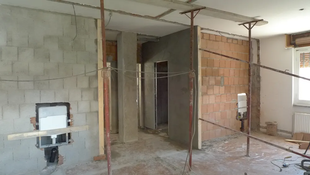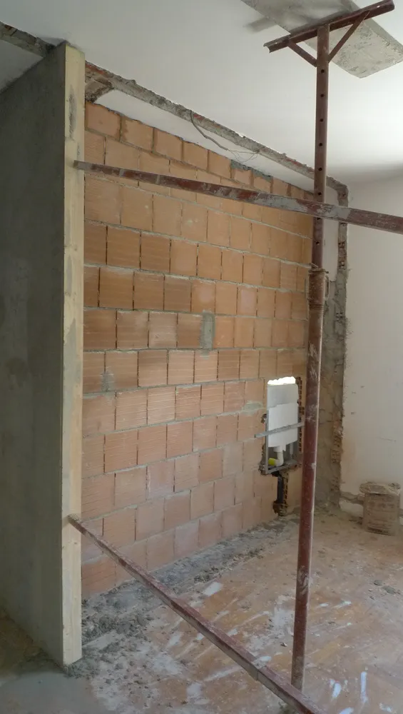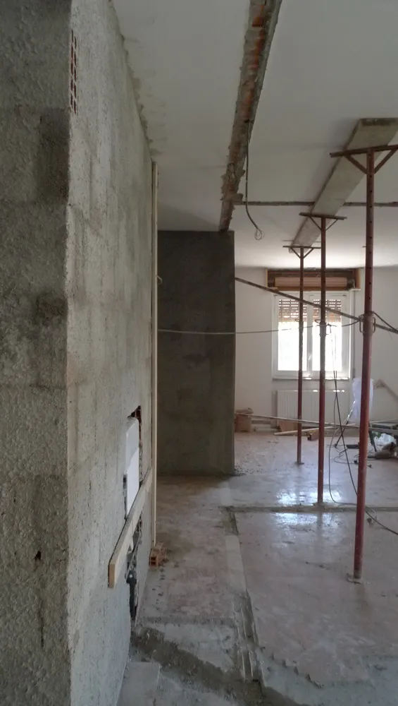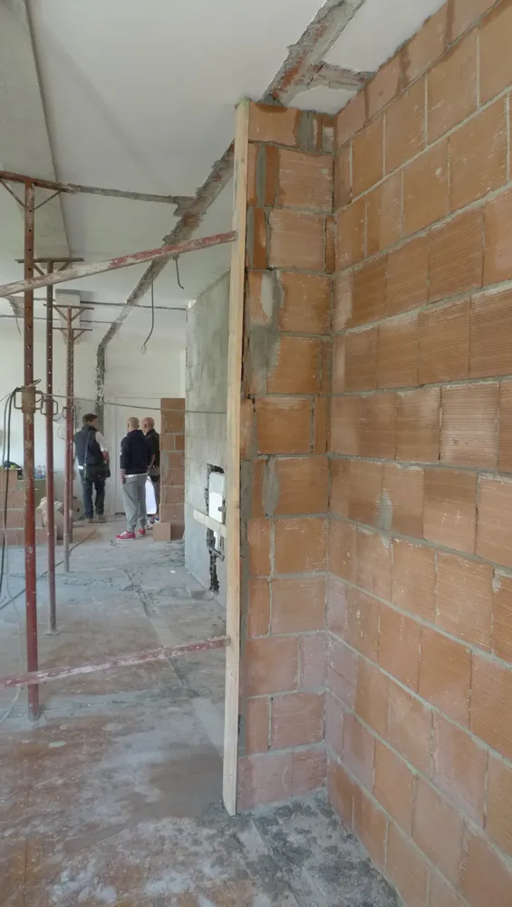 Durante le lavorazioni di muratura ho dovuto prestare particolare attenzione alla definizione dei fili fissi di cantiere, trattandosi di un progetto in cui anche la posa della muratura richiedeva una precisione millimetrica. Per gestire al meglio questa fase, ho spesso ricreato un piccolo “angolo ufficio” direttamente in cantiere, così da poter verificare in tempo reale che l’avanzamento dei lavori fosse perfettamente coerente con quanto previsto dal progetto. Già dopo aver completato intonaci e massetti, le forme del progetto sono ben visibili.