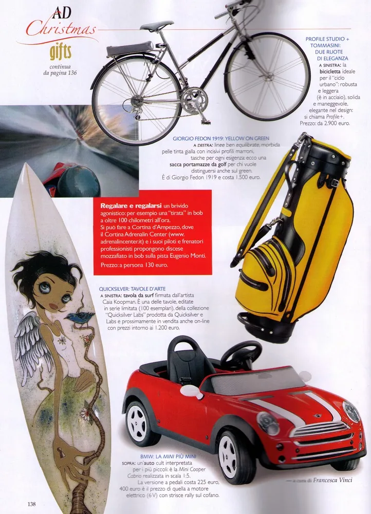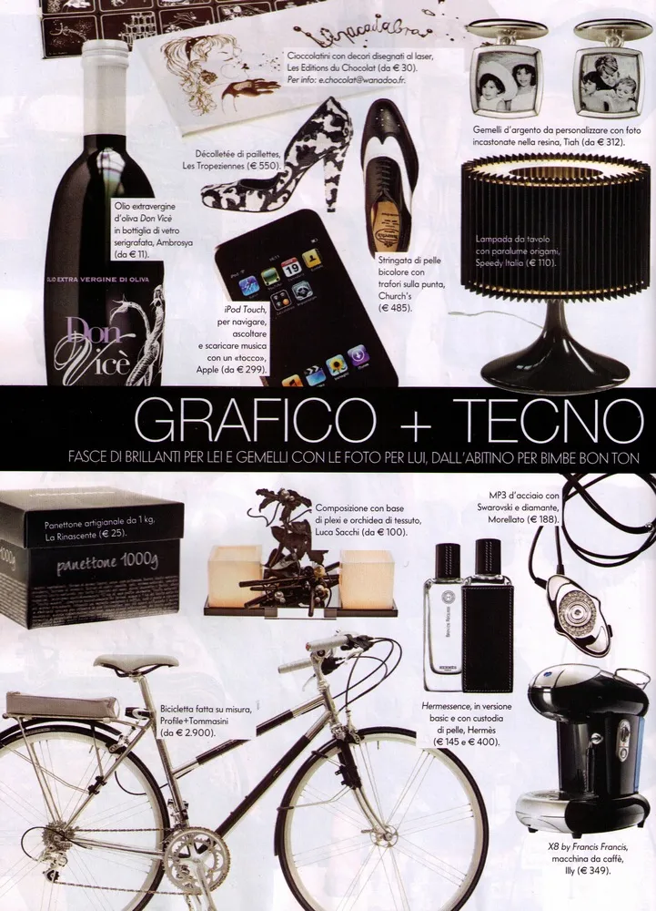 La collezione che abbiamo creato rompe la continuità della visione tradizionale che ha caratterizzato finora il contesto della bicicletta, trasformandola da semplice mezzo sportivo o di locomozione in accessorio complesso, portatore di bellezza, gusto, eleganza. Siamo partiti da uno dei migliori telai in acciaio prodotti in Italia: il Tommasini; oltre ad averne reinventato colori, finiture, mood, per dare vita ad un prodotto completamente customizzabile, nel contempo abbiamo anche ideato una linea di oggetti affini, tra cui alcuni accessori per la bicicletta, una linea di pelletteria in tessuto gommato, alcune valigie in plexiglass e una seggiola da mare.