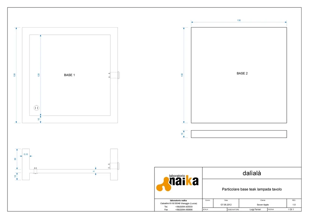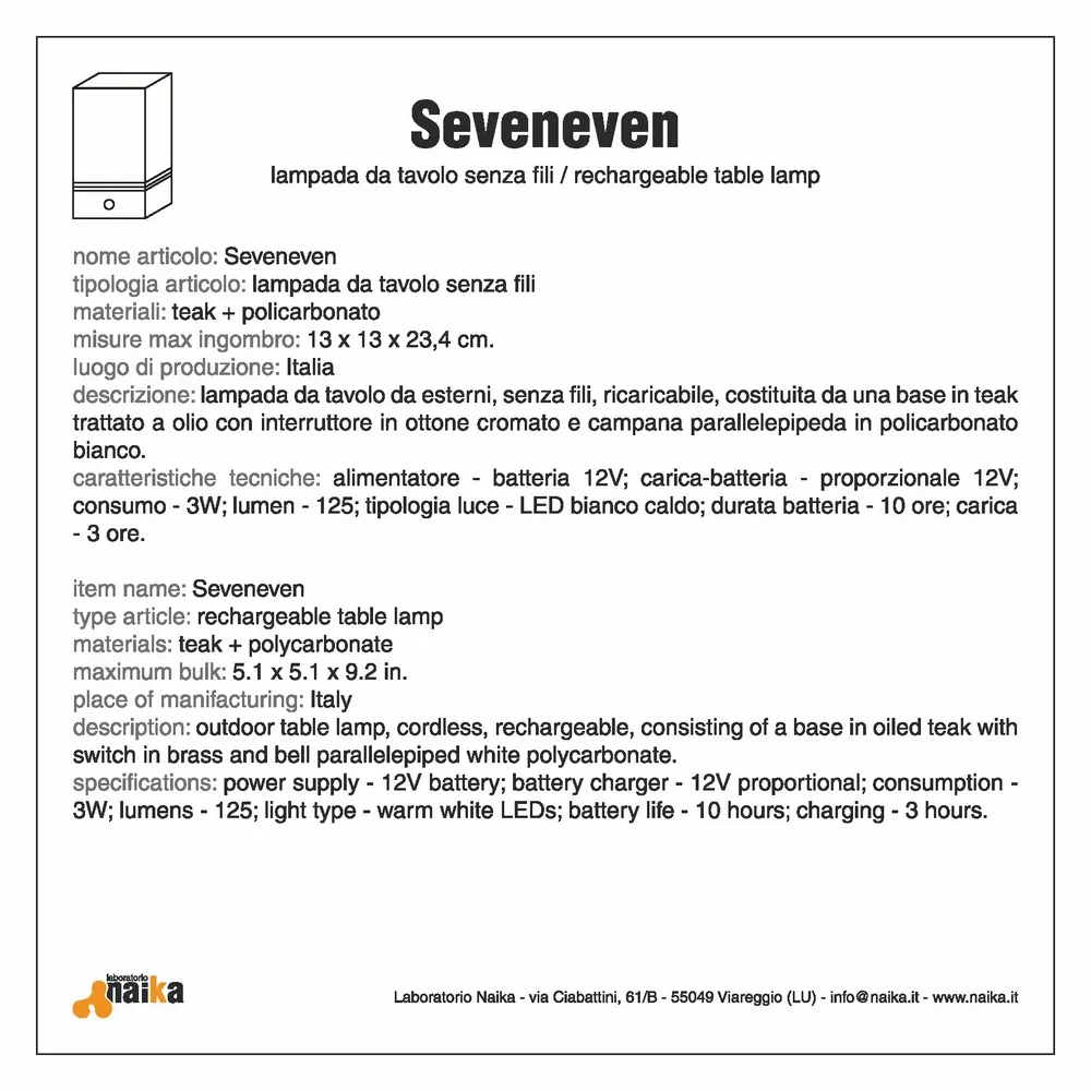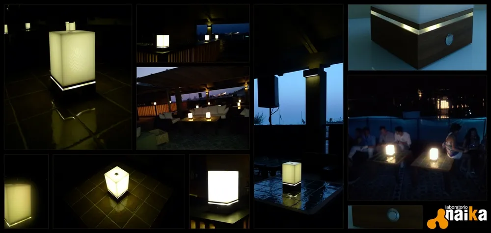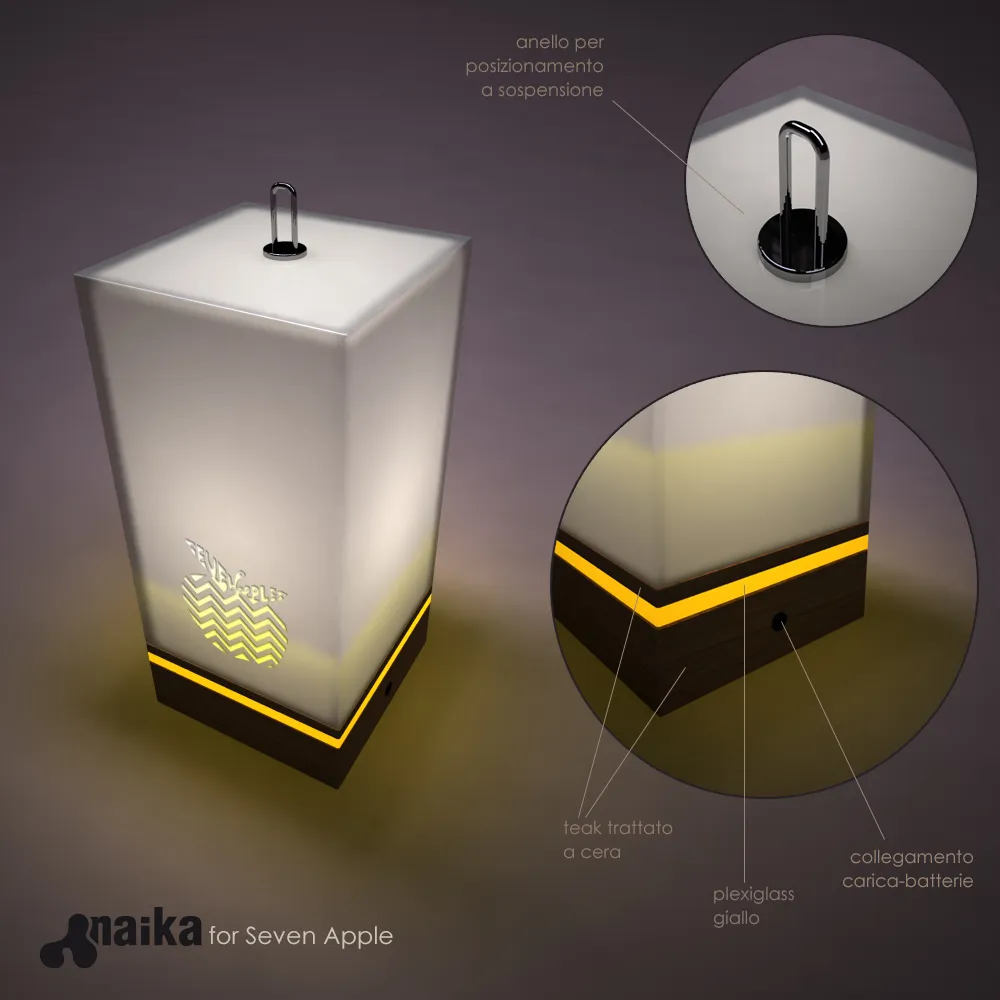 Durante il mio soggiorno toscano, ho avuto modo di collaborare con Epoke srl, un'azienda di Viareggio (LU) che si occupa di illuminotecnica integrata e cablaggi in ambito yatch e imbarcazioni da diporto. Insieme a Luigi Ferrari, titolare di Epoke, ho creato una divisione dell'azienda, dal nome Laboratorio NAIKA, il cui core business è incentrato sulla produzione di lampade artigianali prodotte con processi semi-industriali. I modelli delle lampade NAIKA sono dei "prodotti a catalogo" che in parte possono essere personalizzati. In particolare in questo articolo viene presentata la lampada "SEVEN EVEN LAMP", una lampada wireless ricaricabile con base in teak, pulsante in acciaio aisi 316, testata per la resistenza IP 65, quindi per uso outdoor, con doppia emissione di luce: una dall'intero scatolato in plexiglass opalino e l'altra dallo spessore del pannello in plexiglass traslucido collocato in corrispondenza della base in teak.